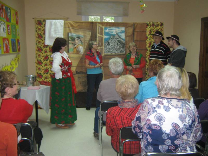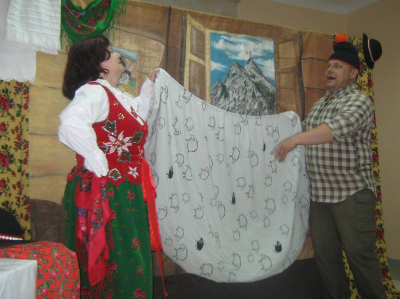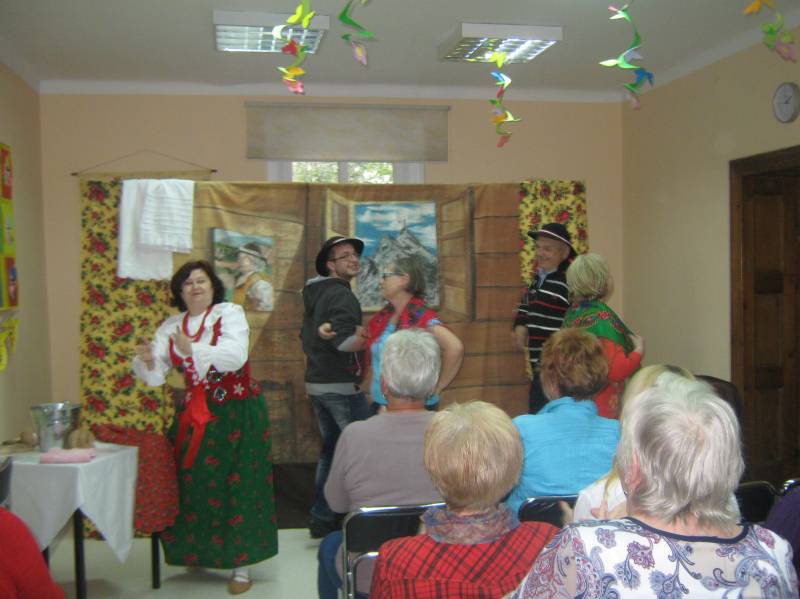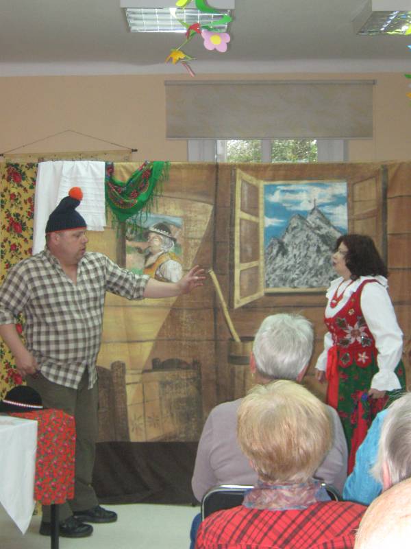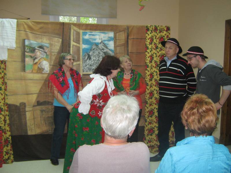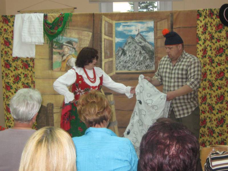Opowieść była przeplatana dowcipami, przyśpiewkami, piosenkami góralskimi, które aktorzy chętnie śpiewali wraz z publicznością liczącą pięćdziesięcioro seniorów.