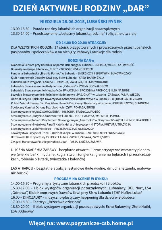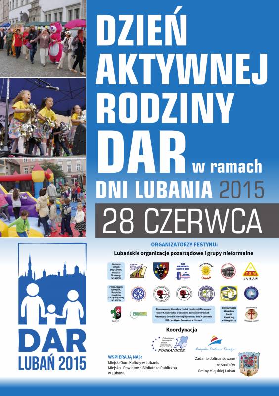 W niedzielę 28 czerwca 2015 r. zapraszamy do udziału w Dniu Aktywnej Rodziny – dniu aktywności, zabawy i integracji. Na najmłodszych mieszkańców Lubania czekać będzie mnóstwo atrakcji m.in. zjeżdżalnie, wodne kule, trampoliny, warsztaty artystyczne, postacie z bajek, programy animacyjne i pokazy.
