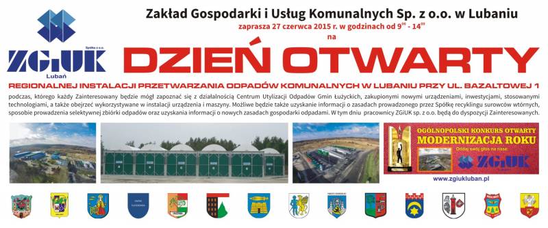 Zakład Gospodarki i Usług Komunalnych Sp. z o.o w Lubaniu zaprasza 27 czerwca br. na DZIEŃ OTWARTY Regionalnej Instalacji Przetwarzania Odpadów Komunalnych w Lubaniu, podczas którego każdy będzie mógł się zapoznać z działalnością Centrum Utylizacji Gmin Łużyckich, zakupionymi urządzeniami, inwestycjami, stosowanymi technologiami.