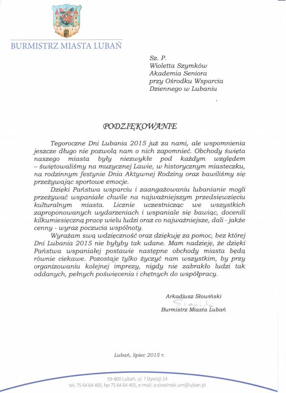 Akadami Seniora dołożył wszelkich starań do wspólnego budowania integracji społecznej, podczas tegorocznego „Dnia Aktywnej Rodziny”, który odbywał się na lubańskim rynku i organizowany był przez lubańskie organizacje oraz Stowarzyszenie Południowo- Zachodniego Forum Samorządu Terytorialnego "Pogranicze" w Lubaniu. Wspólne działania zostały zauważone i docenione, za co serdecznie dziękujemy.