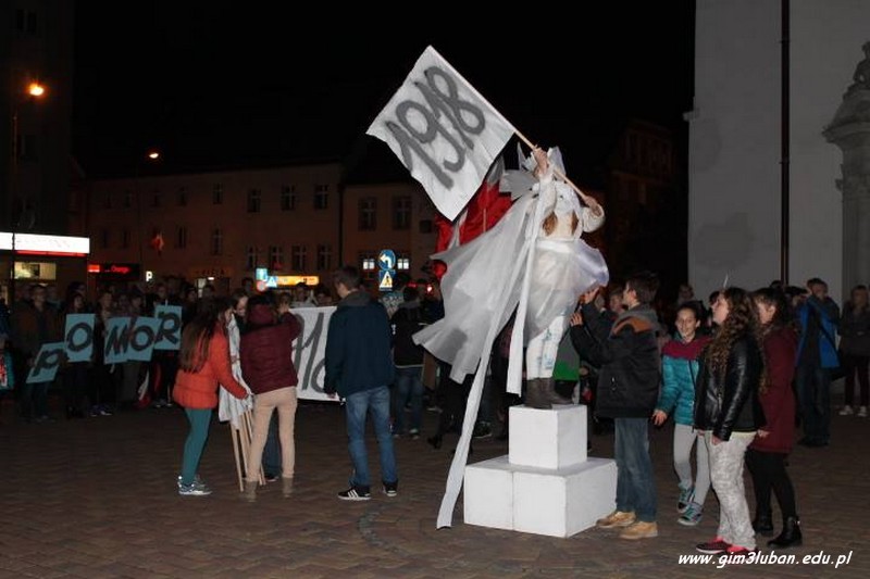 10 listopada o godz. 17.00 na placu pod Ratuszem pojawił się Burmistrz, pan Arkadiusz Słowiński, by w kilku zdaniach zainaugurować widowisko, które przy  dźwiękach  pieśni „Niepodległa, niepokorna” młodzież zaczęła spontanicznie „montować” na oczach widzów. Pusty dotąd plac przy fontannie stał się umowną mapą Europy, w centrum której z błękitnego światła wyłonił się najpierw Anioł Wolności. Wzniesienie przez niego białej flagi z napisem „1918” stało się sygnałem do rozpoczęcia po 123 latach niewoli narodowej procesu odradzania się Rzeczpospolitej.