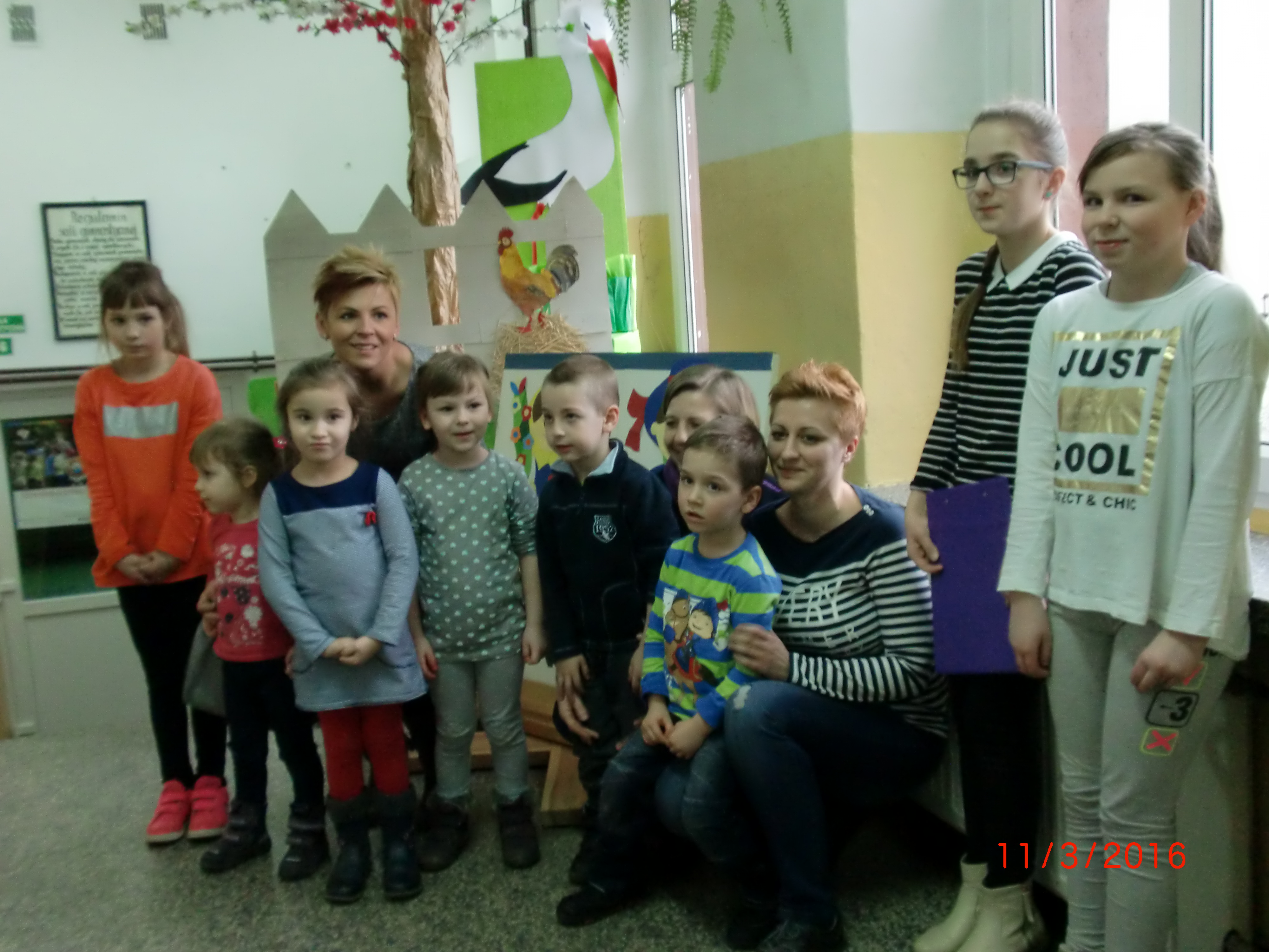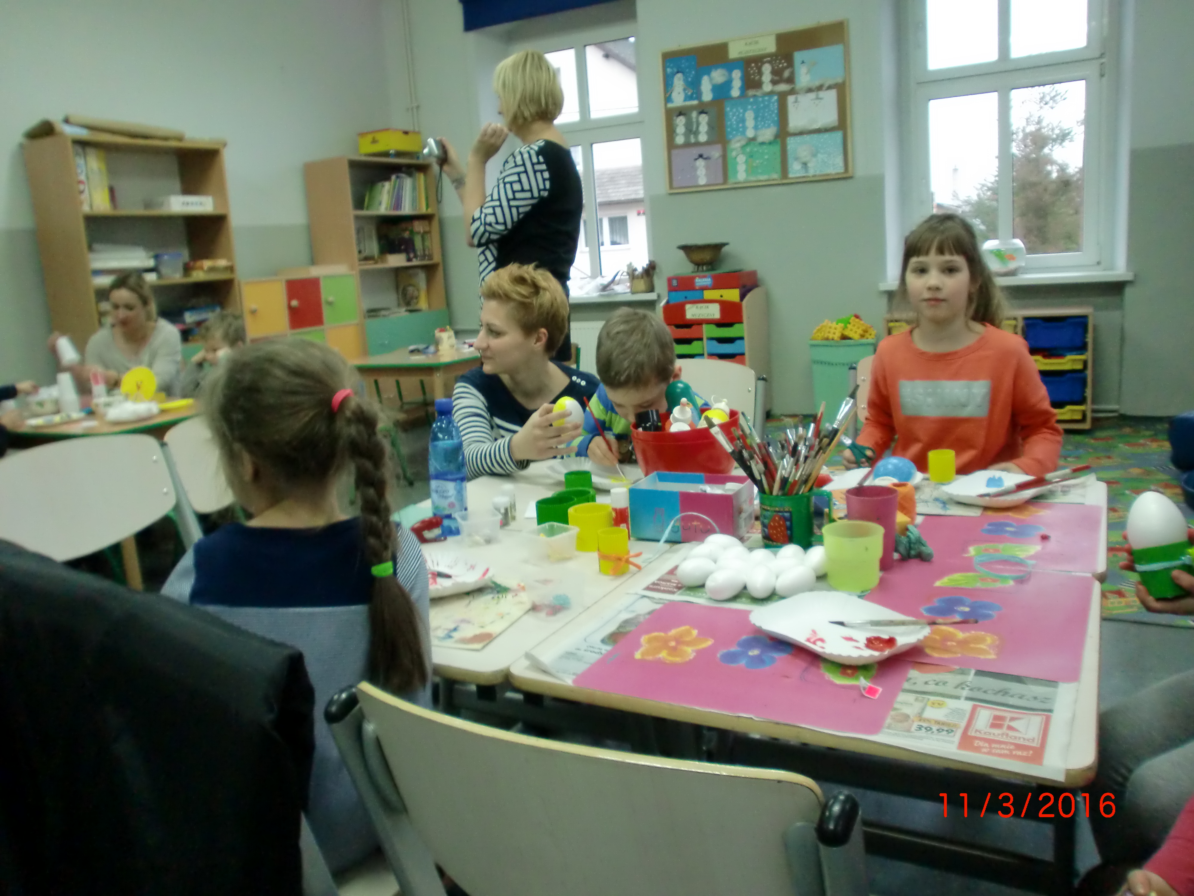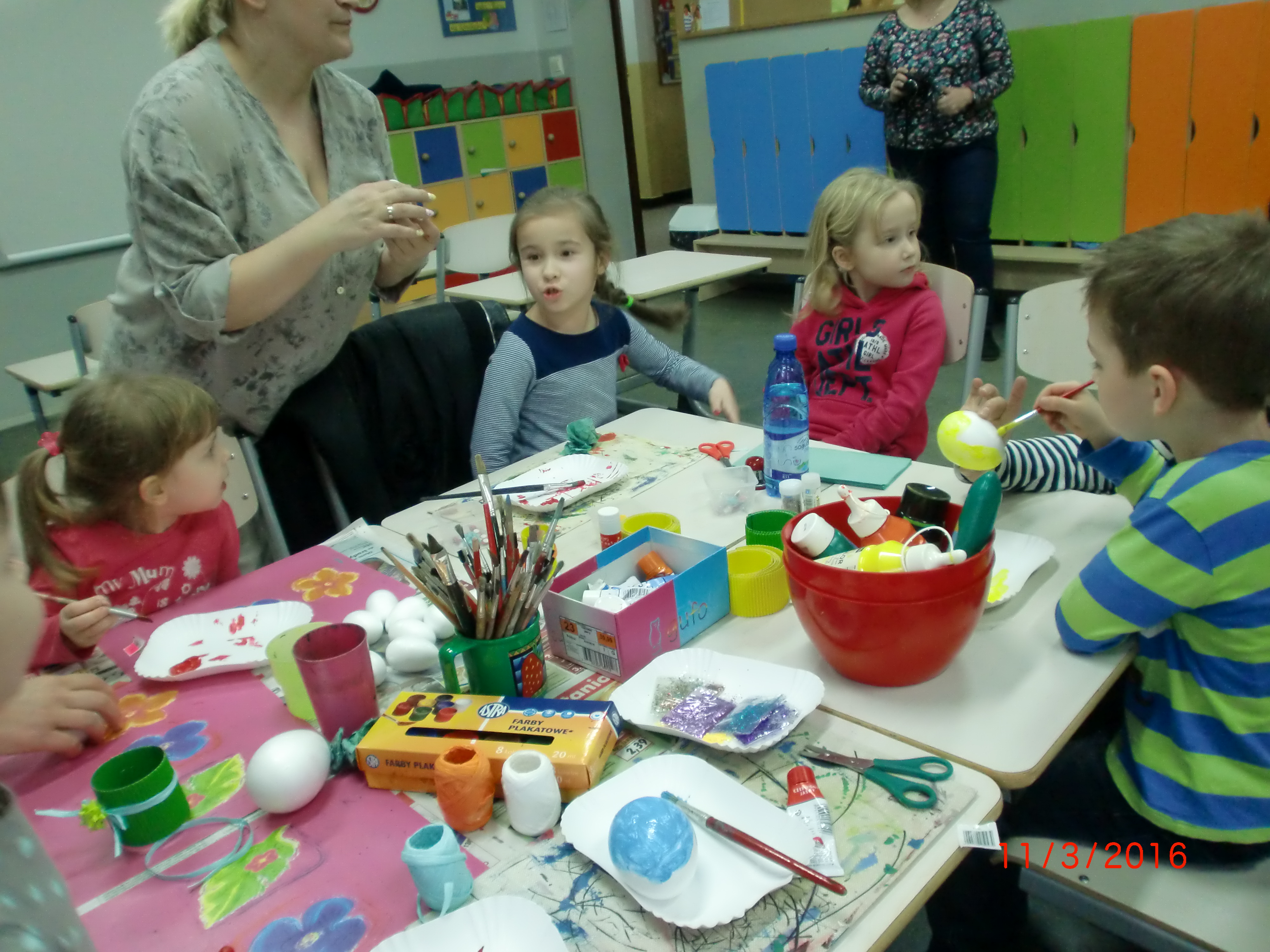 Kolejnym zadaniem tegorocznych świątecznych przygotowań, były warsztaty plastyczno-techniczne dla maluchów i przedszkolaków, przygotowane przez nauczycieli edukacji wczesnoszkolnej. Zajęcia obejmowały: malowanie i ozdabianie pisanek, wycinanie i składanie papierowych ,,Koszyczków – kurek”, kolorowanie wielkanocnych witraży oraz zajęcia muzyczno-ruchowe z wesołym torem przeszkód. Dla zwycięzców sportowych potyczek były słodkie jajeczka. Przedszkolaki nie tylko wytrwale pracowały, ale również poznały szkołę i były bardzo dociekliwe podczas poznawania klas lekcyjnych, w których uczą się dzieci.