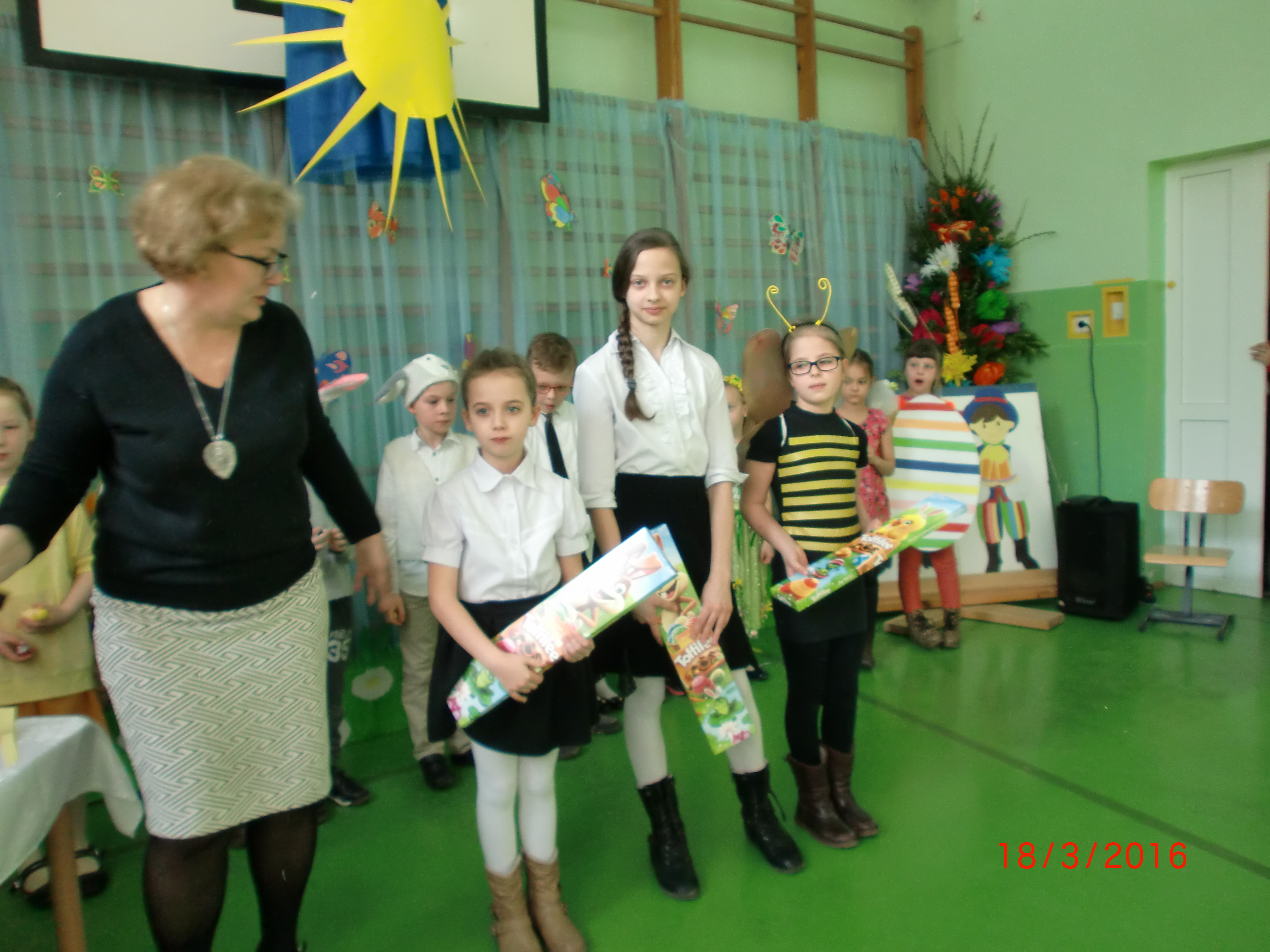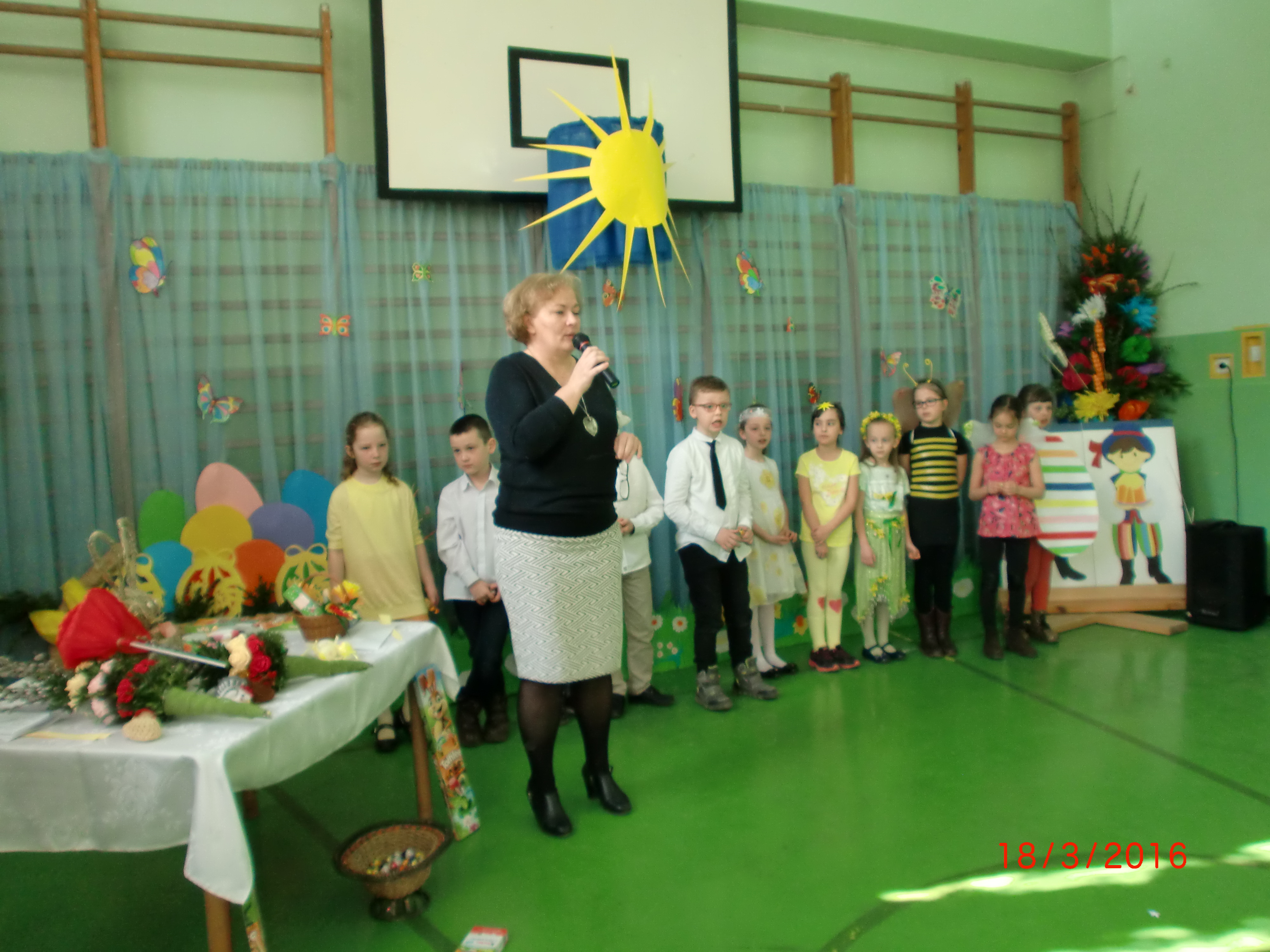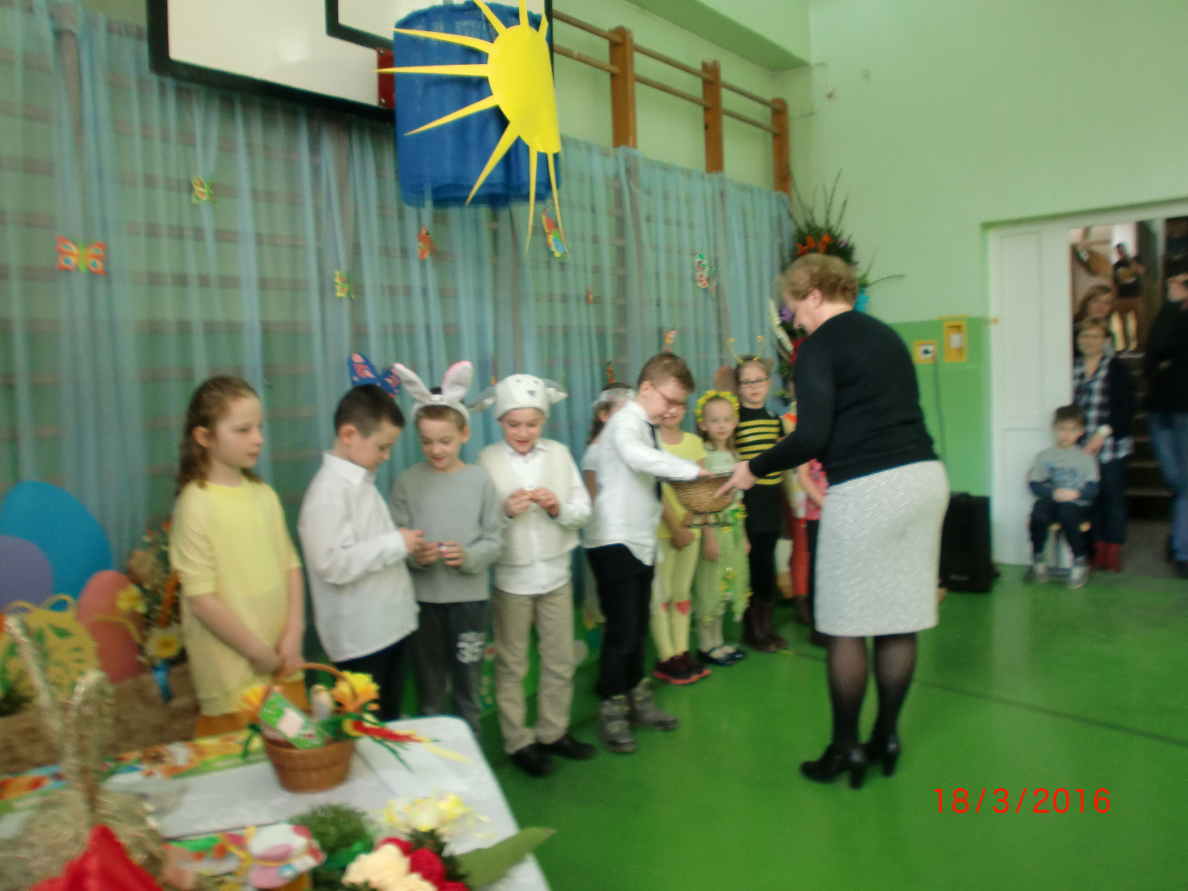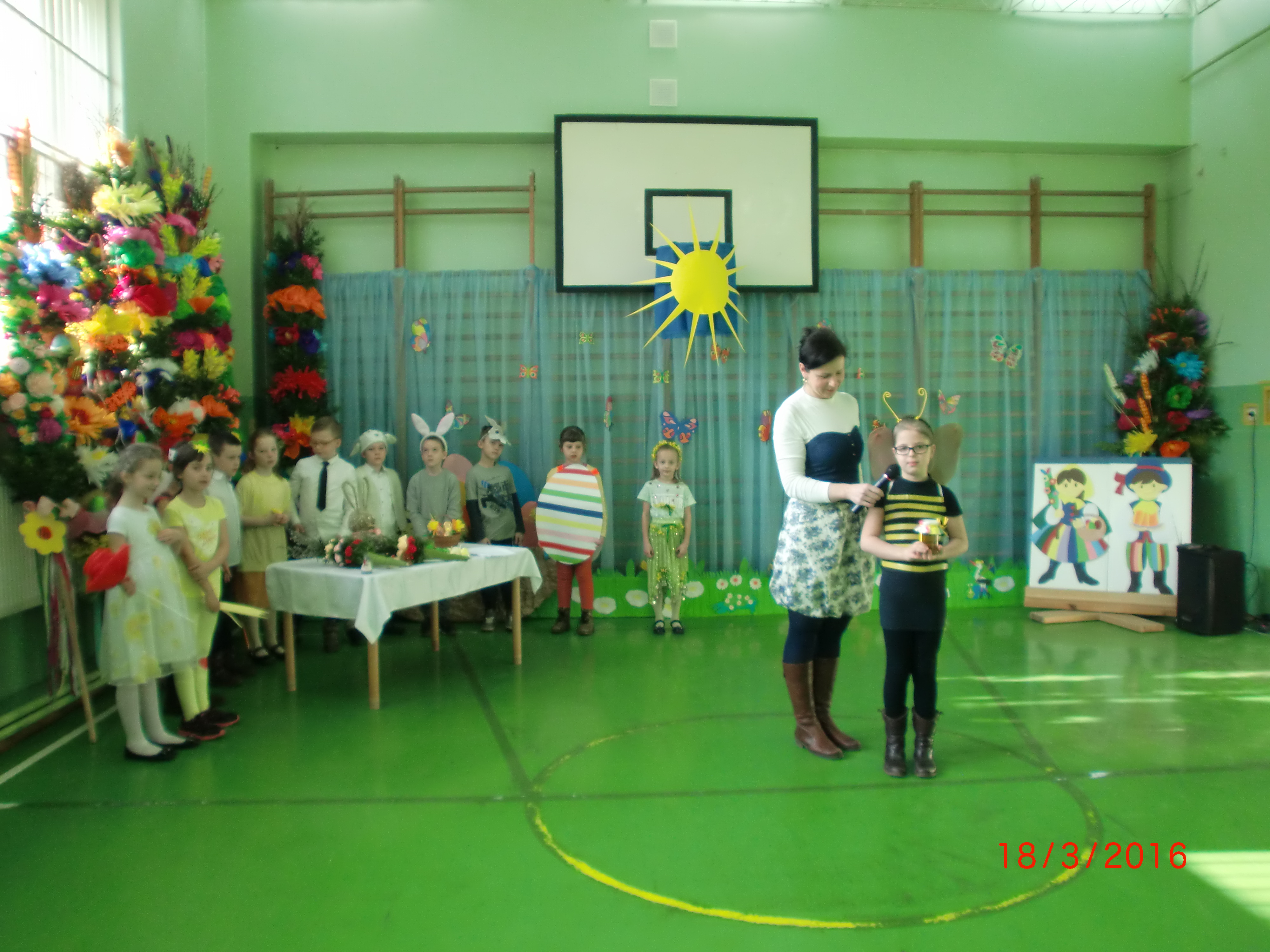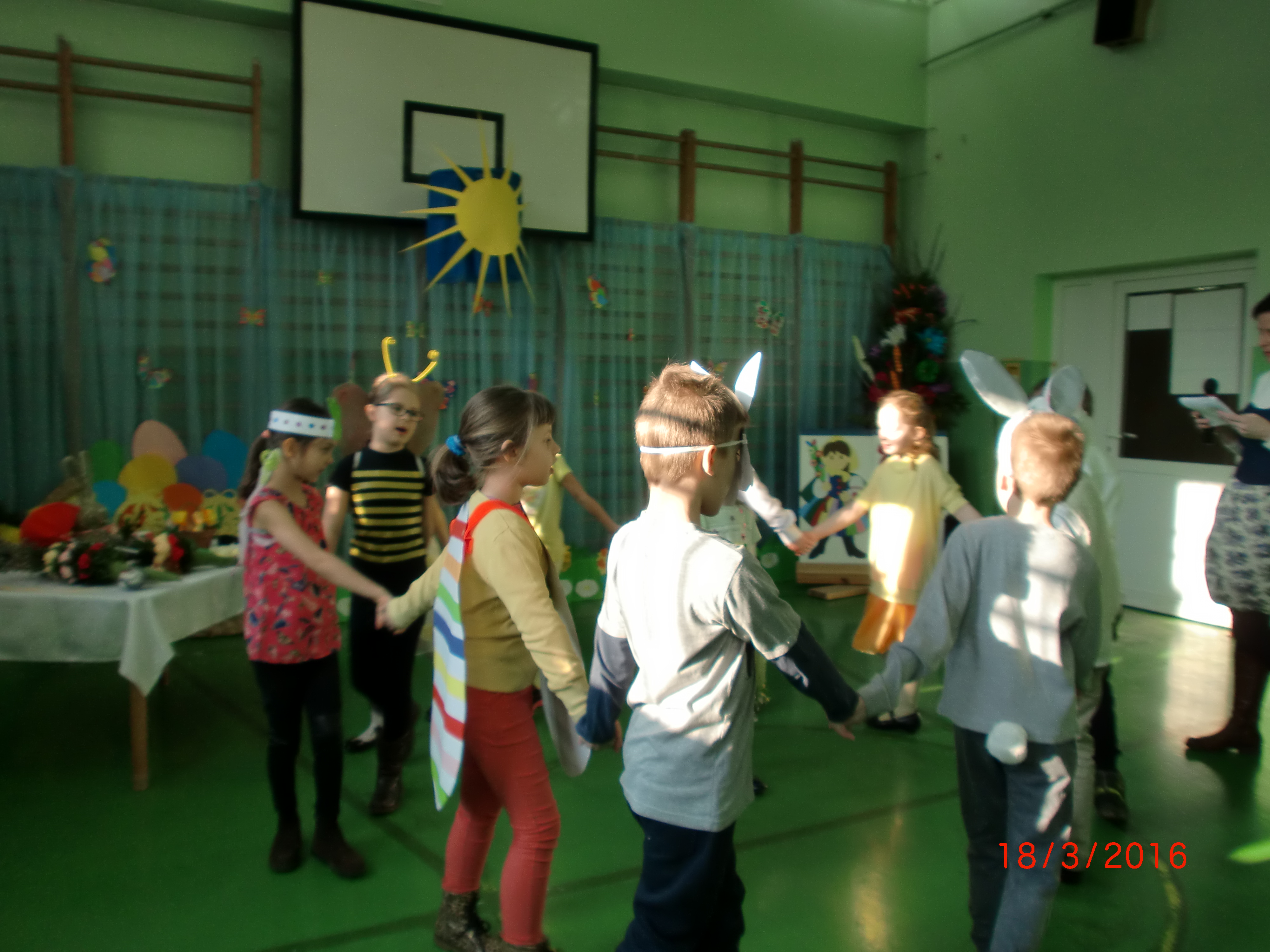 Zakończeniem i posumowaniem całego projektu, był apel w dniu 18.03.16.Tegoroczny wiosenno-świąteczny program artystyczny pod tytułem ,,Wiosna już, a Wielkanoc tuż, tuż” przygotowała klasa 1b wraz z wychowawcą Wandą Czarnotą. Na pierwszym dużym występie maluchów, spotkała się cała społeczność szkolna oraz rodzice. Dzieci wspaniale odgrywały swoje role i były do nich przygotowane mając odpowiednie przebranie lub rekwizyty danej roli. Na zakończenie spotkania dyrektor szkoły Małgorzata Nir, podsumowała szkolny konkurs: ,,Mała palma”, nagradzając i wyróżniając twórców małych palm wielkanocnych.