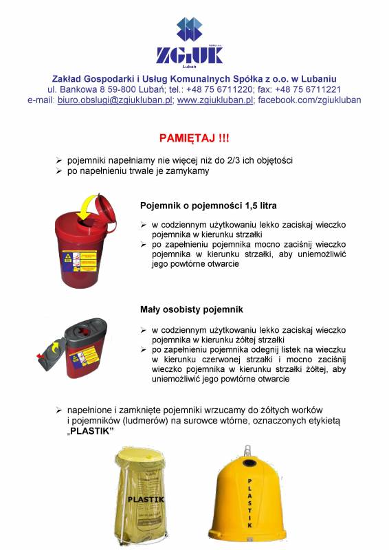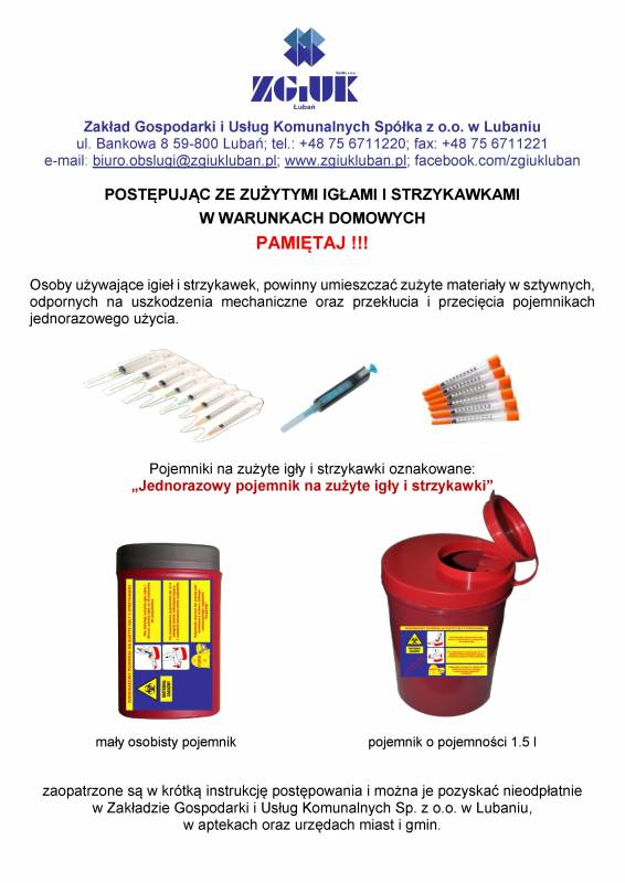 Zakład Gospodarki i Usług Komunalnych Spółka z o. o. w Lubaniu celem zapewnienia bezpieczeństwa zarówno dla mieszkańców jak i pracowników naszego zakładu, jako jeden z pierwszych w Polsce, wprowadza procedurę bezpiecznego pozbywania się przez mieszkańców zużytych igieł i strzykawek.
