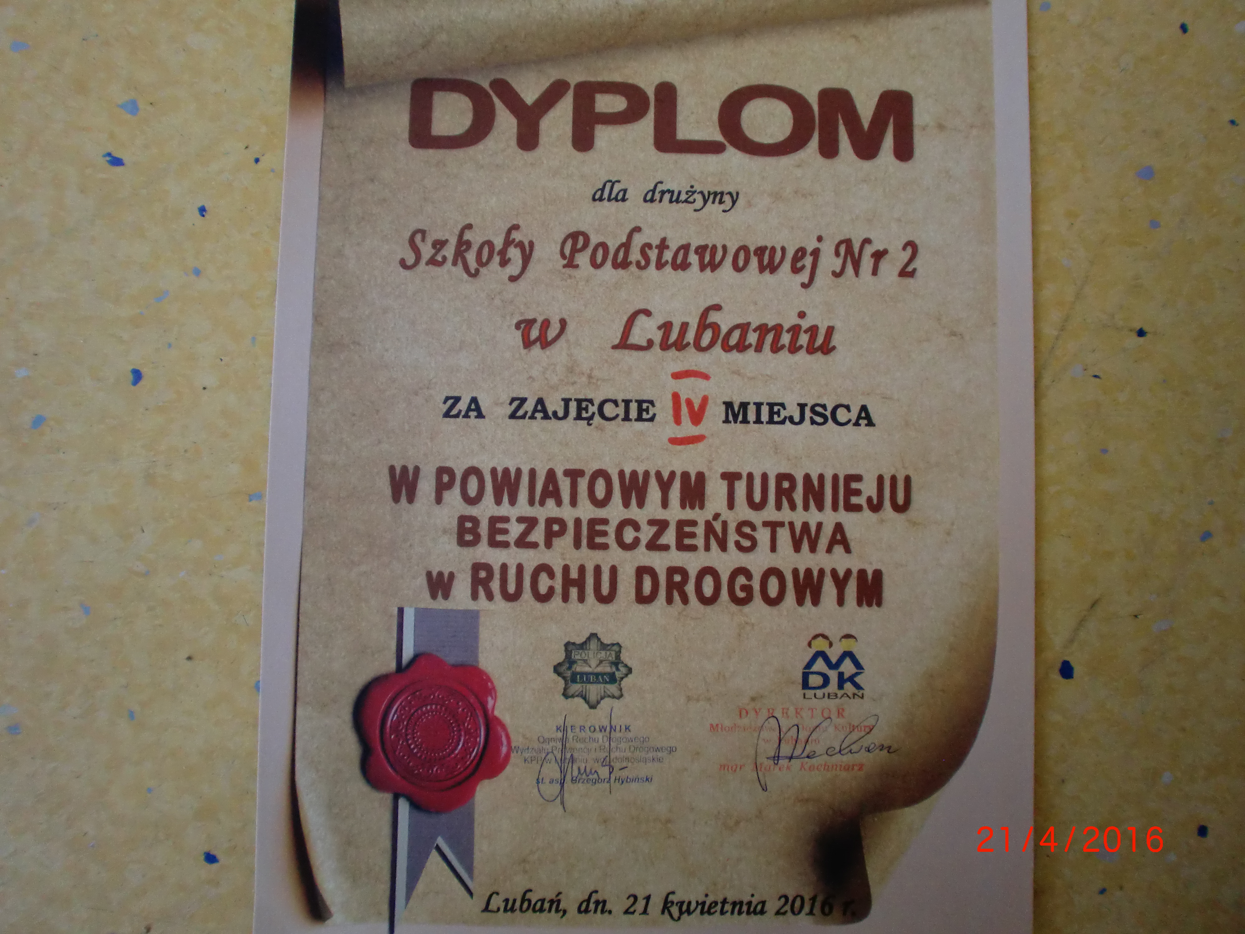Szkołę Podstawową nr 2 w Lubaniu, reprezentowała drużyna uczniów kl. 6 w składzie: Alicja Grabowska, Natalia Korycka, Mikołaj Wiaderek, Łukasz Mazur. Opiekunem i nauczycielem przygotowującym do turnieju była Wanda Czarnota. Na 10 startujących drużyn z powiatu lubańskiego, drużyna SP2 zajęła 4 miejsce. Gratulujemy drużynie, gdyż wykazali się dużymi umiejętnościami i wiedzą z zakresu wychowania komunikacyjnego