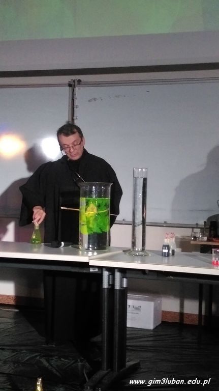 Ostatni wykład połączony z pokazem był najbardziej spektakularny i odbył się na Wydziale Chemii Uniwersytetu Wrocławskiego. „Odlotowa chemia” w wykonaniu dr Andrzeja Vogta oraz jego asystentek- Joanny Czyżo i Zuzanny Kruk- rozpoczęła się bardzo tajemniczo. Prowadzący wprowadzili w nastrój poprzez przebranie się za czarodzieja i jego pomocników. Następnie przedstawili wiele eksperymentów, które były szczegółowo omawiane pod kątem zastosowania w różnych dziedzinach życia. Gimnazjaliści odpowiadali także na pytania prowadzącego oraz zdobywali drobne upominki.