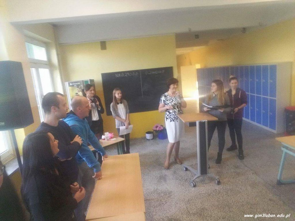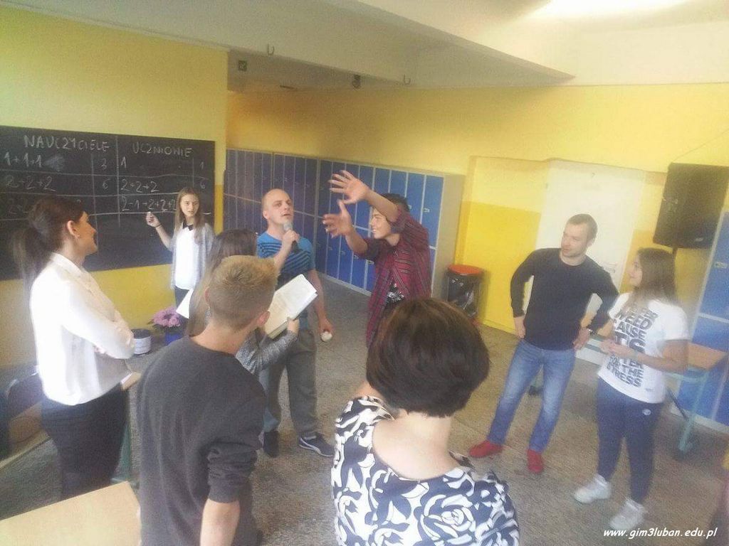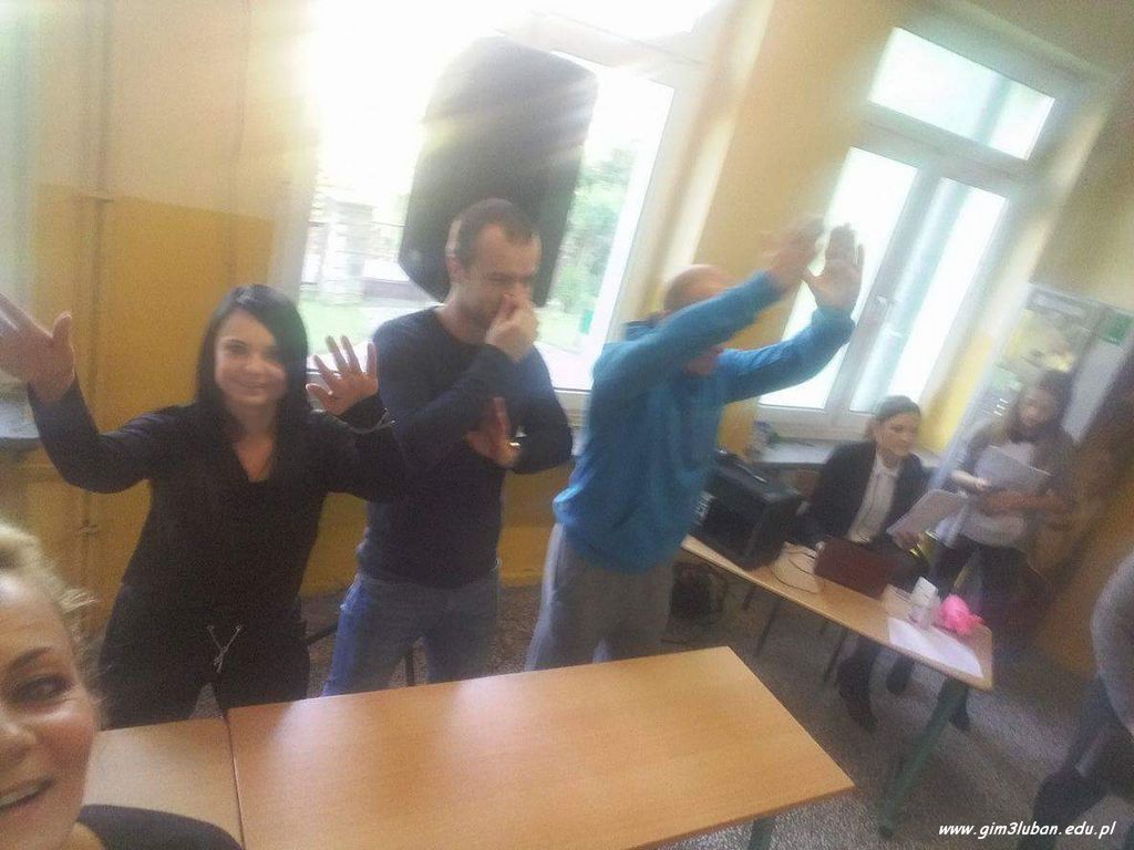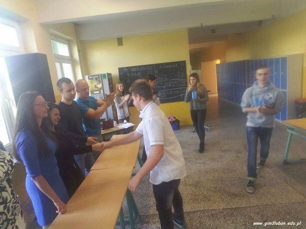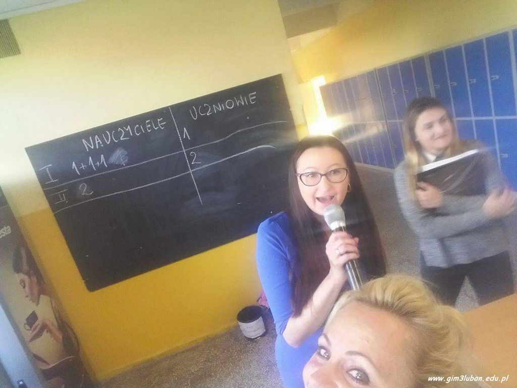 Po krótkich, ale bardzo przyjemnych spotkaniach z wychowawcami klas, uczniowie zgromadzili się na parterze szkoły, aby stanąć w szranki z nauczycielami., Kocham Cię szkoło” to motyw przewodni zabawy sprawdzającej wiedzę na temat gimnazjum. Było śpiewnie, tanecznie i bardzo wesoło. Rywalizację wygrali nauczyciele! To, odwet” za ubiegły rok – uczniowie wówczas wykazali się niebywałą sprawnością fizyczną i odnieśli sukces w zawodach sportowych.