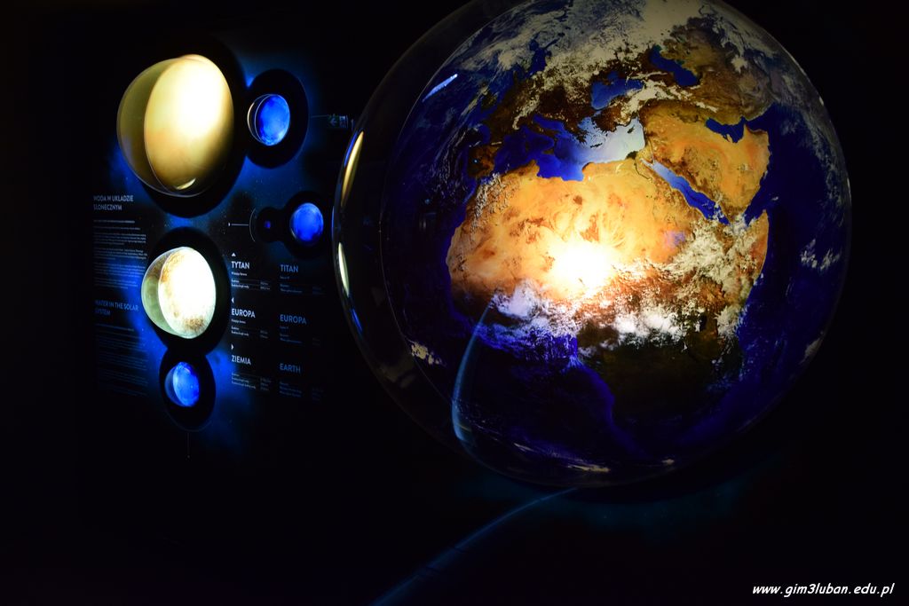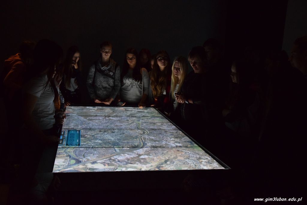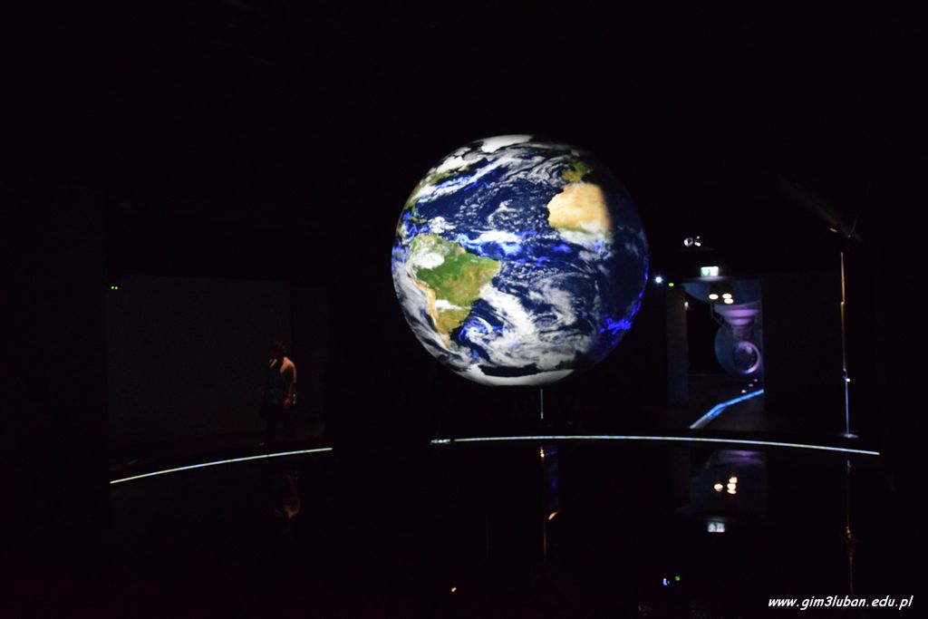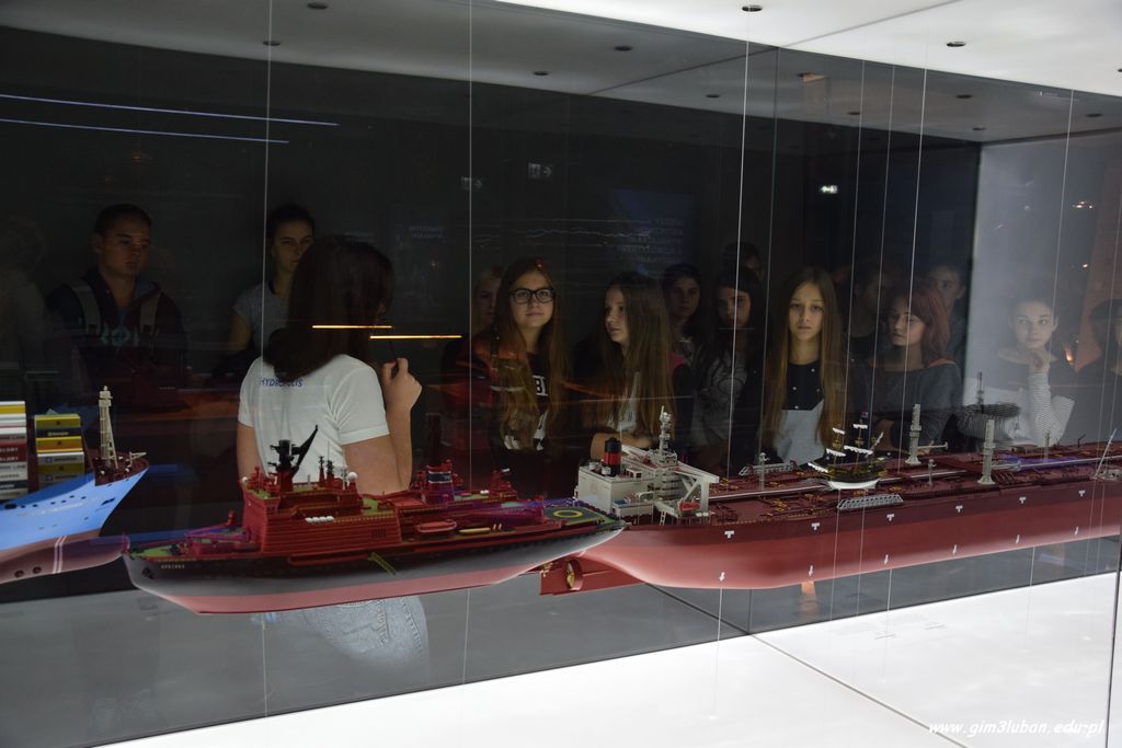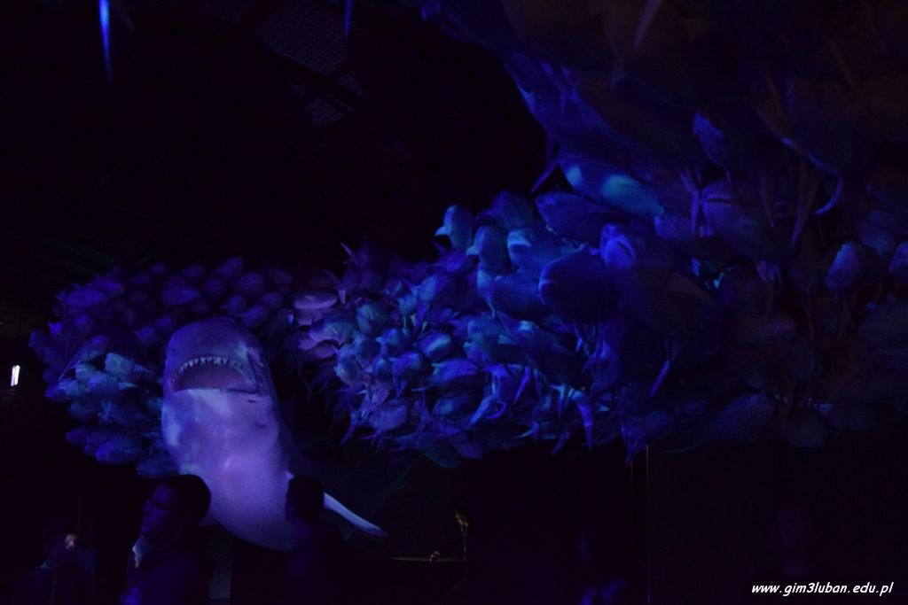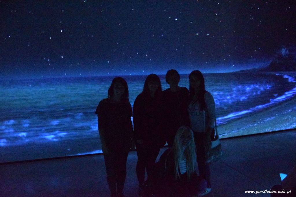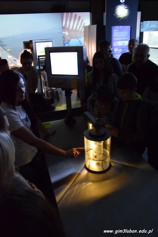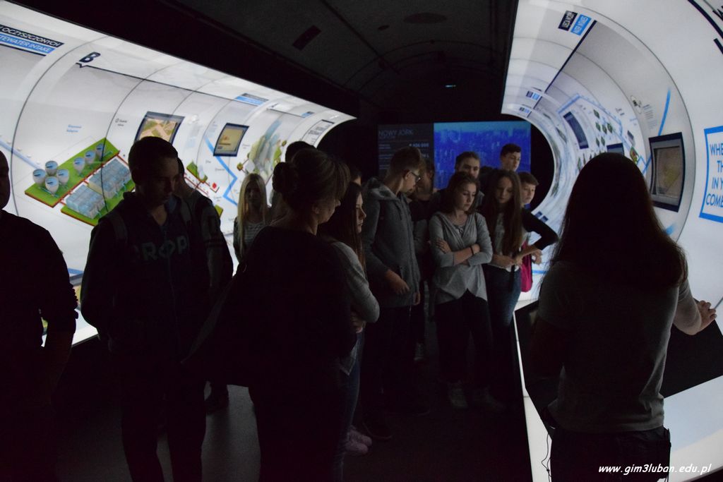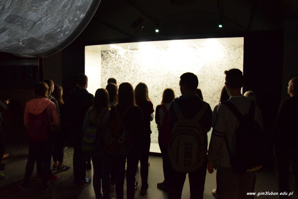 Pierwszym punktem wycieczki było HYDROPOLIS- jedyne w Polsce centrum wiedzy o wodzie. Już samo położenie wystawy jest interesujące, ponieważ znajduje się ona w XIX- wiecznym podziemnym zbiorniku czystej wody o powierzchni 4000 m2. Wystawę podzielono na osiem stref tematycznych. W każdej z nich woda jest przedstawiona z innego, fascynującego ujęcia. Zrozumienie znaczenia wody jest bardzo potrzebne w czasach, kiedy wiele miejsc na Ziemi jej nie ma. Dlatego uczestnicy wycieczki z wielką uwagą słuchali osoby oprowadzającej po Hydropolis. Niemałe wrażenie na gimnazjalistach zrobił seans 360°– niezwykła opowieść o początkach wody. Uczniowie przenieśli się w najodleglejsze zakamarki kosmosu. Kolejna część wystawy „Głębiny” zainteresowała nie tylko ze względu na replikę batyskafu „Trieste II”, ale także dlatego, że gimnazjaliści poznali niezwykły świat bioluminescencji stworzeń ukrywających się na dużych głębokościach. „Ocean życia”, „Strefa relaksu”, „Człowiek i woda”, „Miasto i woda”, „Historia inżynierii wodnej”, „Stany wody” to kolejne punkty wystawy, które obfitowały w „żywą” wiedzę. A do tego wszystkiego, można było ją zgłębiać jeszcze bardziej, ponieważ na terenie całej wystawy była możliwość skorzystania z HYDROPEDII- multimedialnego zbioru artykułów popularnonaukowych, które rozszerzają tematykę podejmowaną na wystawie.