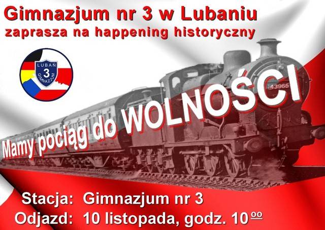 10 listopada (czwartek), godz. 10.00 - happening historyczny "Mamy pociąg do wolności" w Gimnazjum nr 3 w Lubaniu.