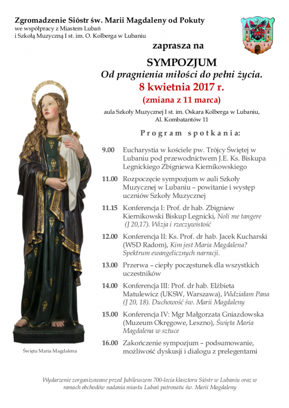 Zgromadzenie Sióstr św. Marii Magdaleny od Pokuty informuje o zmianie terminu sympozjum "Od pragnienia miłości do pełni życia" z 11 marca na 8 kwietnia.