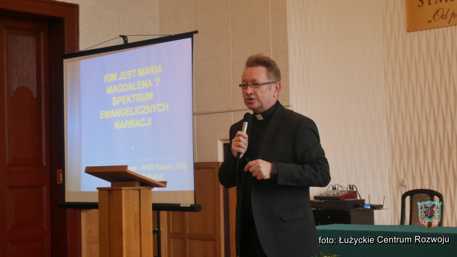 Następnym prelegentem był ks. dr Jacek Kucharski, wykładowca WSD w Radomiu i wieloletni przewodnik po krajach biblijnych, który przedstawił temat- „Kim jest Maria Magdalena? Spektrum ewangelicznych narracji”. Porównując opisy dotyczące postaci Magdaleny w Ewangeliach ukazał te aspekty jej życia, które z pewnością na podstawie źródeł naukowych są możliwe do potwierdzenia. Z tego wywodu jasno wynika, że Magdalena to ta, z której Jezus wypędził siedem złych duchów. Potem spotykamy ją w gronie innych kobiet jako tę, która usługuje Mistrzowi i uczniom głoszącym w Galilei nowinę o Królestwie Bożym. Jest ona obecna pod krzyżem Pana i przy grobie w czasie Jego pogrzebu i w poranek wielkanocny spotyka Zmartwychwstałego, od którego otrzymuje misję głoszenia prawdy, że Jezus żyje. Ksiądz dr Jacek Kucharski rozwiał tym samym wszelkie wątpliwości, które na zasadzie „odgrzewania kotleta” próbuje nam co jakiś czas przemycić współczesna literatura „pseudo-faktu” czy nowinkarskie doniesienia o odkryciach rzekomych „nowych źródeł”, które są niczym innym, jak pismami apokryficznymi, dobrze znanymi Kościołowi pierwszych wieków. Nie zostały jednak włączone do kanonu ksiąg świętych, bo nie posiadały umocowania w Tradycji.