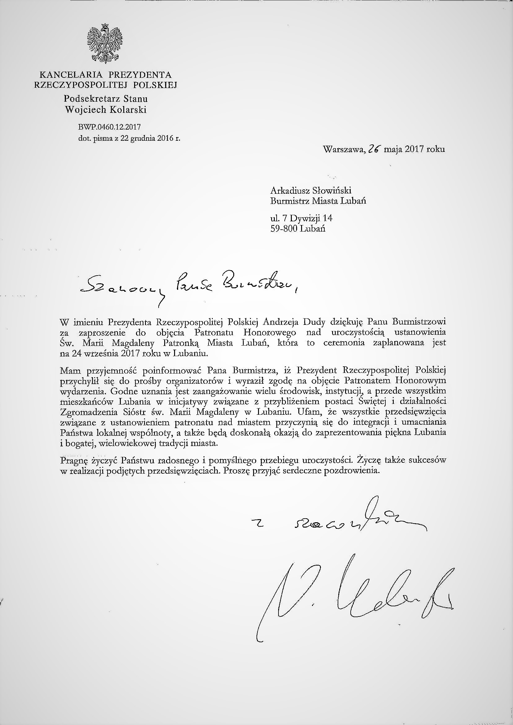„Mam przyjemność poinformować Pana Burmistrza, iż Prezydent Rzeczypospolitej Polskiej przychylił się do prośby organizatorów i wyraził zgodę na objęcie Patronatem Honorowym wydarzenia. Godne uznania jest zaangażowanie wielu środowisk, instytucji, a przede wszystkim mieszkańców Lubania w inicjatywy związane z przybliżeniem postaci Świętej i działalności Zgromadzenia Sióstr św. Marii Magdaleny w Lubaniu. Ufam, że wszystkie przedsięwzięcia związane  z ustanowieniem patronatu nad miastem przyczynią się do integracji i umacniania Państwa lokalnej wspólnoty, a także będą doskonałą okazją do zaprezentowania piękna Lubania i bogatej, wielowiekowej tradycji miasta."