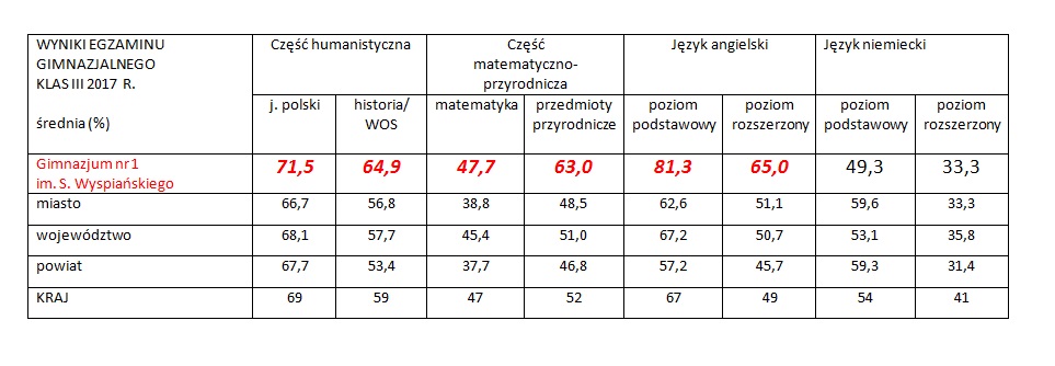 W bieżącym roku uzyskane przez uczniów wyniki egzaminu gimnazjalnego znacznie przewyższają średnie wyniki miasta, powiatu i województwa.