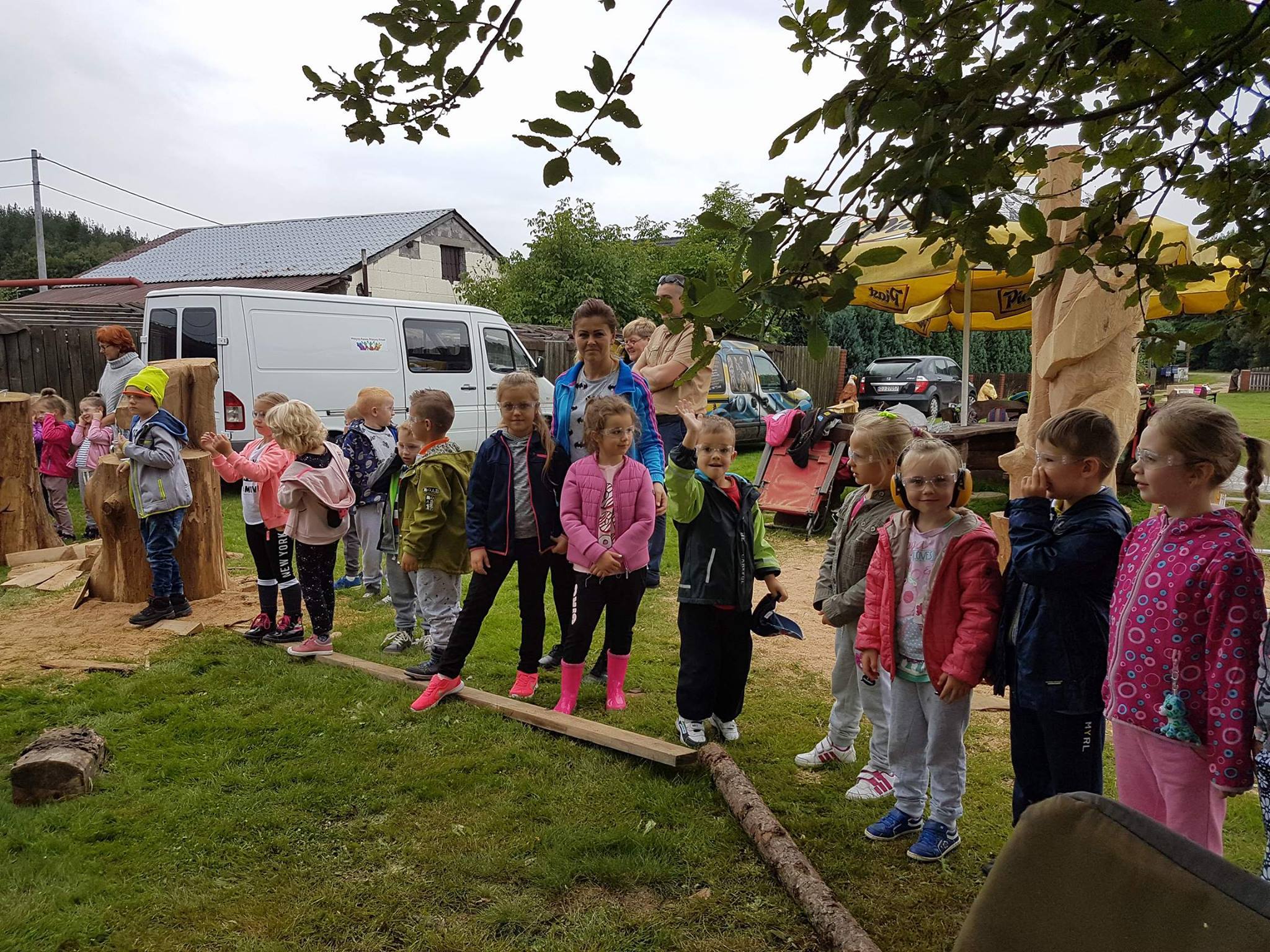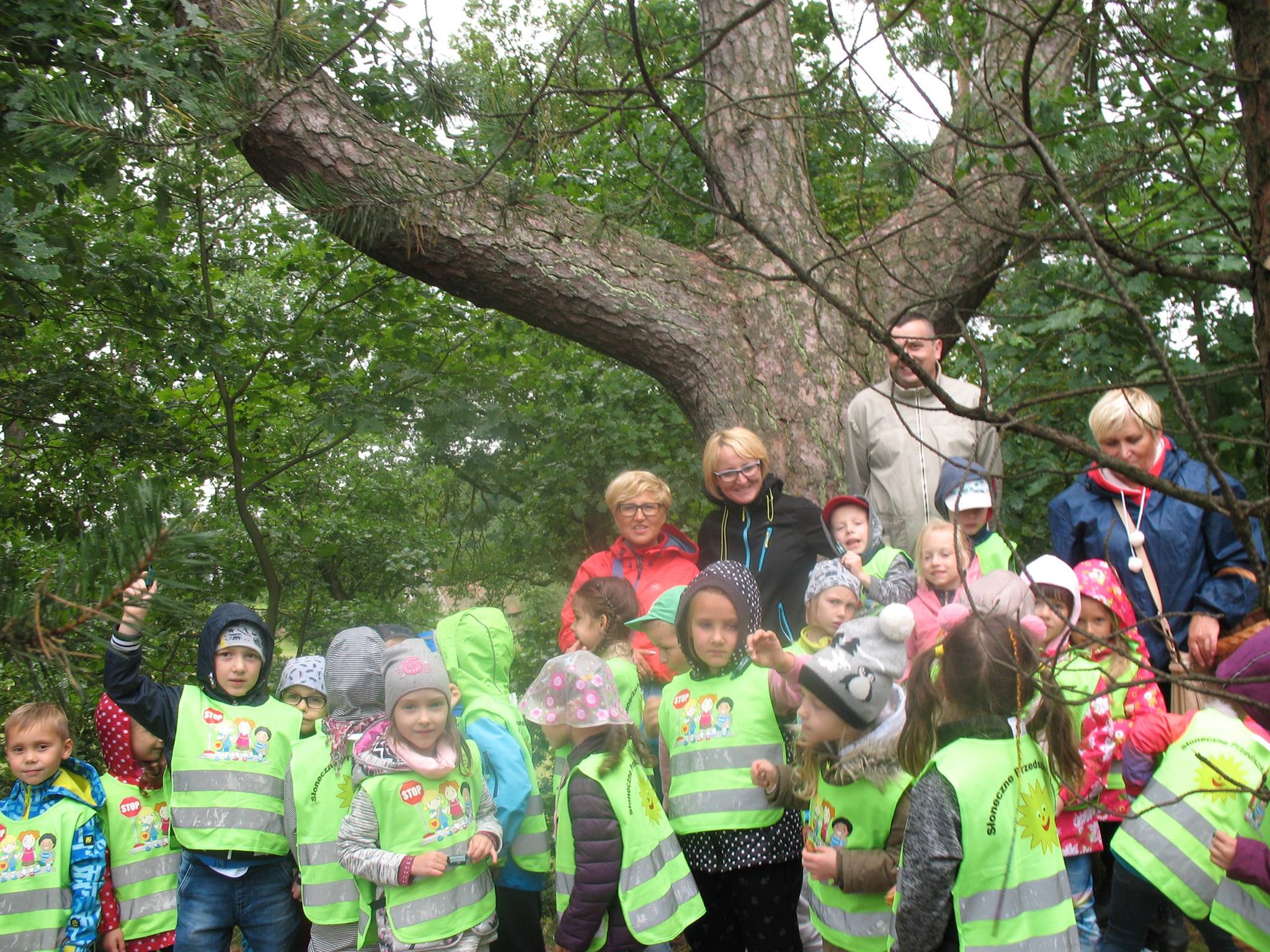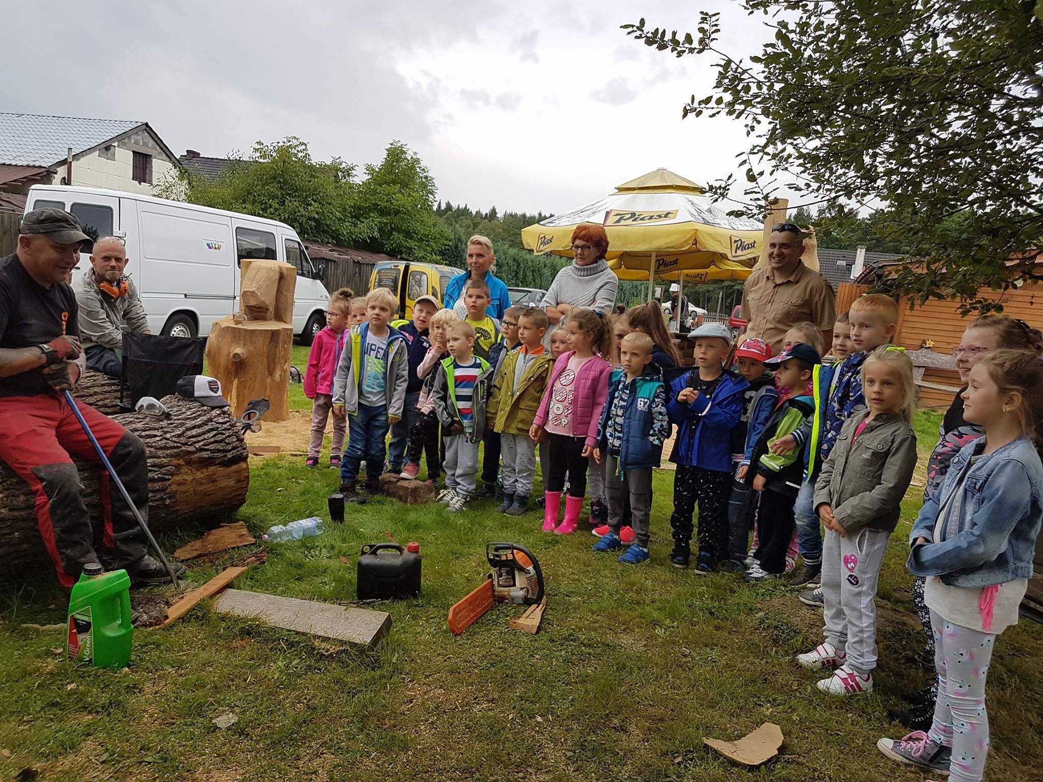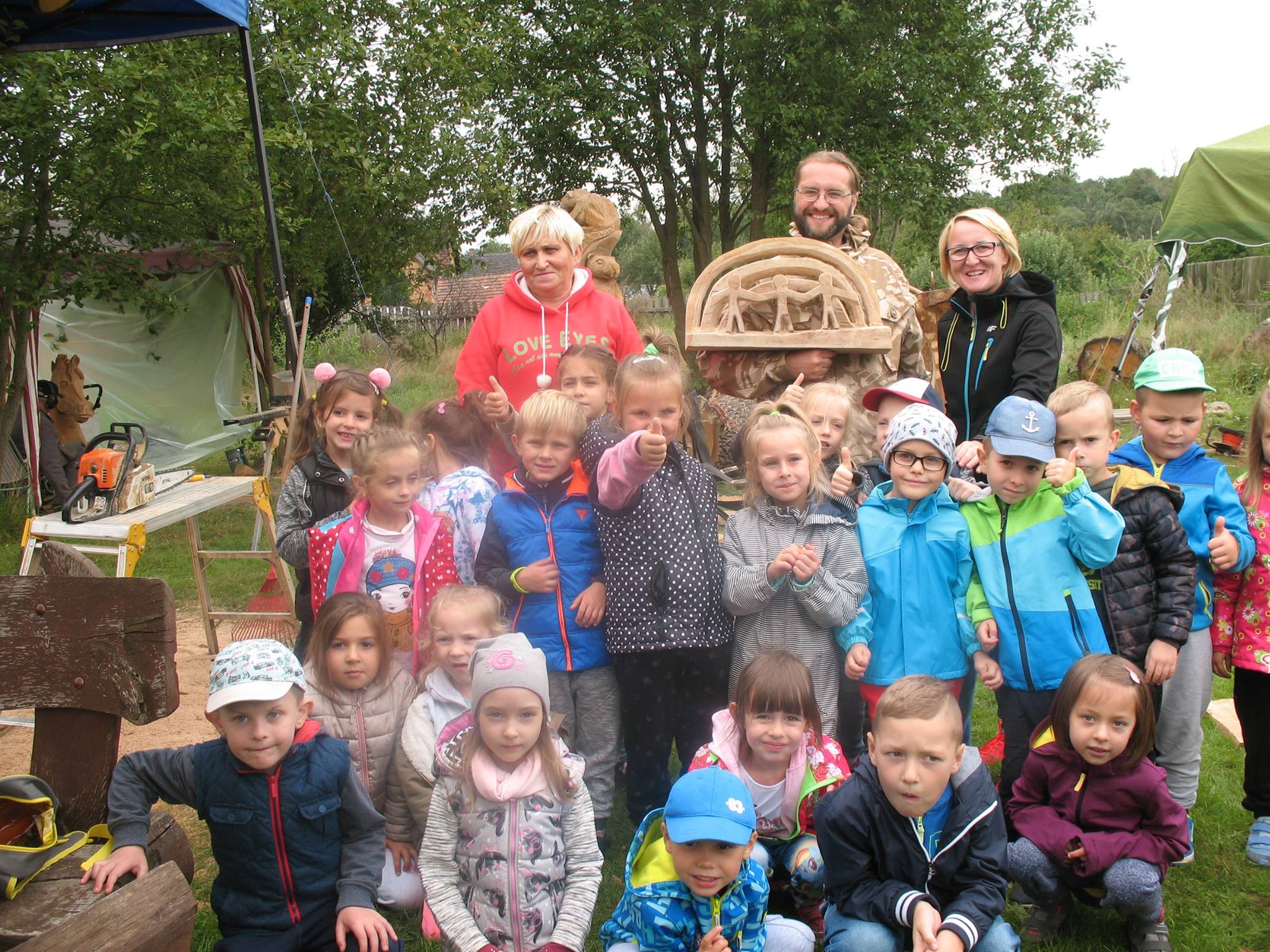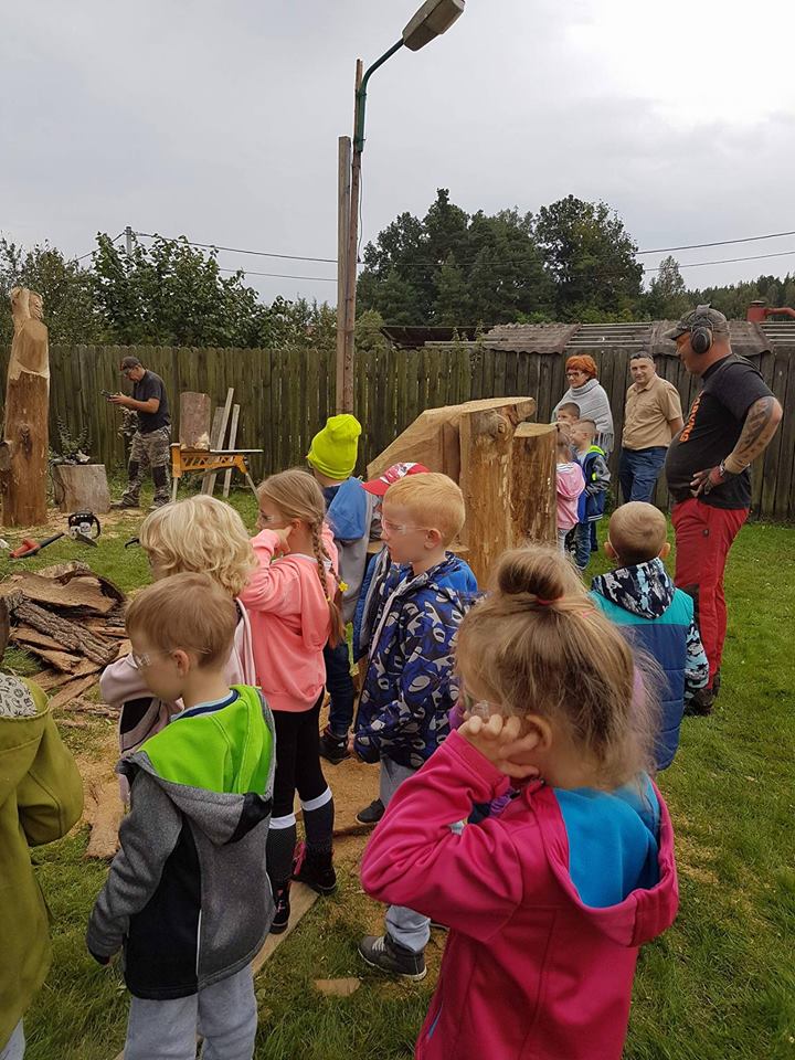 Na początku wycieczki uczestniczyliśmy w pokazie artystycznego cięcia piłą w pniach drzewa. Było to bardzo emocjonujące przeżycie. Panowie tworzyli dzieła, a my nie mogliśmy się napatrzeć. Następnie z miłą Panią Małgosią tworzyliśmy kwiaty ze słomy, nasze rączki troszkę się napracowały. AAAle to nie wszystko, Pan Piotr - tatuś Tomka przygotował dla nas zajęcia z edukacji leśnej. Zapoznał nas z tropami zwierząt leśnych oraz drzewami występującymi w naszych lasach. Wyruszyliśmy do lasu. Było bardzo ciekawie. Las odkrył przed nami swoje tajemnice, a my szukaliśmy występujących w nim roślin, drzew oraz zamieszkujących go owadów. Podczas spaceru znaleźliśmy nawet "magiczne drzewo", które obdarowało nas cukierkami .Oj radość była ogromna!