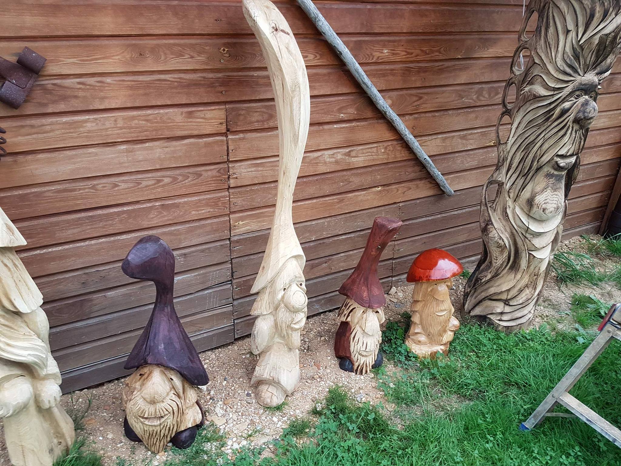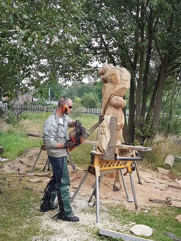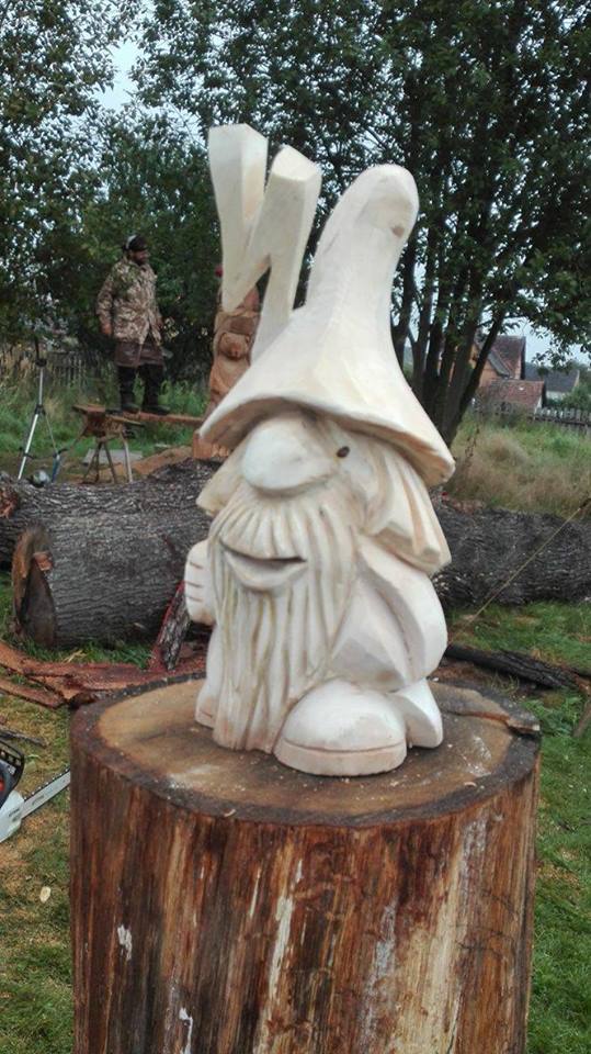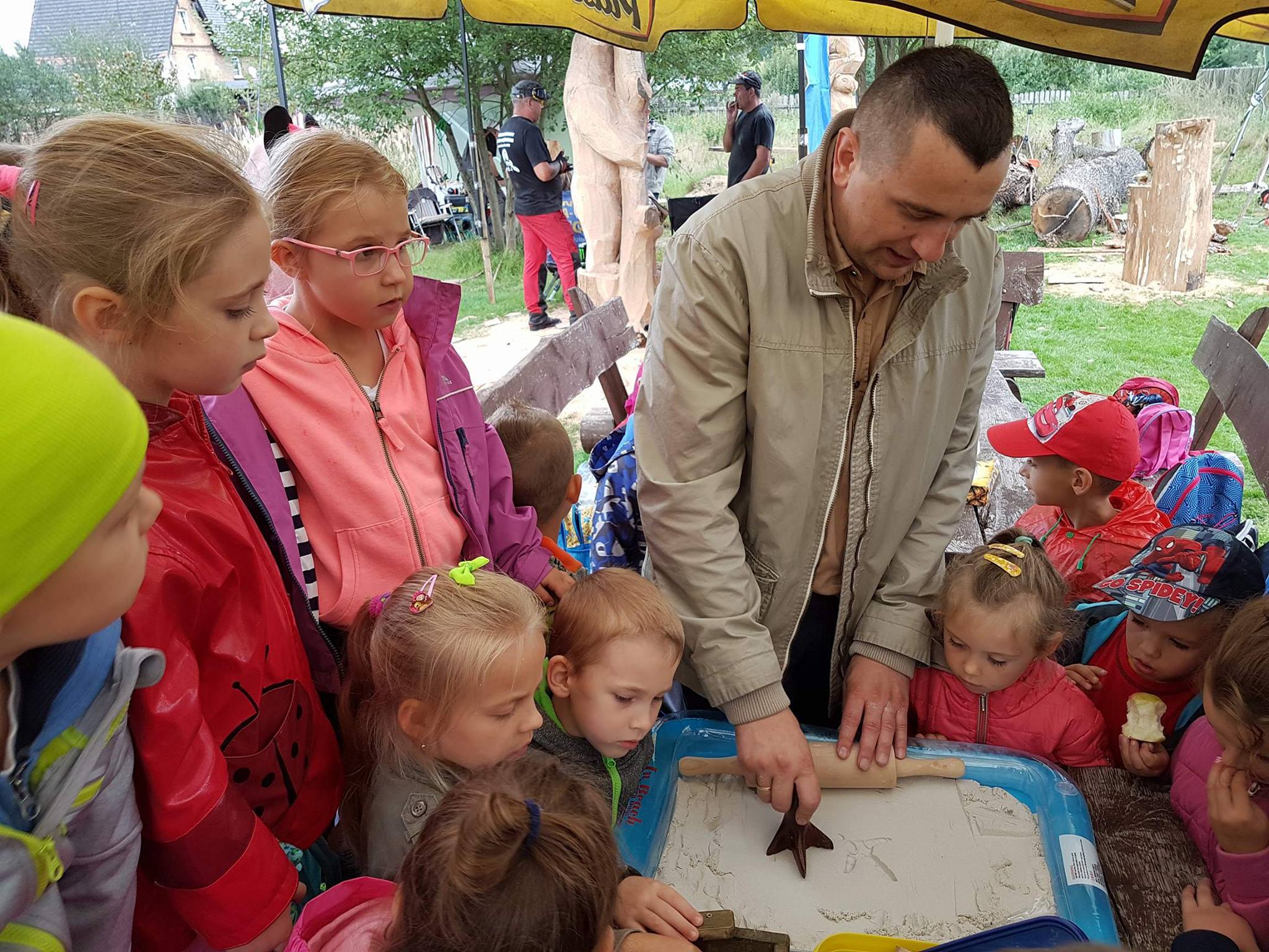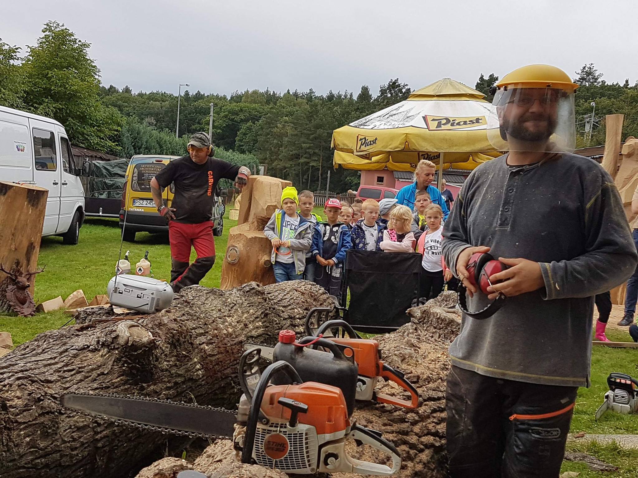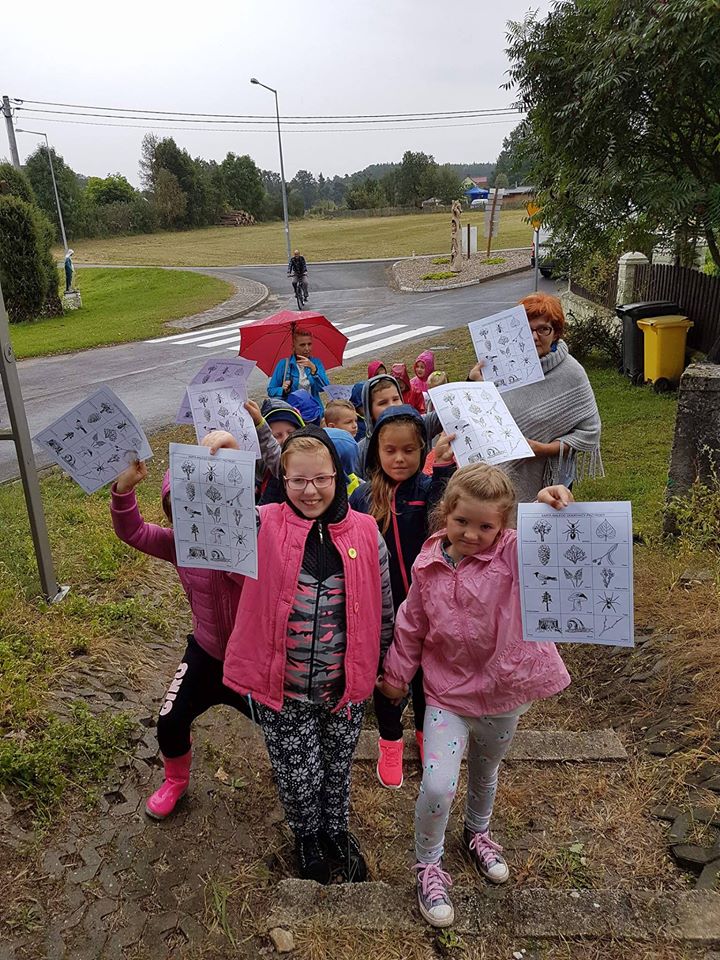 Na początku wycieczki uczestniczyliśmy w pokazie artystycznego cięcia piłą w pniach drzewa. Było to bardzo emocjonujące przeżycie. Panowie tworzyli dzieła, a my nie mogliśmy się napatrzeć. Następnie z miłą Panią Małgosią tworzyliśmy kwiaty ze słomy, nasze rączki troszkę się napracowały. AAAle to nie wszystko, Pan Piotr - tatuś Tomka przygotował dla nas zajęcia z edukacji leśnej. Zapoznał nas z tropami zwierząt leśnych oraz drzewami występującymi w naszych lasach. Wyruszyliśmy do lasu. Było bardzo ciekawie. Las odkrył przed nami swoje tajemnice, a my szukaliśmy występujących w nim roślin, drzew oraz zamieszkujących go owadów. Podczas spaceru znaleźliśmy nawet "magiczne drzewo", które obdarowało nas cukierkami .Oj radość była ogromna!