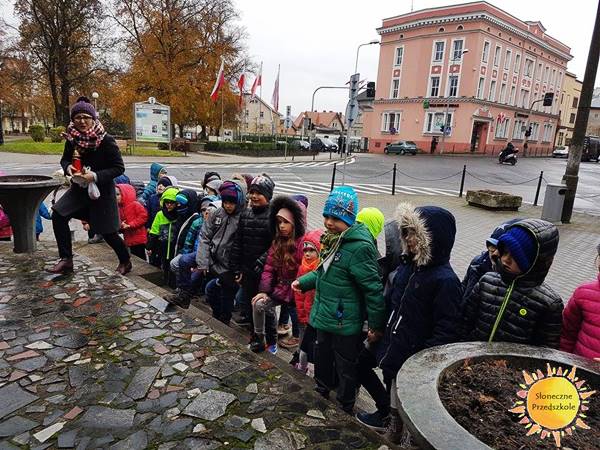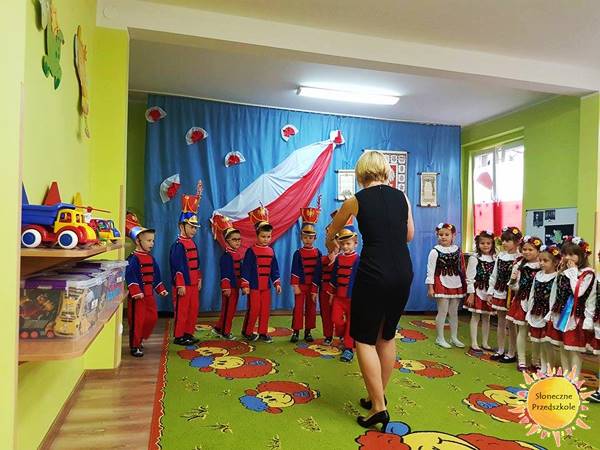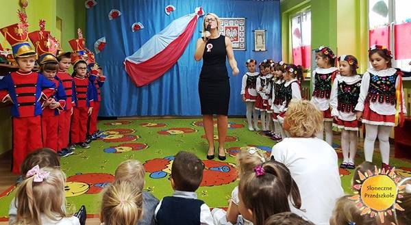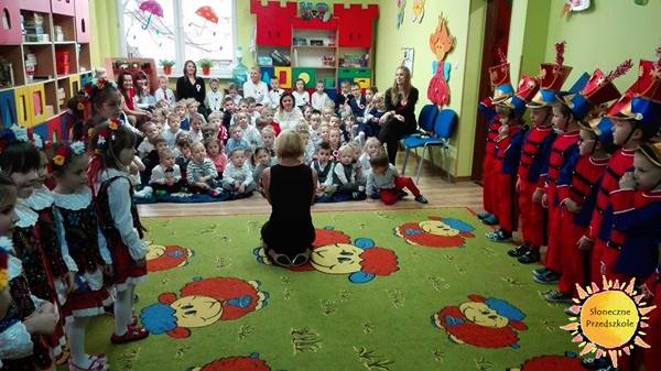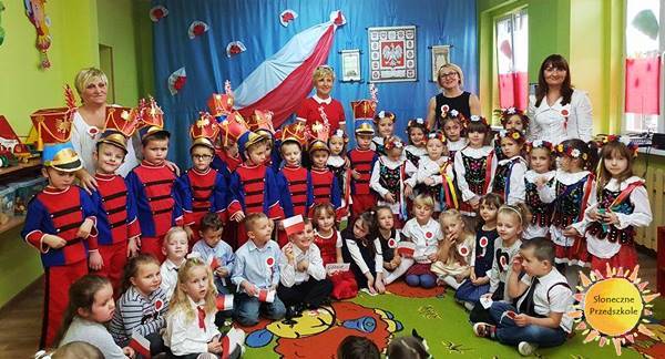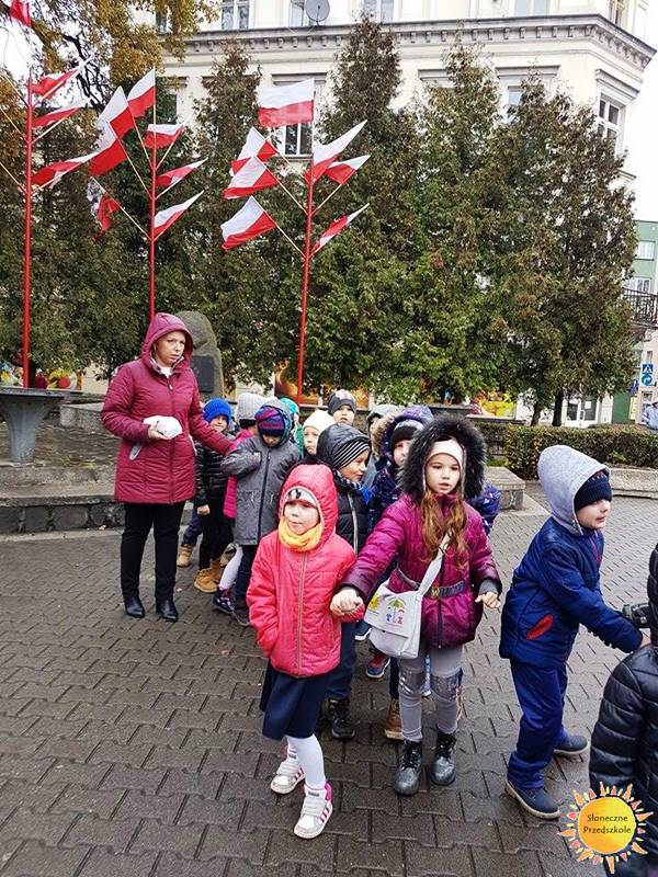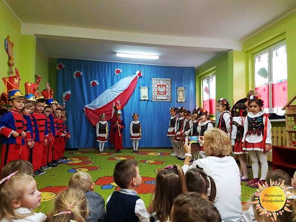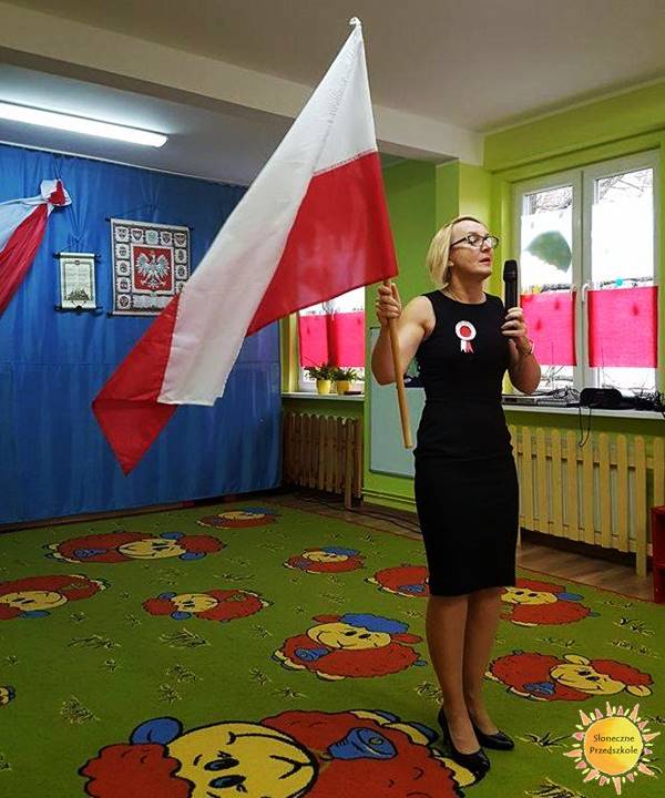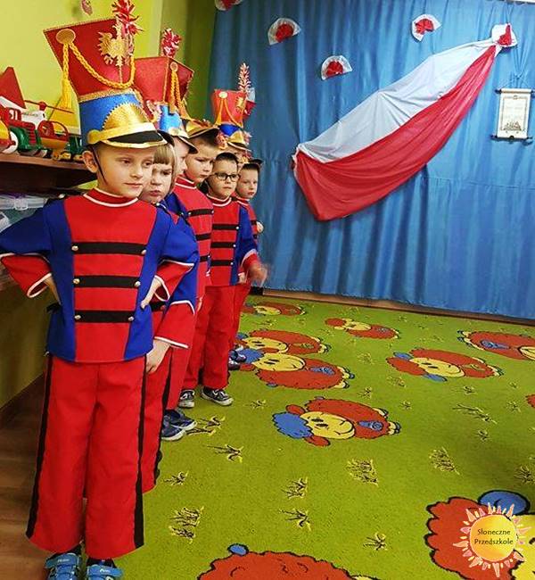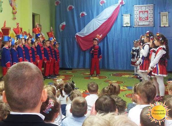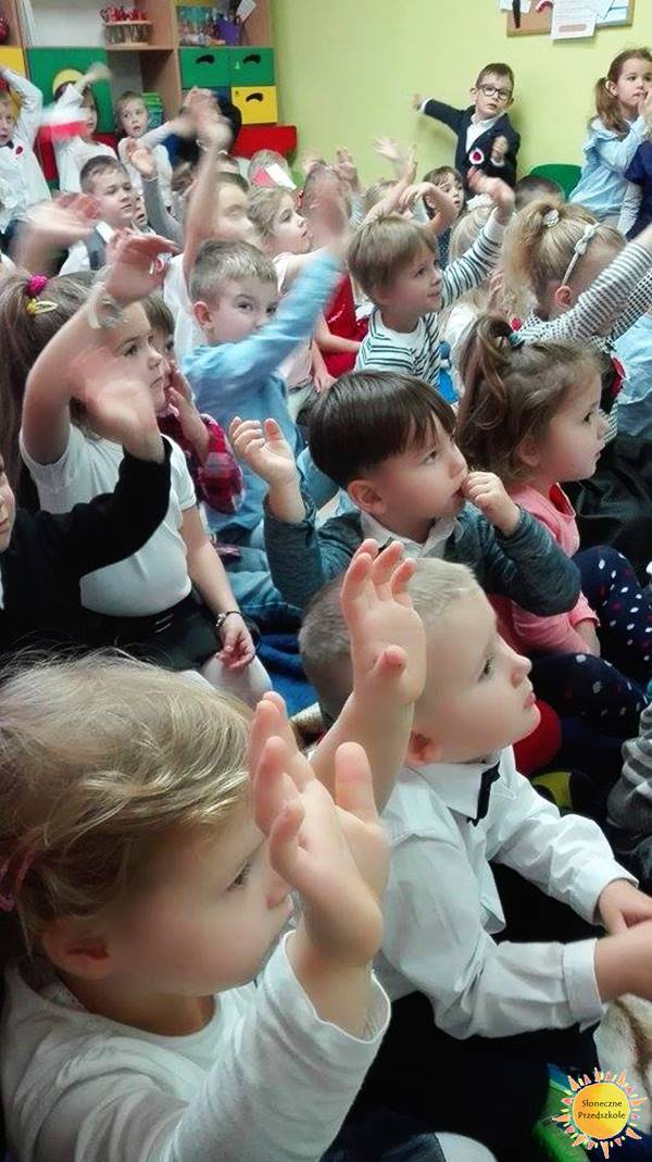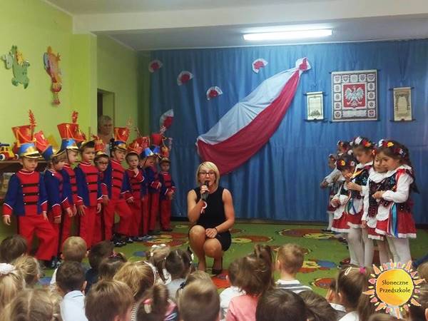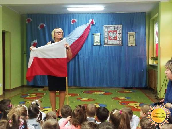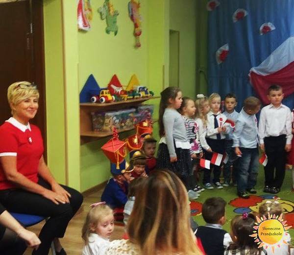 Z zaciekawieniem słuchaliśmy opowieści o Polsce, o naszych symbolach narodowych, powitaliśmy prawdziwy poczet sztandarowy, wysłuchaliśmy wiersza, odśpiewaliśmy hymn - Mazurek Dąbrowskiego... przez chwilę zrobiło się bardzo poważnie. Czuliśmy podniosłość tego święta. Zabawna aranżacja starej pieśni wojskowej rozładowała na moment poważną atmosferę, aby po chwili znów wzruszyć się podczas niespodzianki przygotowanej przez Olka z grupy starszaków, który zagrał dla nas i pięknie zaśpiewał hymn.