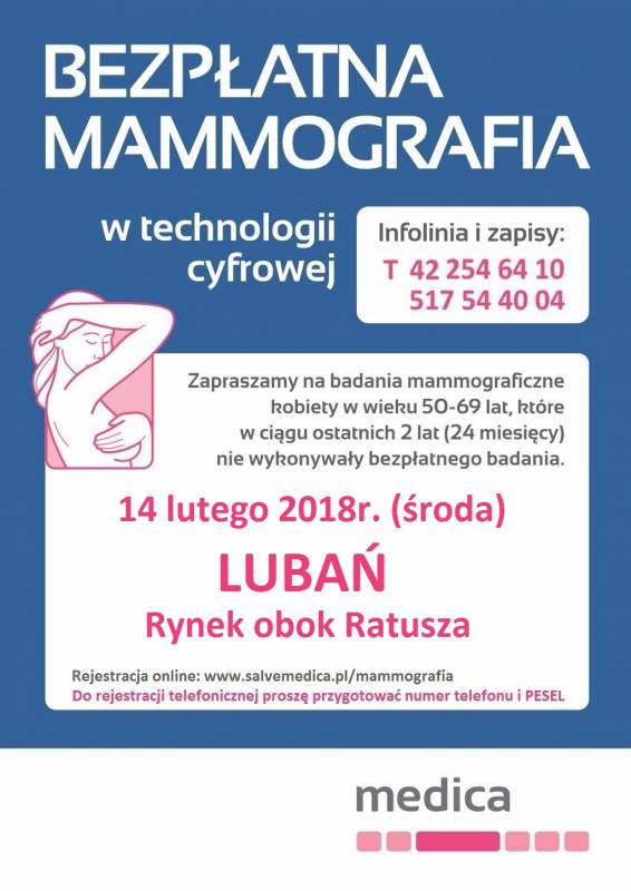 14 lutego 2018 r. w miejscowości LUBAŃ odbędą się bezpłatne badania mammograficzne finansowane przez Narodowy Fundusz Zdrowia.
