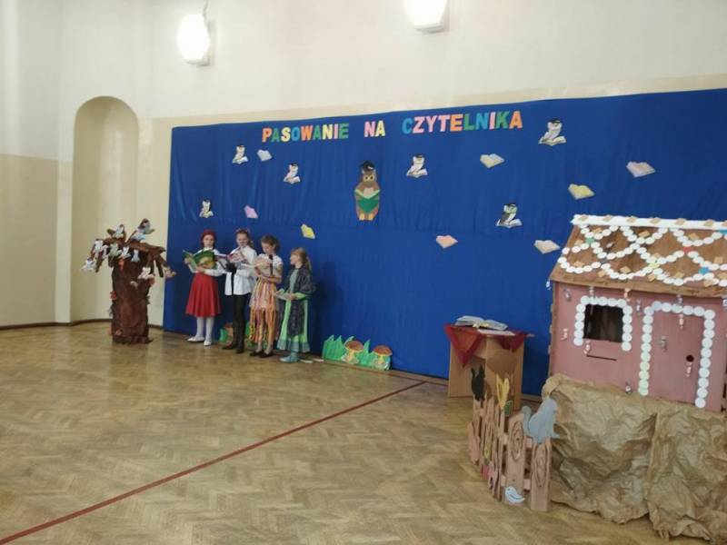18 maja br. w naszej szkole odbyło się uroczyste pasowanie na czytelnika uczniów klasy pierwszej. Dzieci uczestniczyły w inscenizacji przygotowywanej przez starsze kolezanki, którą oglądały z wielkim zainteresowaniem. Doskonale poradziły sobie z zagadkami a test wiedzy o świecie bajek zdały celujaco. Następnie złożyły uroczyste przyrzeczenie, a pani dyrektor każdemu czytelnikowi wręczyła pamiątkowy dyplom. Na koniec każdy mógł skubnąć co nieco z chatki Baby Jagi.
