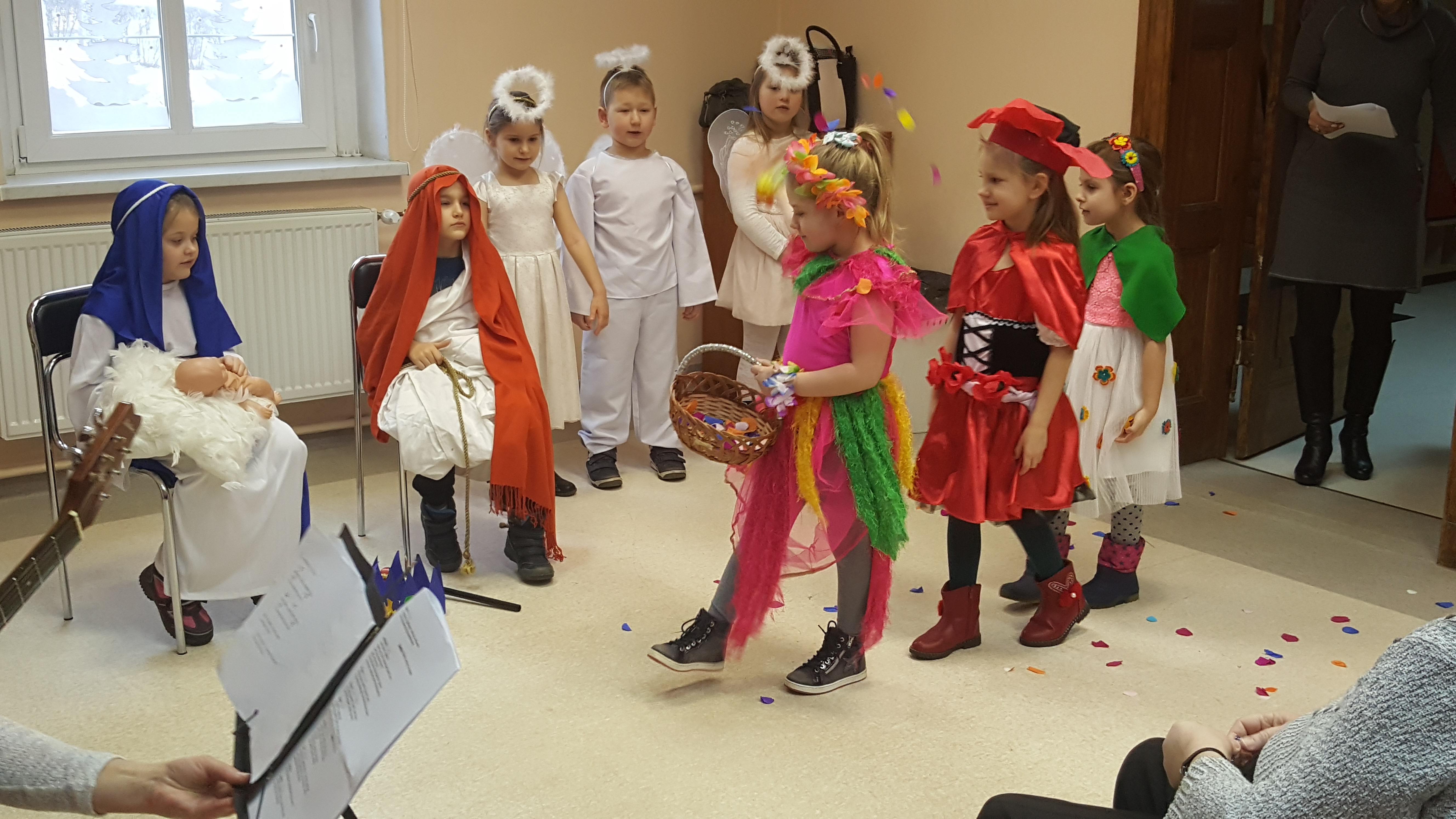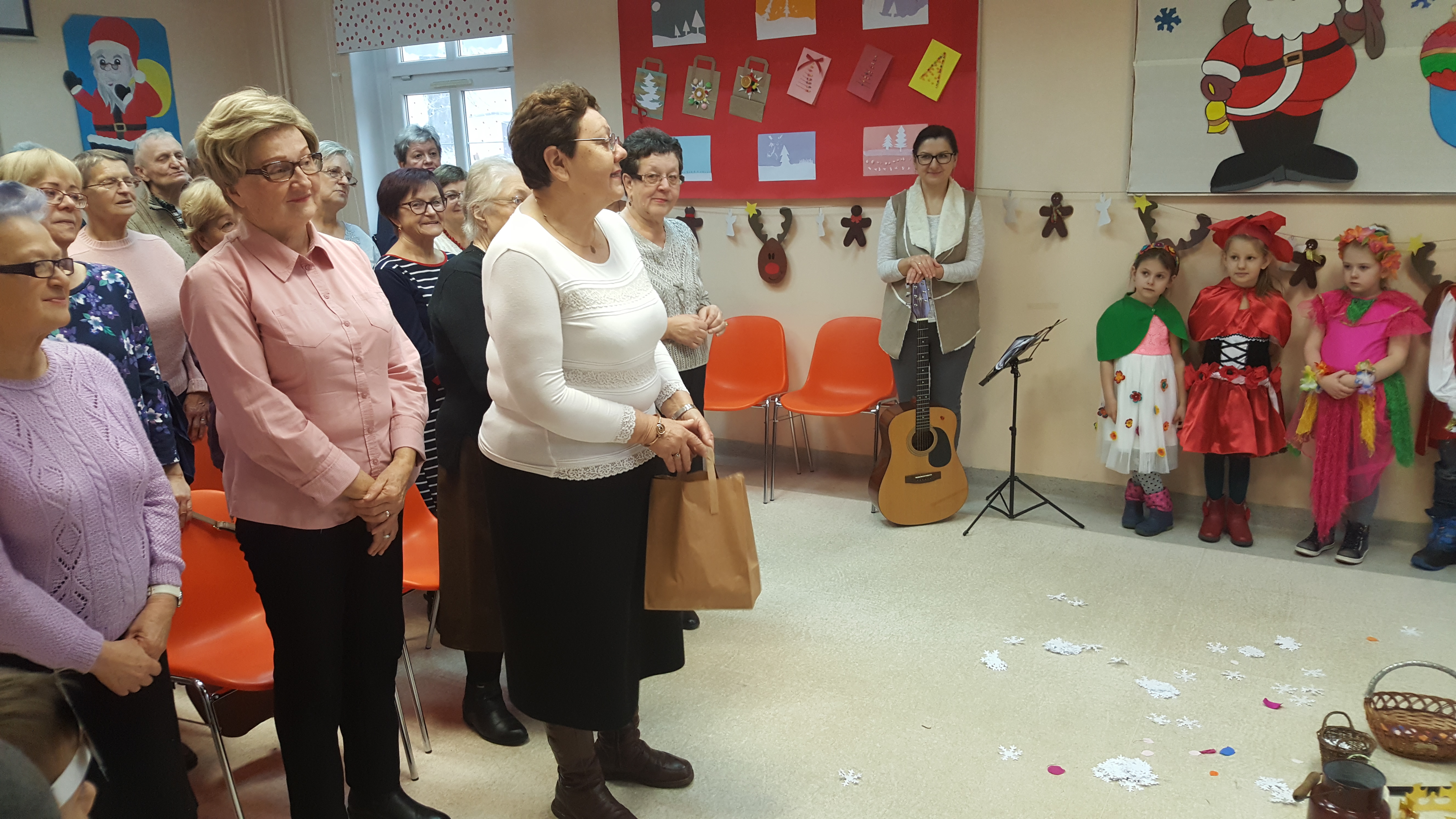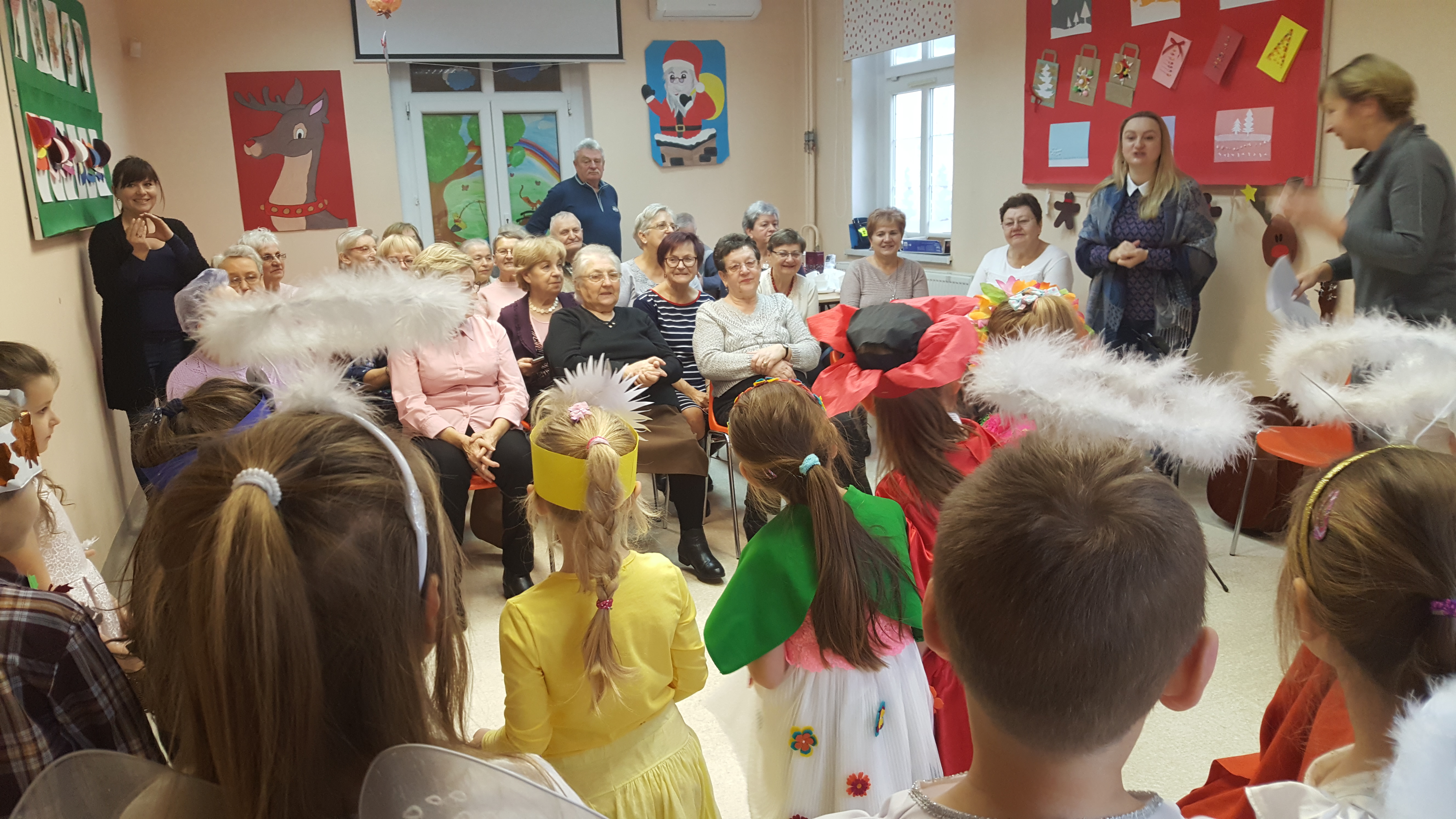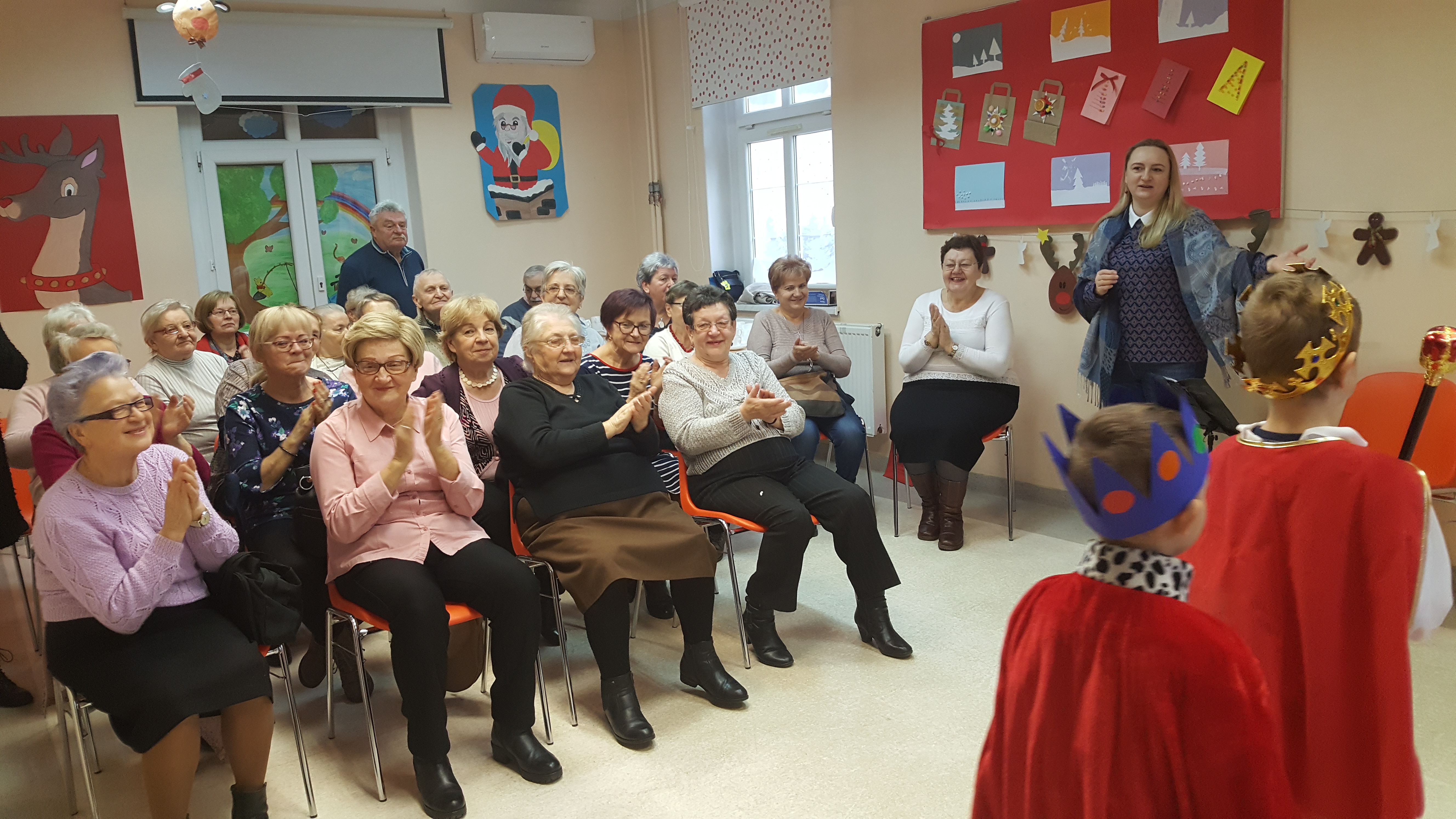 Dzieci wybrały się tam z programem bożonarodzeniowym -jasełka, przygotowanym specjalnie na tę szczególną okazję, śpiewały kolędy i składały życzenia. Seniorzy entuzjastycznie reagowali na występ dzieci przedszkolnych i nagradzali gromkimi brawami. Za piękny występ dzieci zostały obdarowane słodkim upominkiem. Wizyta w Ośrodku Wsparcia Dziennego była dla przedszkolaków kolejną lekcją wychowawczą - dzieci zrozumiały w jaki sposób można sprawić radość u osób starszych, jak szanować i okazywać życzliwość. Było dużo radości, miłych słów.