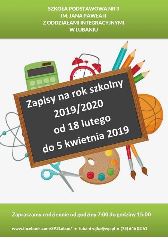 Zapisy do SP 3 ruszyły! Już od 18 lutego aż do 5 kwietnia 2019 można zapisywać dzieci do naszej szkoły. Dokumenty niezbędne do zapisu można pobrać tutaj: http://www.sp3.luban.pl/?a=315