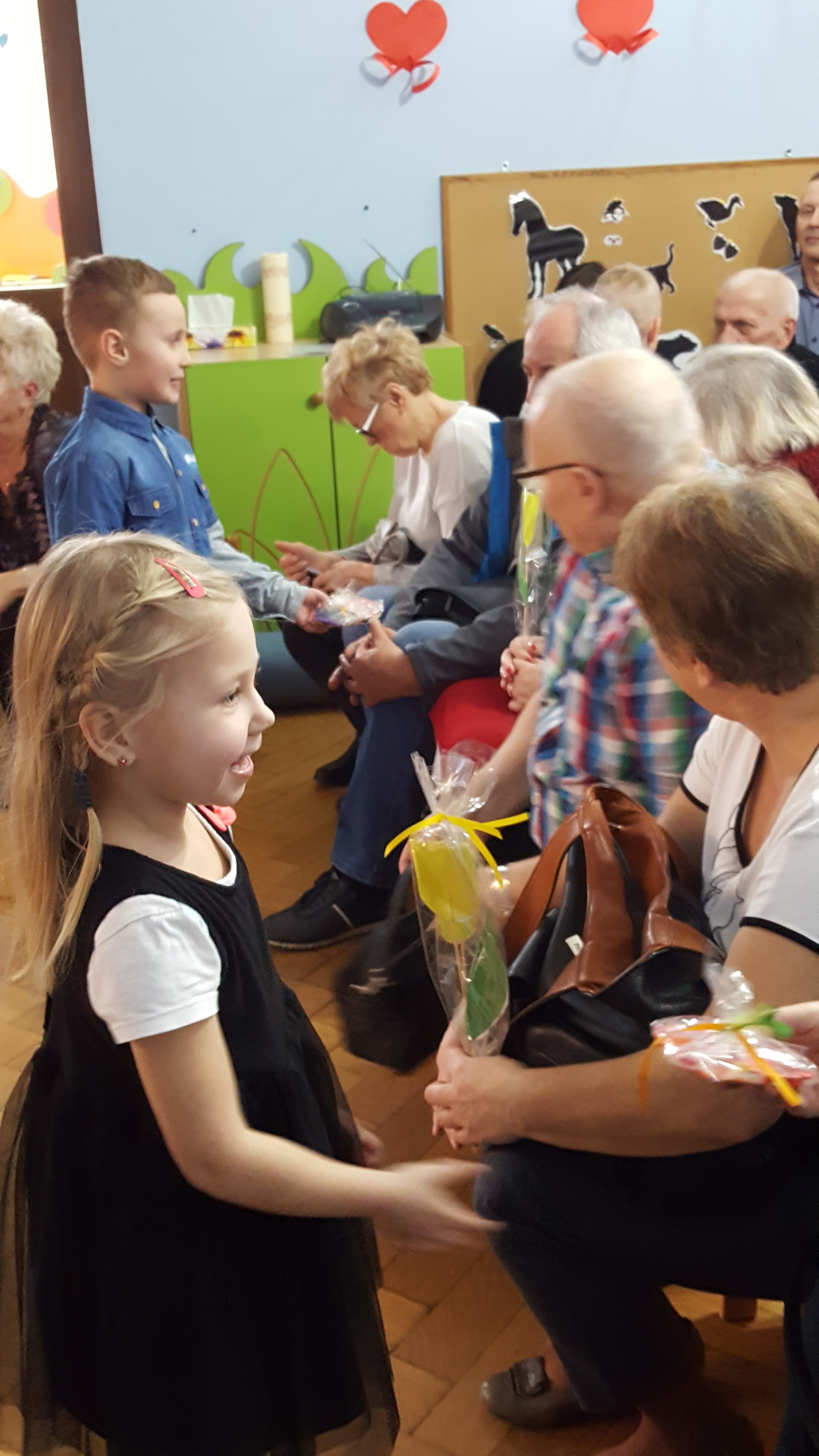 Dzieci przygotowały dla zaproszonych gości specjalny program artystyczny, recytowały wiersze, śpiewały piosenki i tańczyły. Nie jednej babci i dziadkowi łezka zabłysła w oku na widok występu przygotowanego przez wnuki i wnuczki. To był naprawdę wyjątkowy dzień pełen radości, uśmiechu i dumy. Rozpromienione twarze babć i dziadków po raz kolejny ukazały, jak ważne są takie spotkania w przedszkolu i wspólnie spędzone chwile z wnuczętami. Na koniec uroczystego spotkania przedszkolaki wręczyły swoim ukochanym babciom i dziadkom własnoręcznie wykonane upominki.