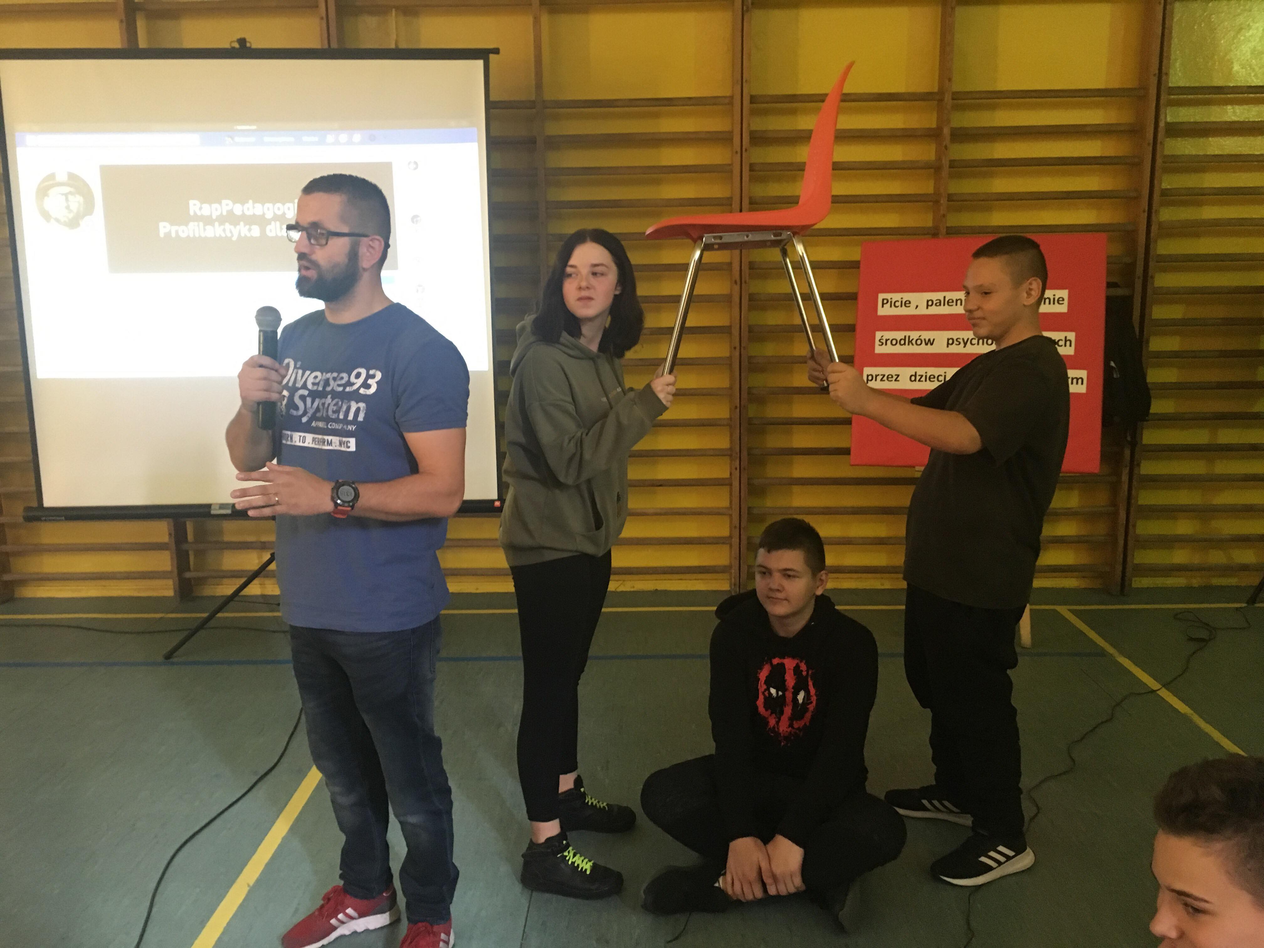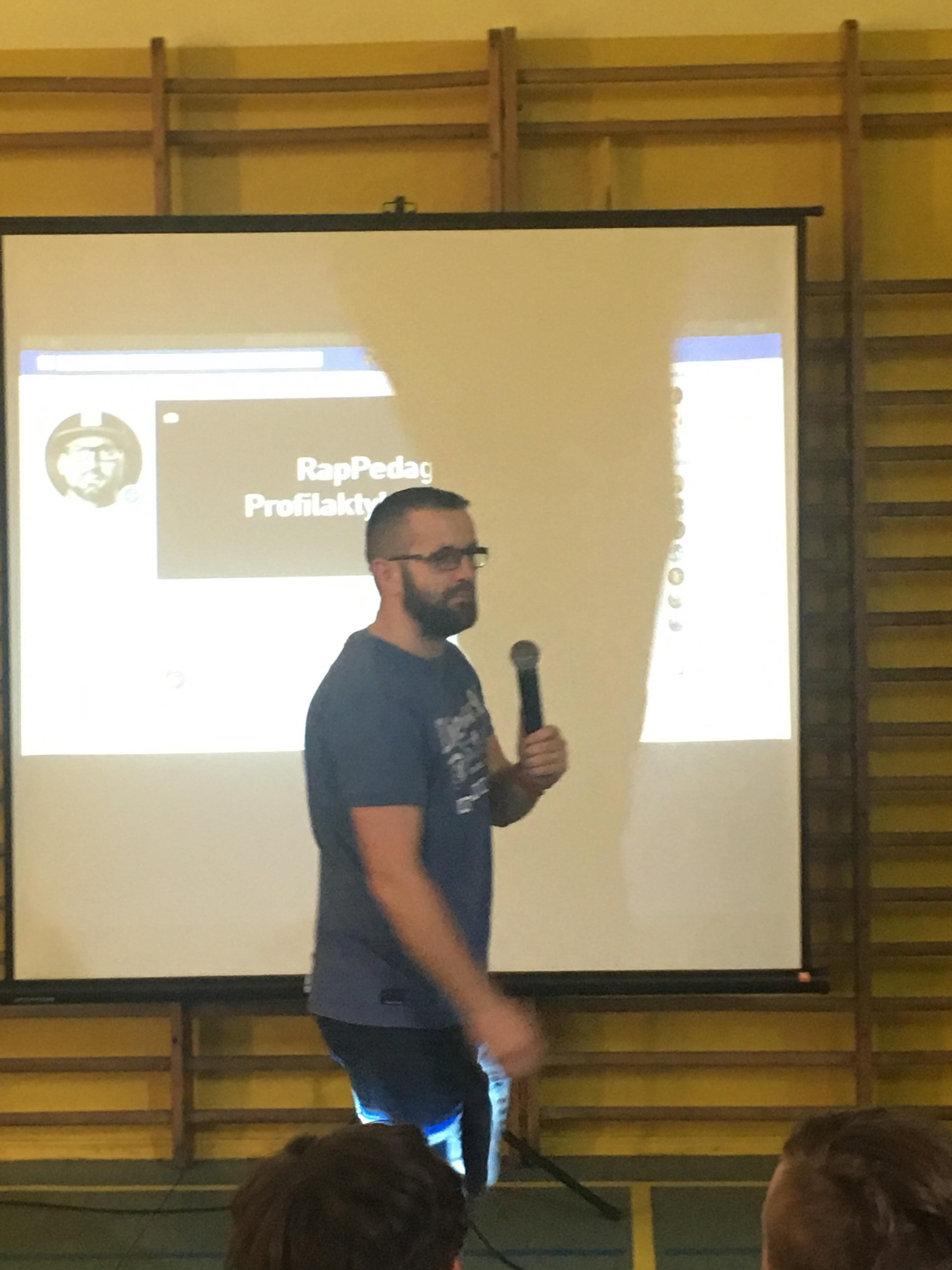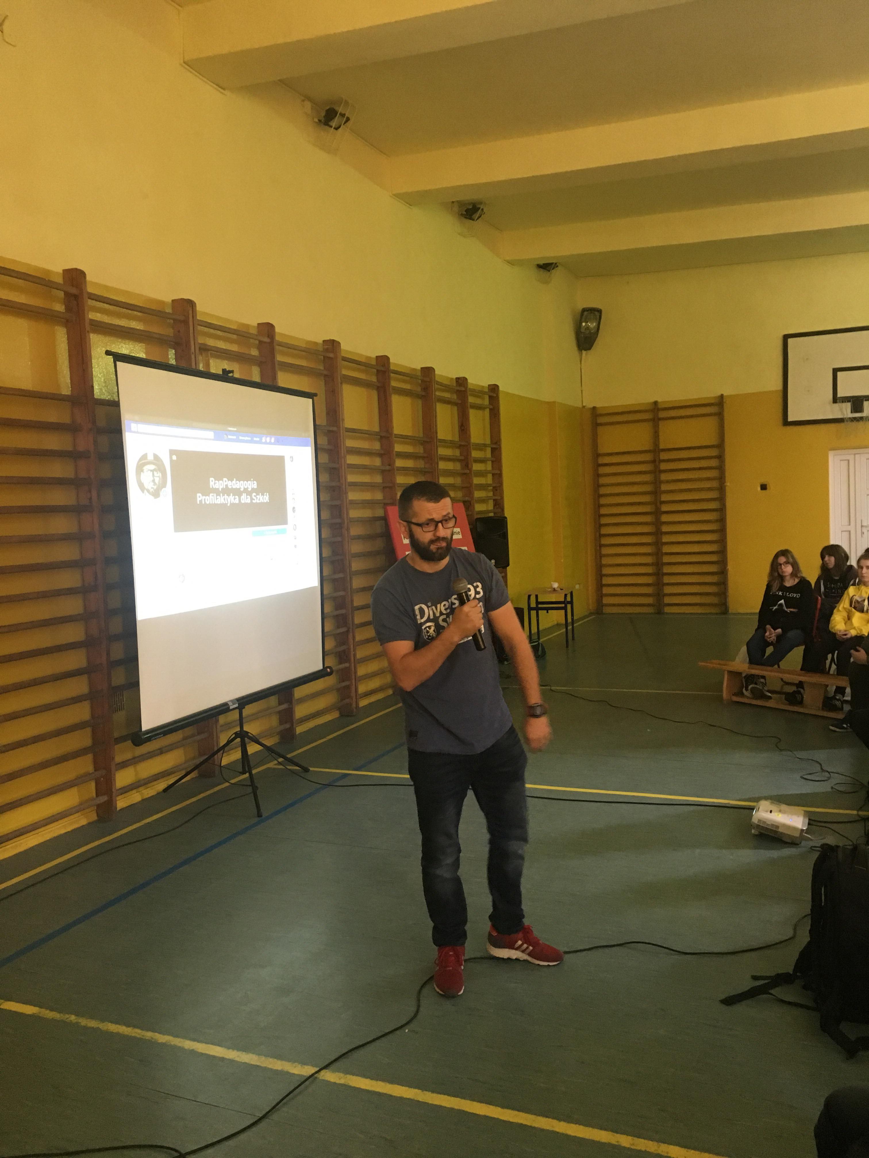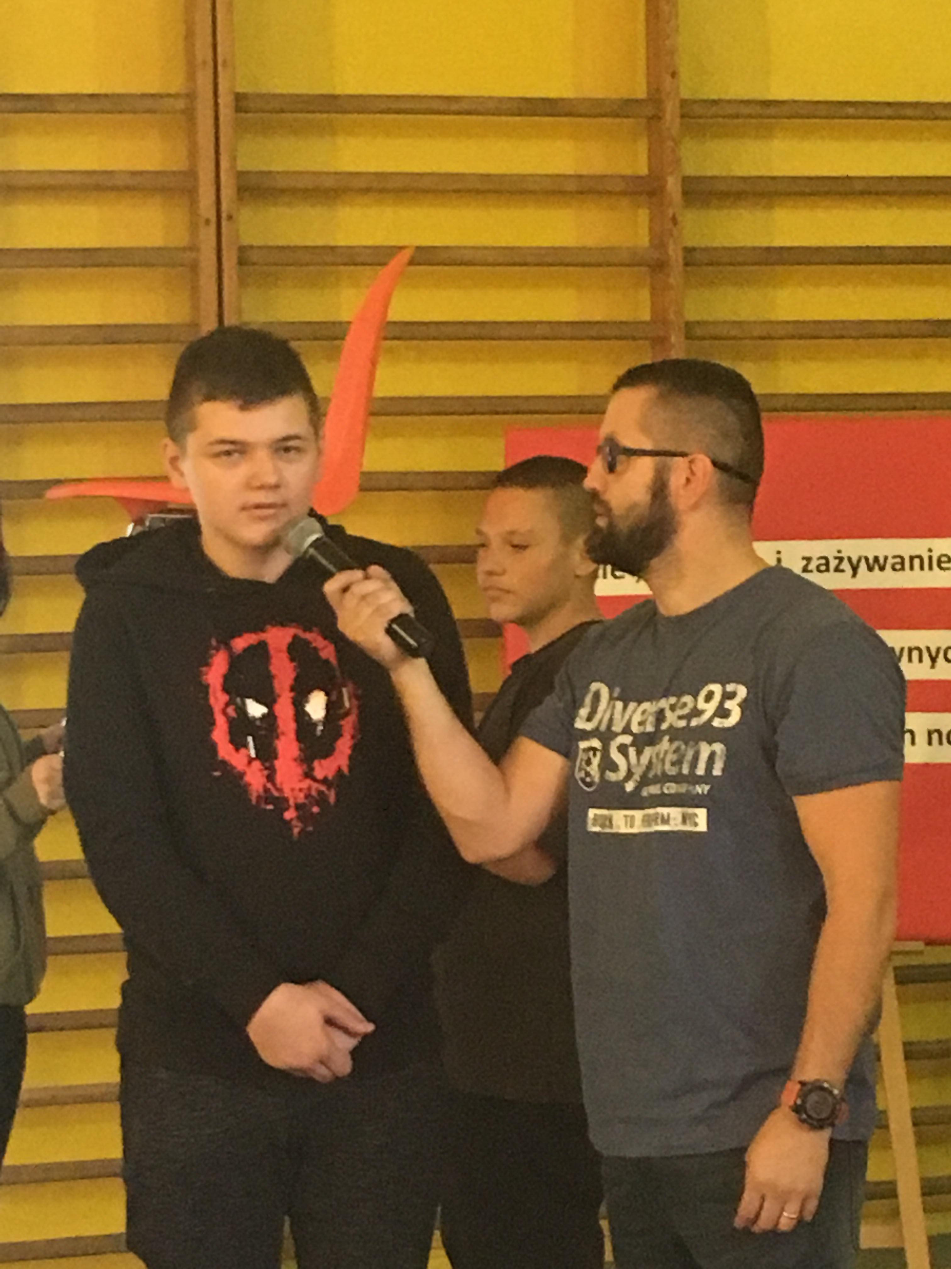 Prowadzącym był terapeuta, pedagog, raper – człowiek o bogatej osobowości i przeszłości Pan Dobromir Makowski, który na co dzień zajmuje się pracą z trudną młodzieżą i „dziećmi ulicy”. Pan Dobromir zwrócił uwagę uczniów na niebezpieczeństwo zażywania środków uzależniających, wagę norm społecznych w życiu człowieka oraz wartości, którymi powinna kierować się w życiu młodzież. Uczniowie otrzymali dobrą lekcje na temat brania odpowiedzialności za swoje czyny, empatii, moralności oraz szacunku do siebie i innych. Spotkanie było też okazją do prezentacji talentu literackiego prowadzącego, który swoim rapem ujął zgromadzoną publiczność. Rodzice i nauczyciele otrzymali zastrzyk informacji na temat destrukcyjnego wpływu massmediów na kształtowanie osobowości młodego człowieka, moralności bez wartości i świata pozbawionego norm społecznych, który stanowi zagrożenie dla dzieci i młodzieży.