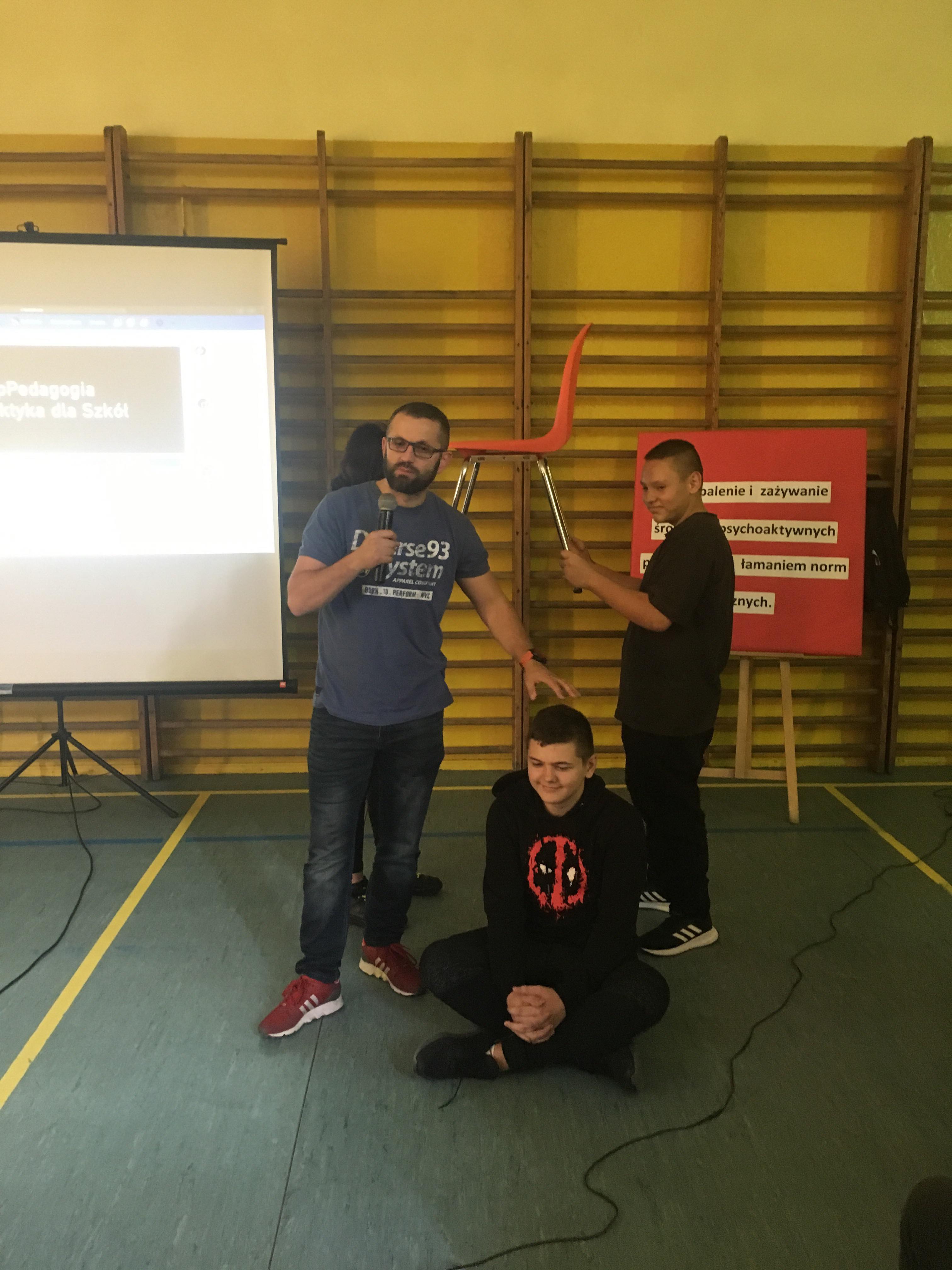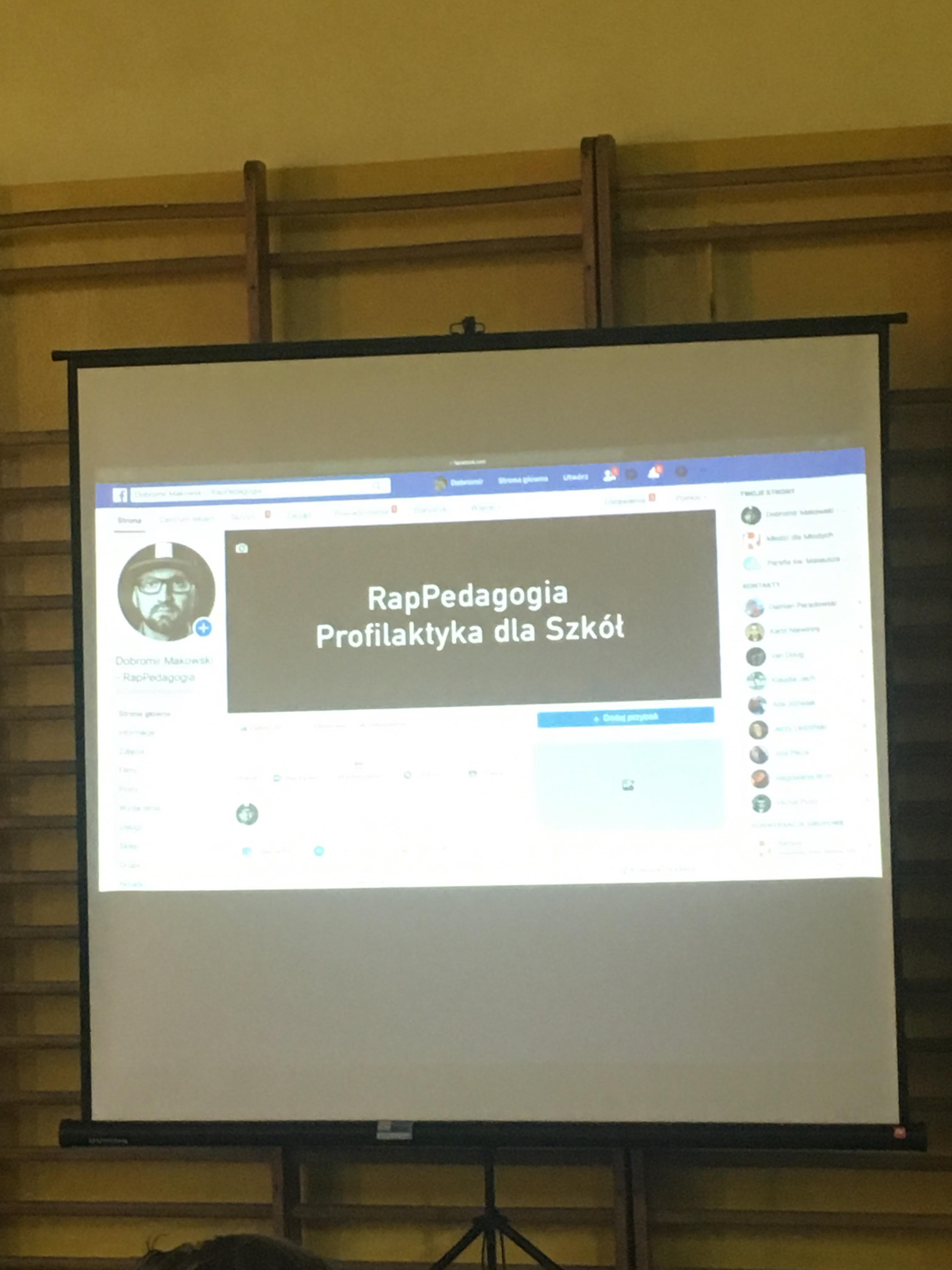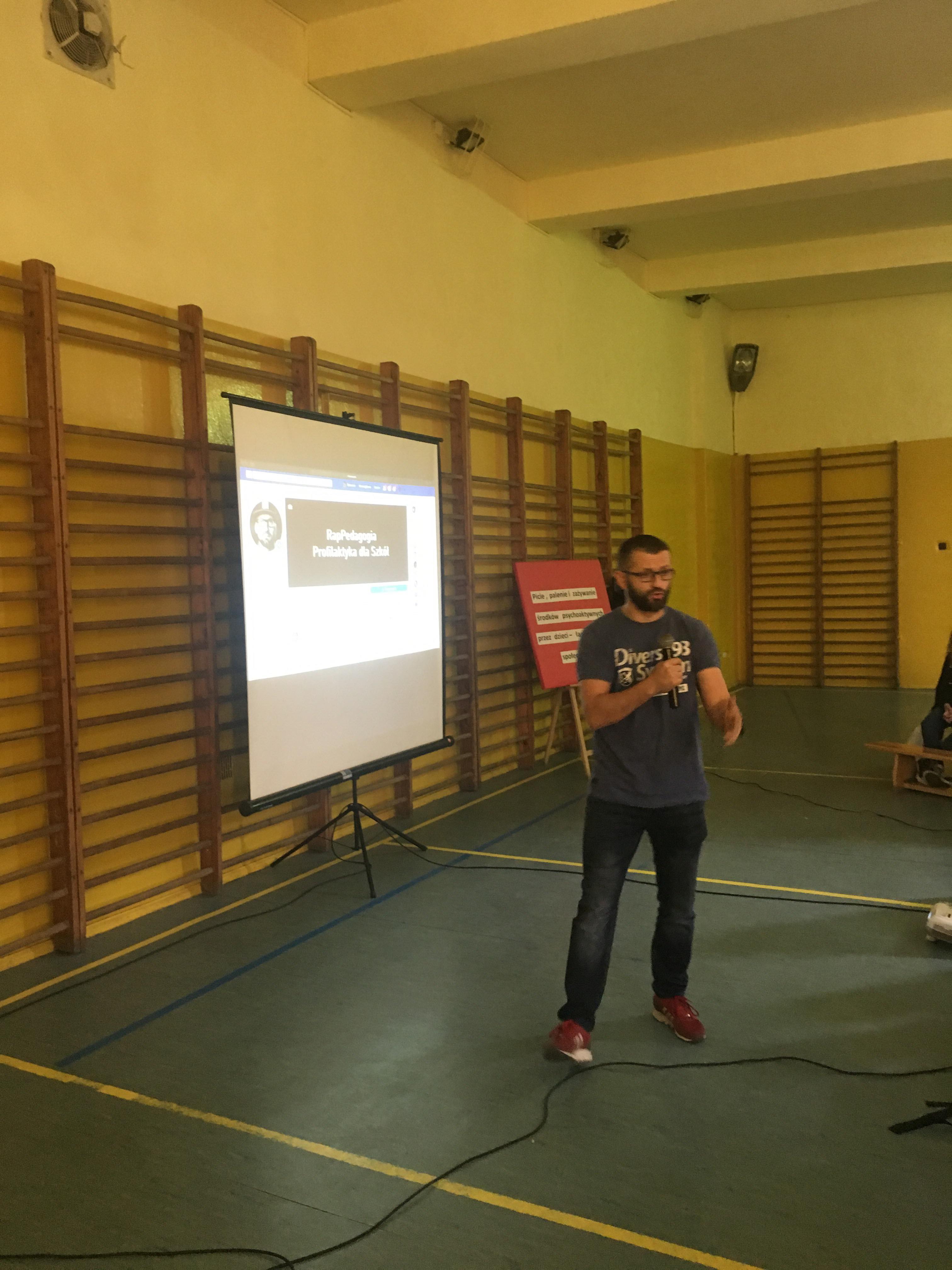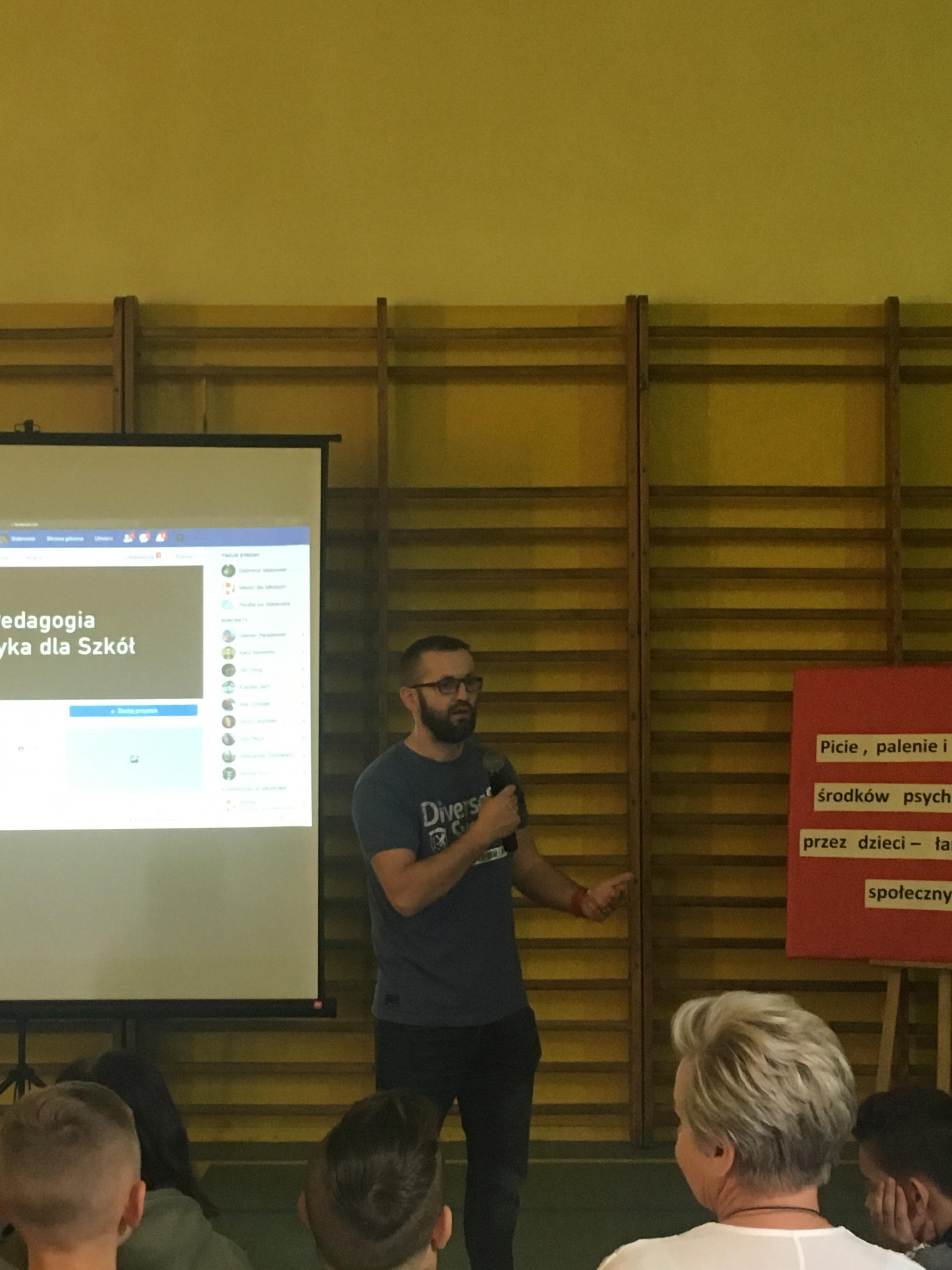 Prowadzącym był terapeuta, pedagog, raper – człowiek o bogatej osobowości i przeszłości Pan Dobromir Makowski, który na co dzień zajmuje się pracą z trudną młodzieżą i „dziećmi ulicy”. Pan Dobromir zwrócił uwagę uczniów na niebezpieczeństwo zażywania środków uzależniających, wagę norm społecznych w życiu człowieka oraz wartości, którymi powinna kierować się w życiu młodzież. Uczniowie otrzymali dobrą lekcje na temat brania odpowiedzialności za swoje czyny, empatii, moralności oraz szacunku do siebie i innych. Spotkanie było też okazją do prezentacji talentu literackiego prowadzącego, który swoim rapem ujął zgromadzoną publiczność. Rodzice i nauczyciele otrzymali zastrzyk informacji na temat destrukcyjnego wpływu massmediów na kształtowanie osobowości młodego człowieka, moralności bez wartości i świata pozbawionego norm społecznych, który stanowi zagrożenie dla dzieci i młodzieży.