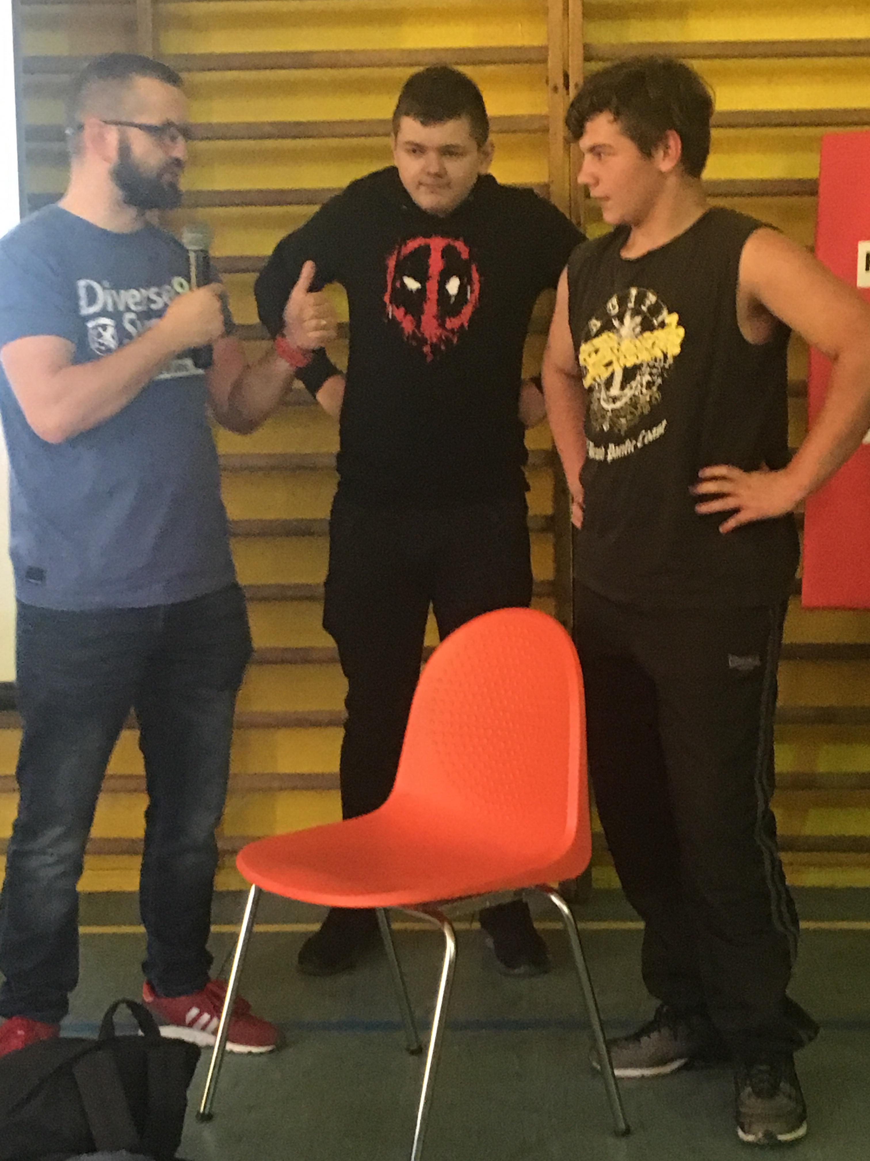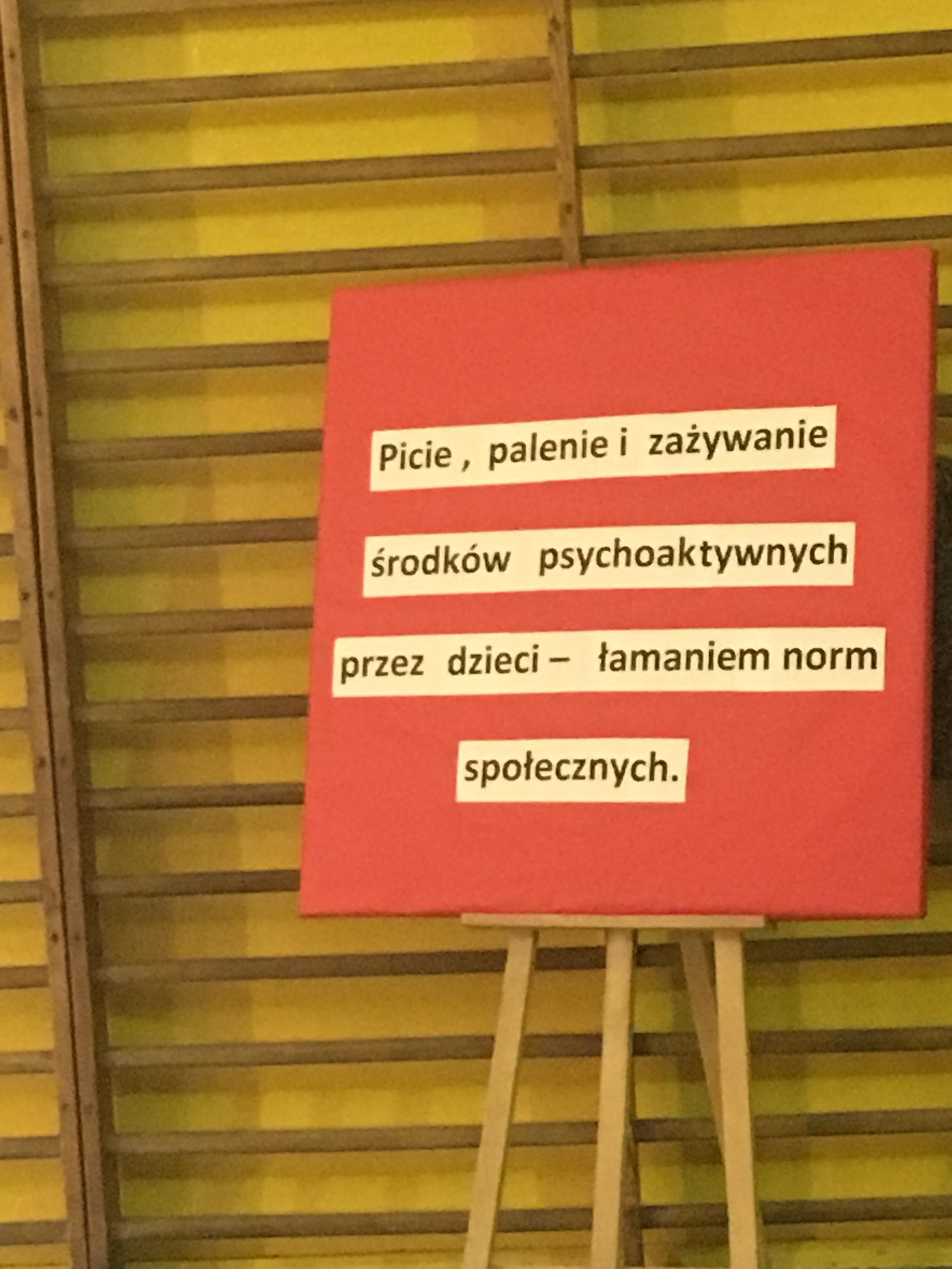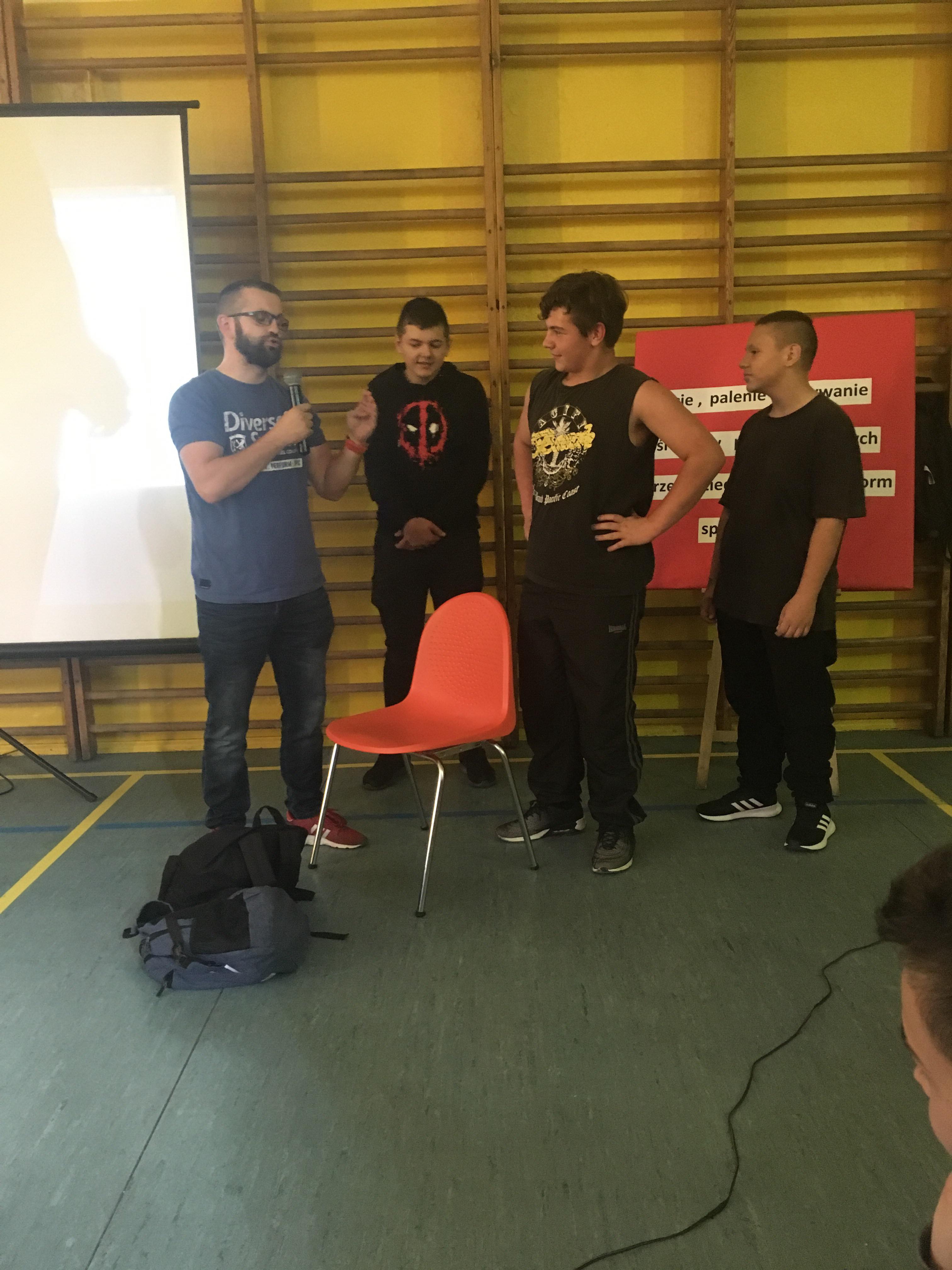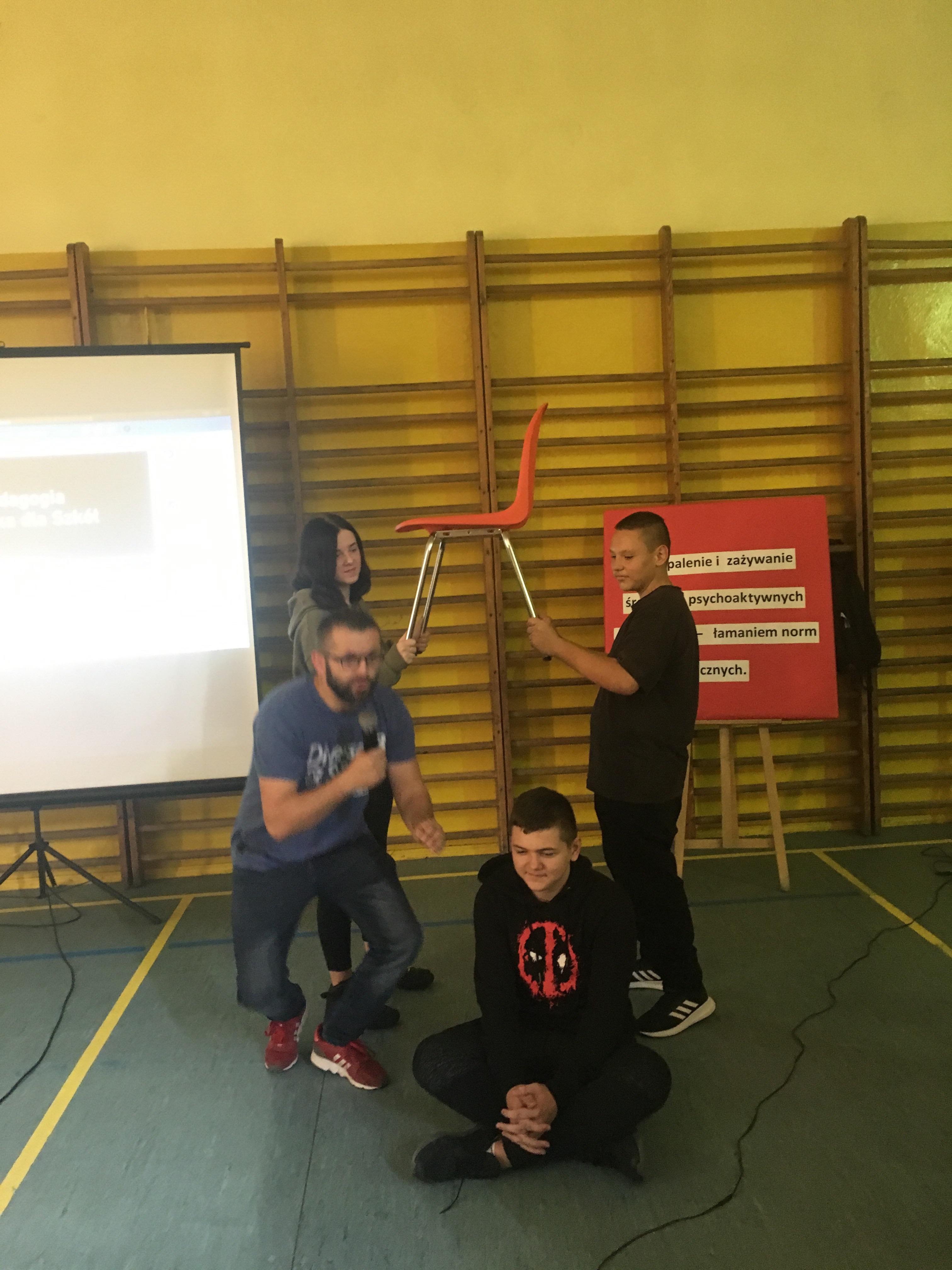 Prowadzącym był terapeuta, pedagog, raper – człowiek o bogatej osobowości i przeszłości Pan Dobromir Makowski, który na co dzień zajmuje się pracą z trudną młodzieżą i „dziećmi ulicy”. Pan Dobromir zwrócił uwagę uczniów na niebezpieczeństwo zażywania środków uzależniających, wagę norm społecznych w życiu człowieka oraz wartości, którymi powinna kierować się w życiu młodzież. Uczniowie otrzymali dobrą lekcje na temat brania odpowiedzialności za swoje czyny, empatii, moralności oraz szacunku do siebie i innych. Spotkanie było też okazją do prezentacji talentu literackiego prowadzącego, który swoim rapem ujął zgromadzoną publiczność. Rodzice i nauczyciele otrzymali zastrzyk informacji na temat destrukcyjnego wpływu massmediów na kształtowanie osobowości młodego człowieka, moralności bez wartości i świata pozbawionego norm społecznych, który stanowi zagrożenie dla dzieci i młodzieży.