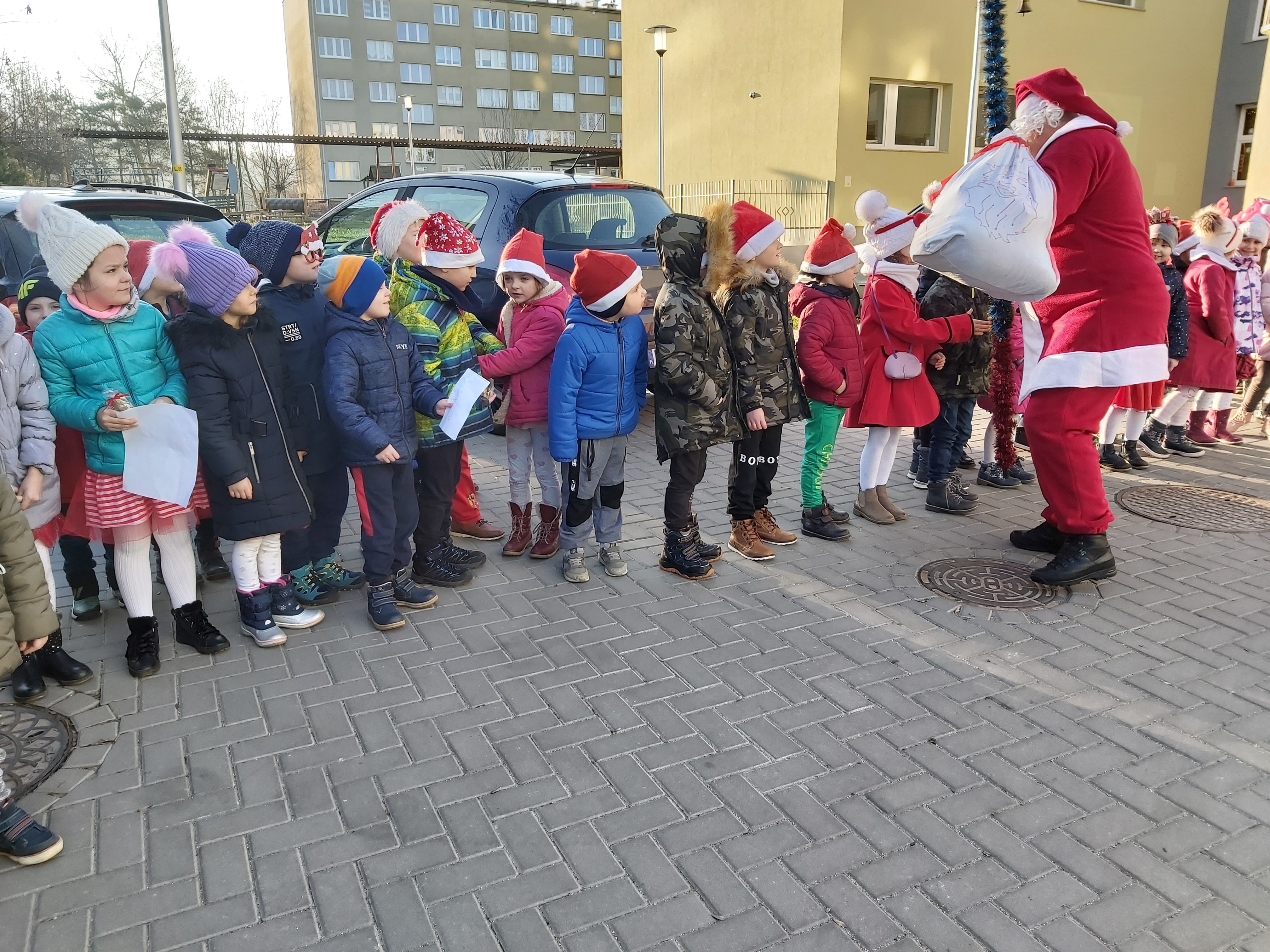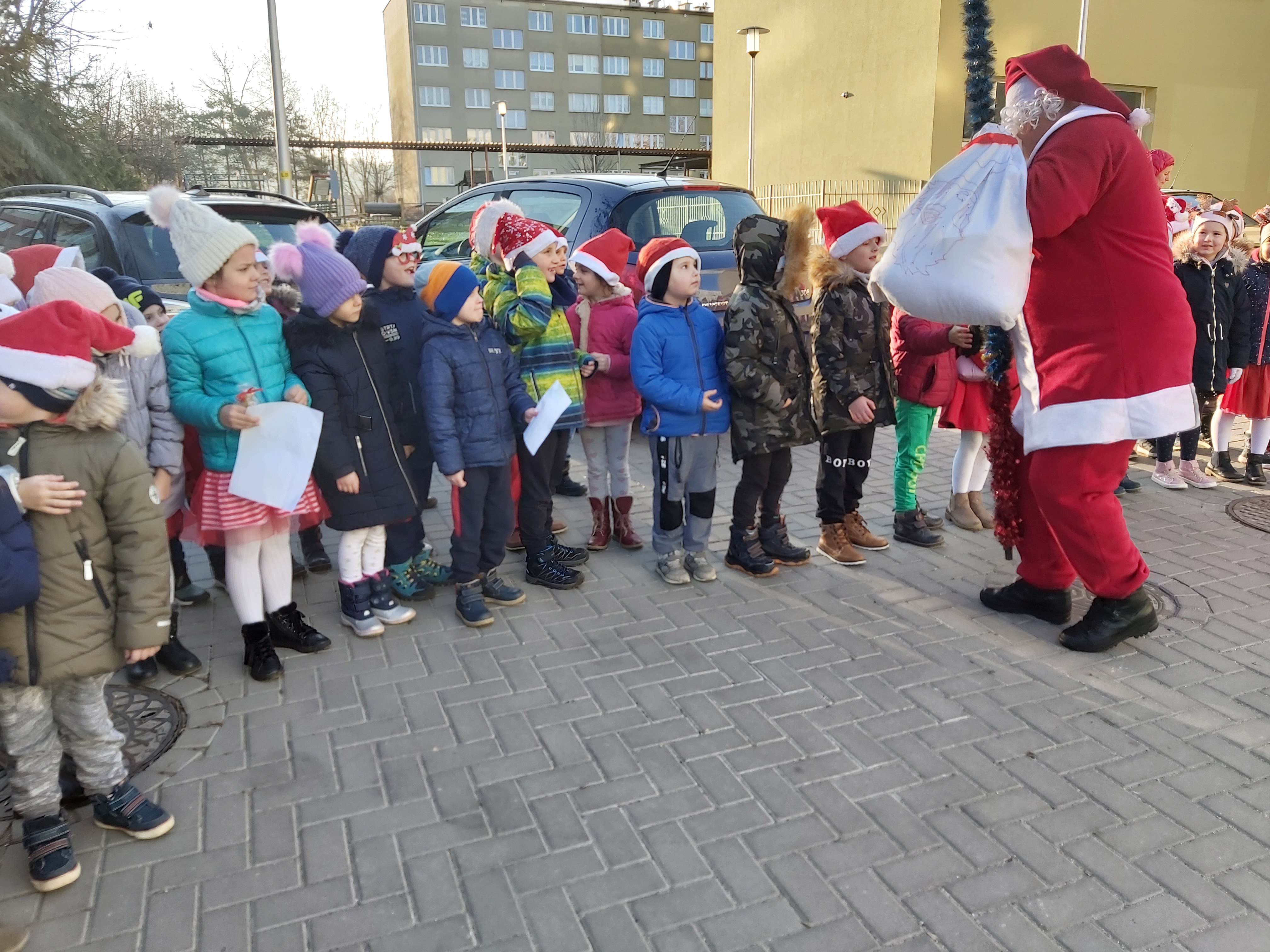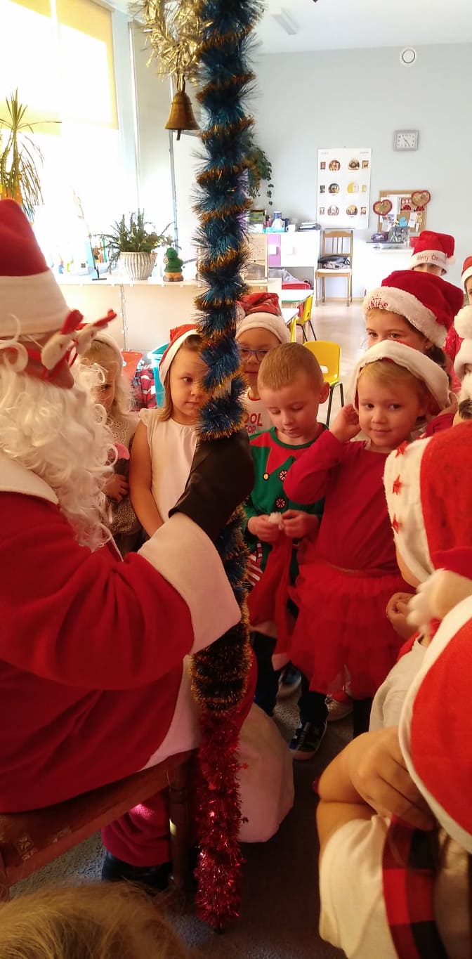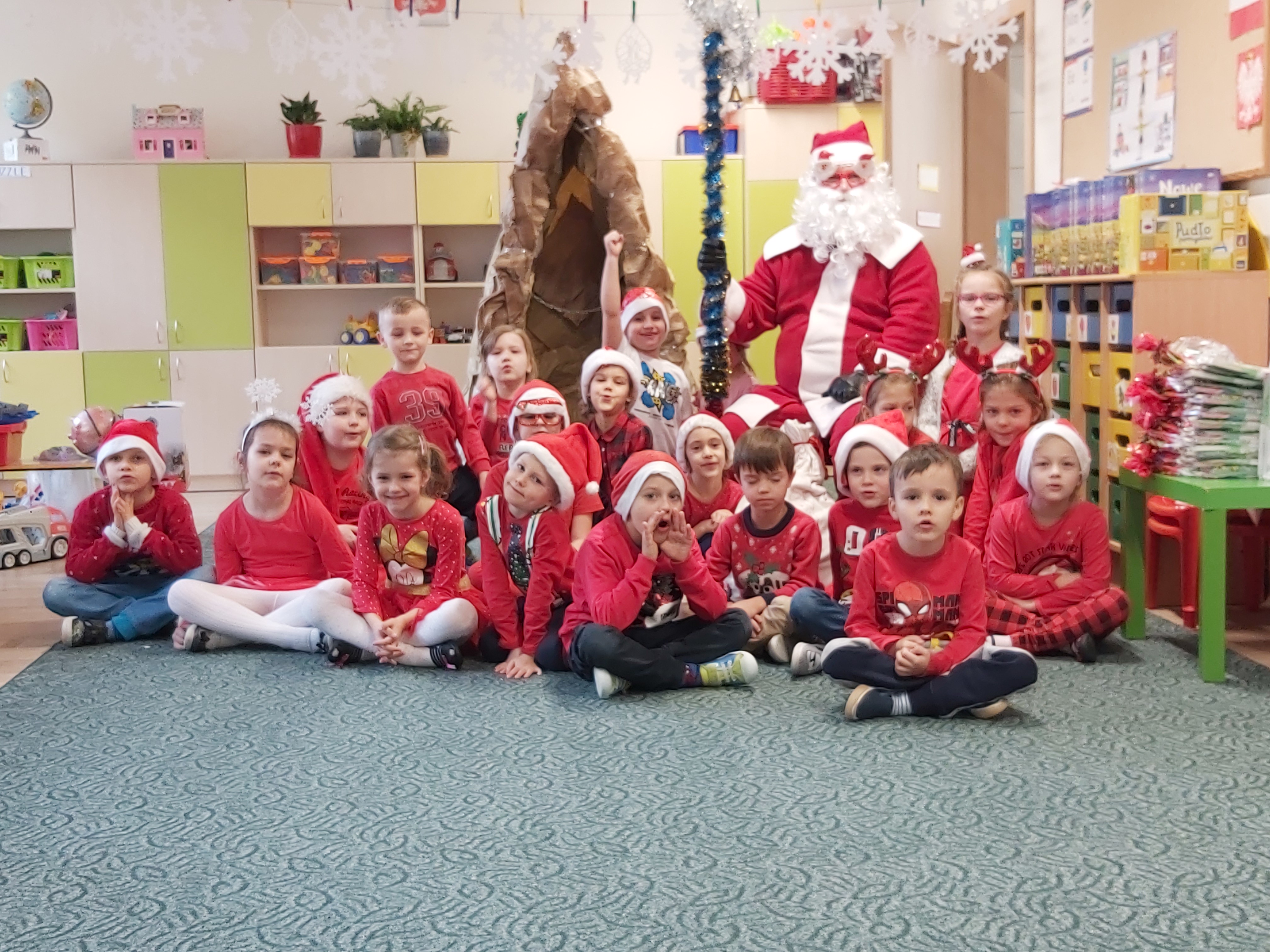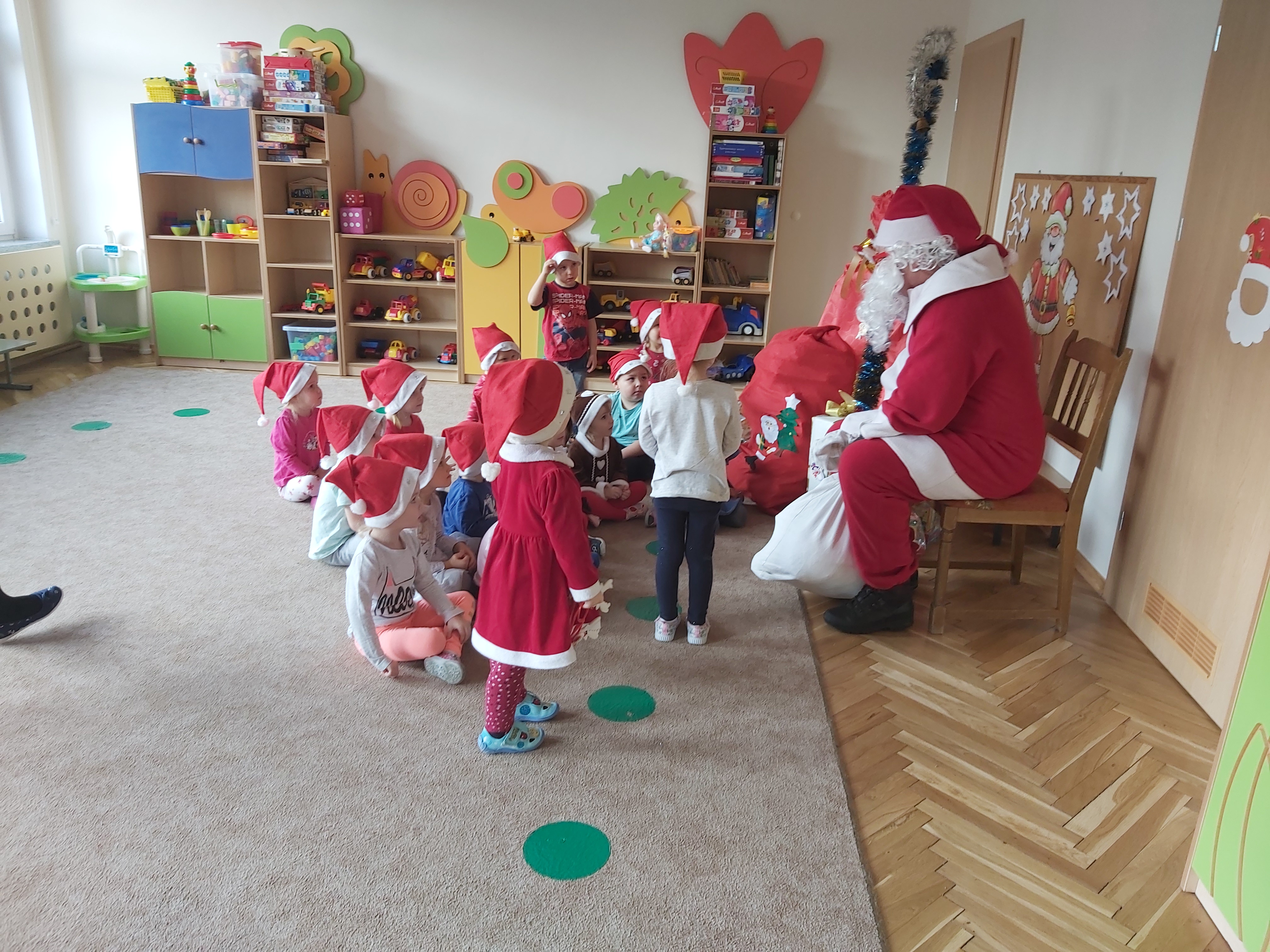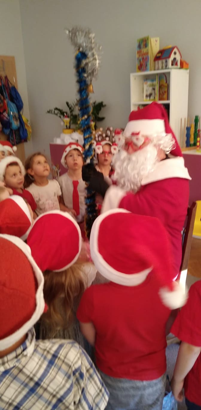 To nie mógł być nikt inny, tylko Mikołaj. Był wesoły, rozmowny, chętny do wspólnej zabawy i tańca. Chociaż nie było śniegu, to długo oczekiwany gość przybył na czas. We wszystkich grupach spotkanie przebiegało w radosnej i przyjemnej atmosferze. Przedszkolaki śpiewały Mikołajowi piosenki świąteczne, recytowały wiersze i zadawały mnóstwo pytań. Mikołaj obdarował wszystkie dzieci prezentami. Wszystkie buzie były uśmiechnięte ze spotkania z gościem.