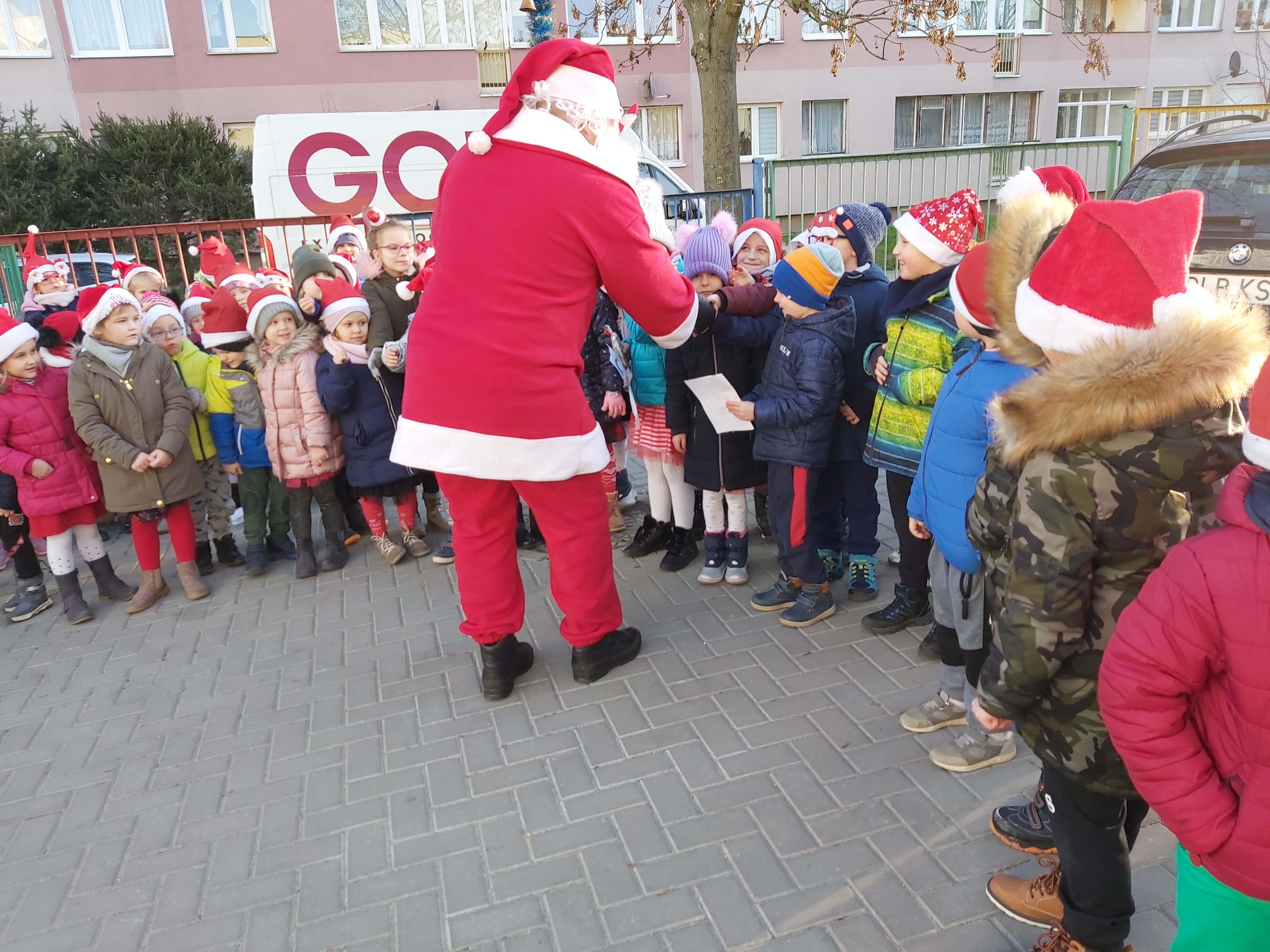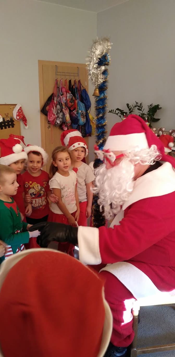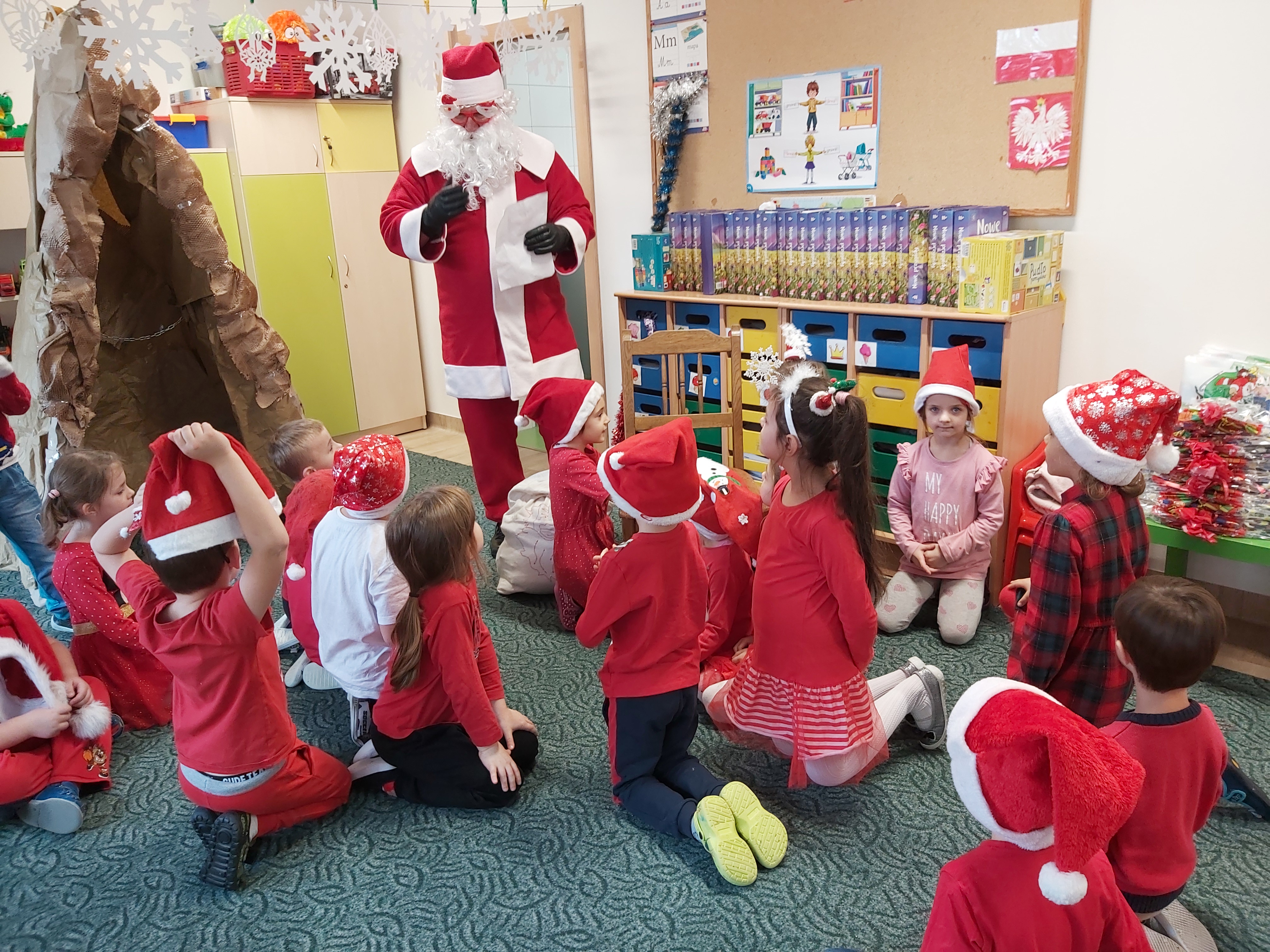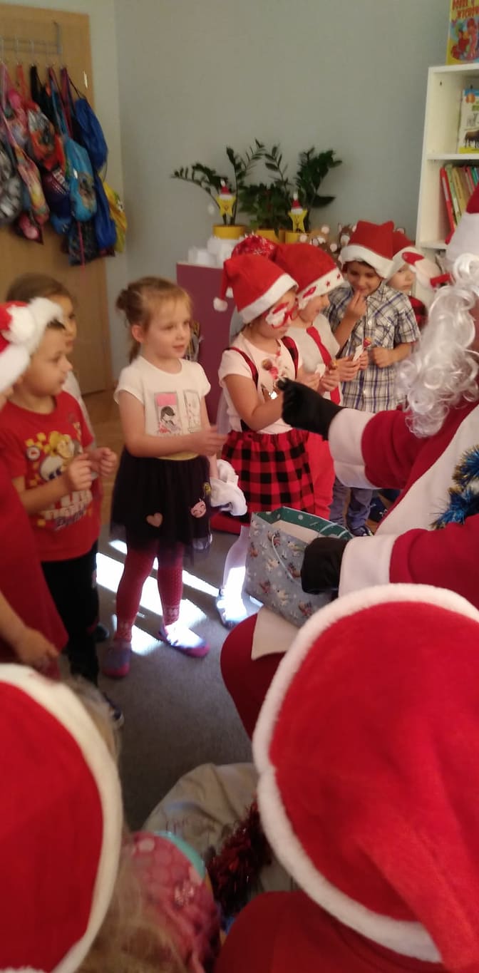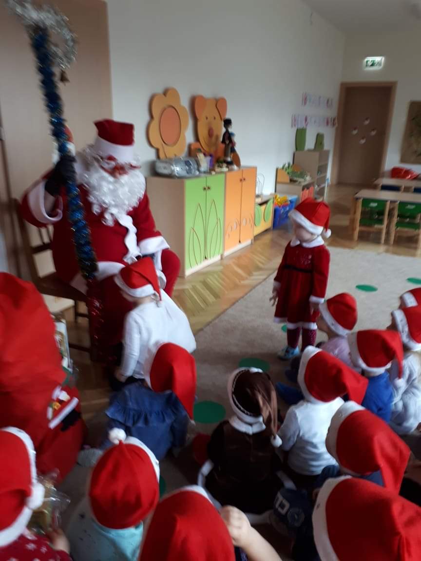To nie mógł być nikt inny, tylko Mikołaj. Był wesoły, rozmowny, chętny do wspólnej zabawy i tańca. Chociaż nie było śniegu, to długo oczekiwany gość przybył na czas. We wszystkich grupach spotkanie przebiegało w radosnej i przyjemnej atmosferze. Przedszkolaki śpiewały Mikołajowi piosenki świąteczne, recytowały wiersze i zadawały mnóstwo pytań. Mikołaj obdarował wszystkie dzieci prezentami. Wszystkie buzie były uśmiechnięte ze spotkania z gościem.