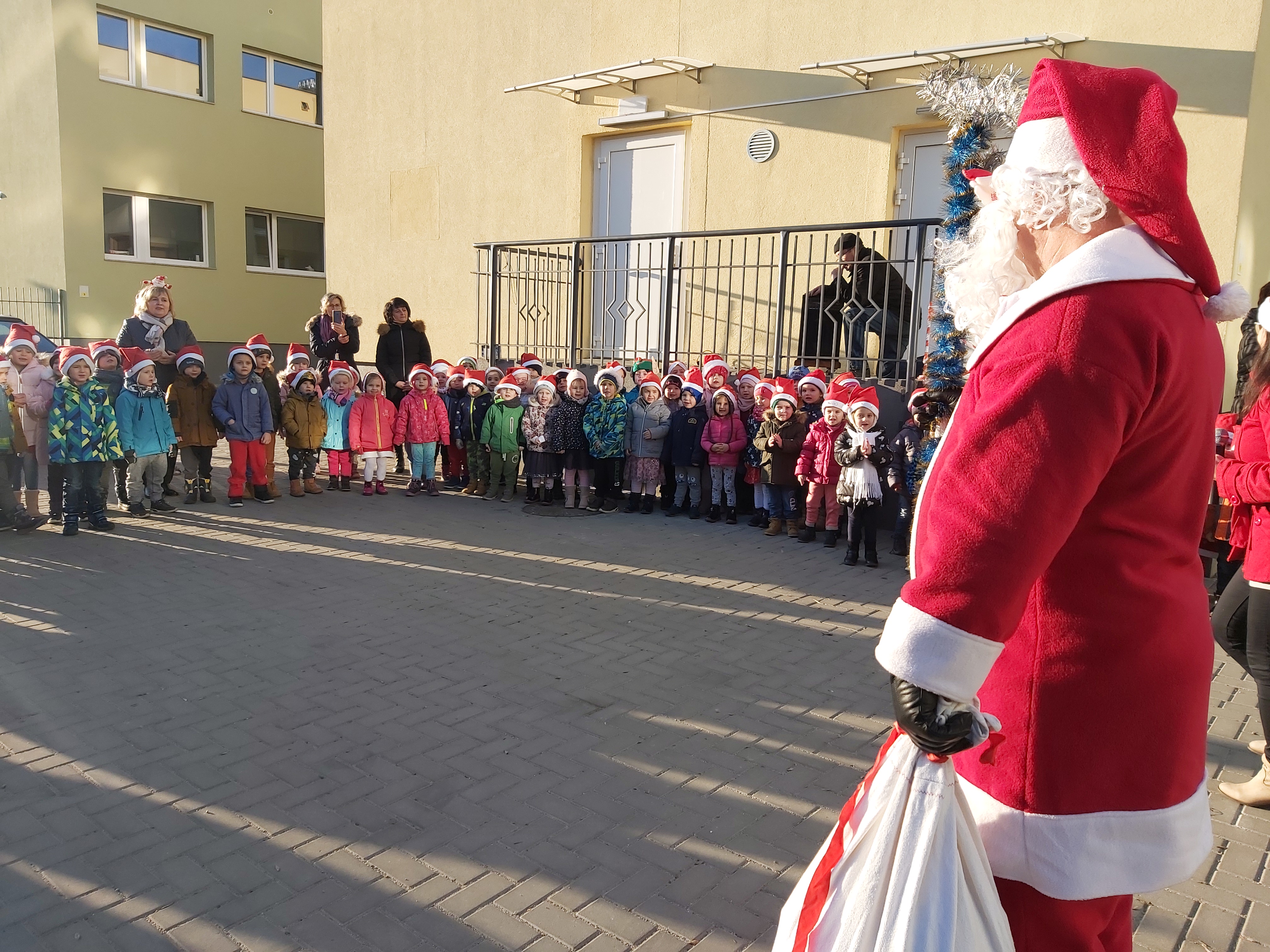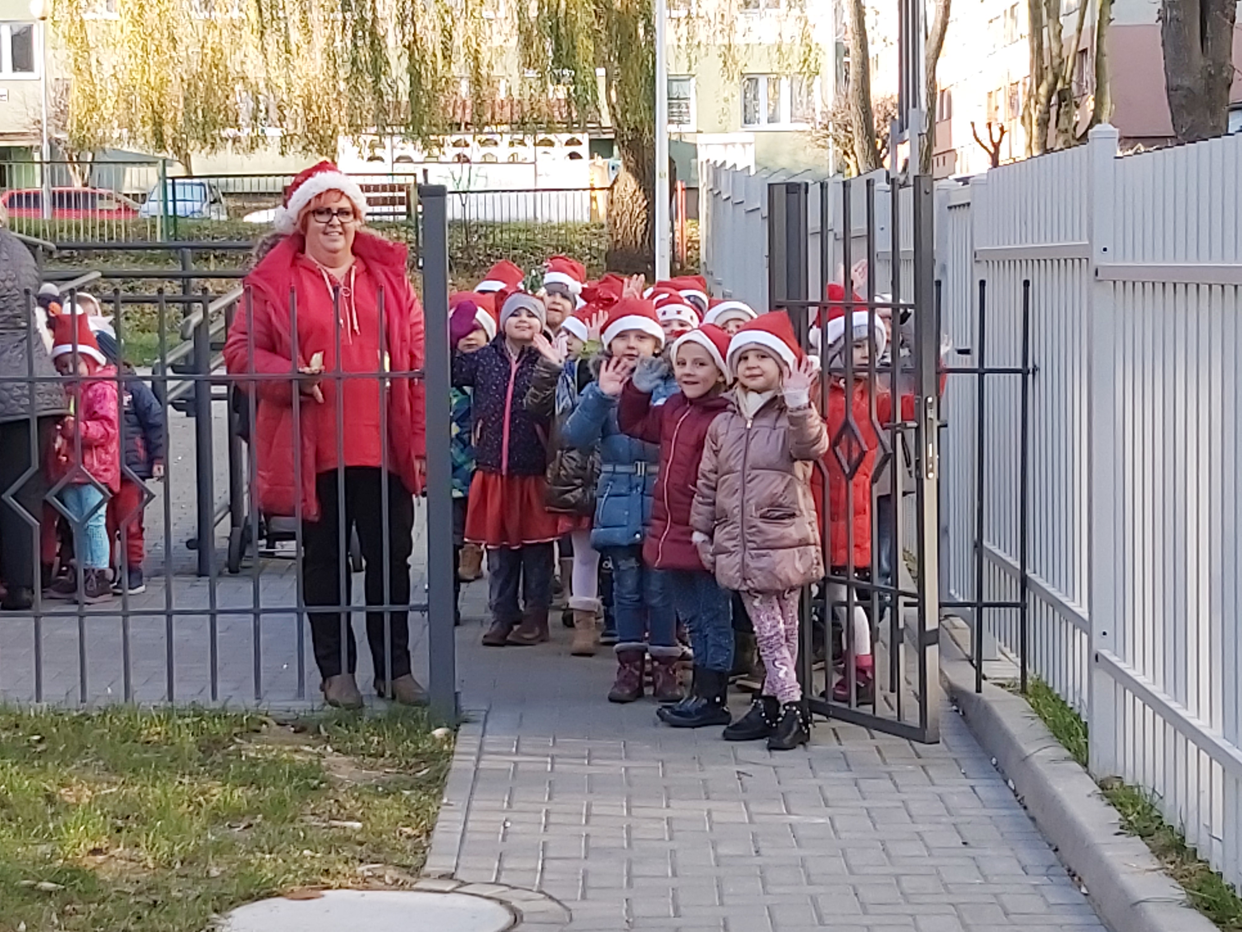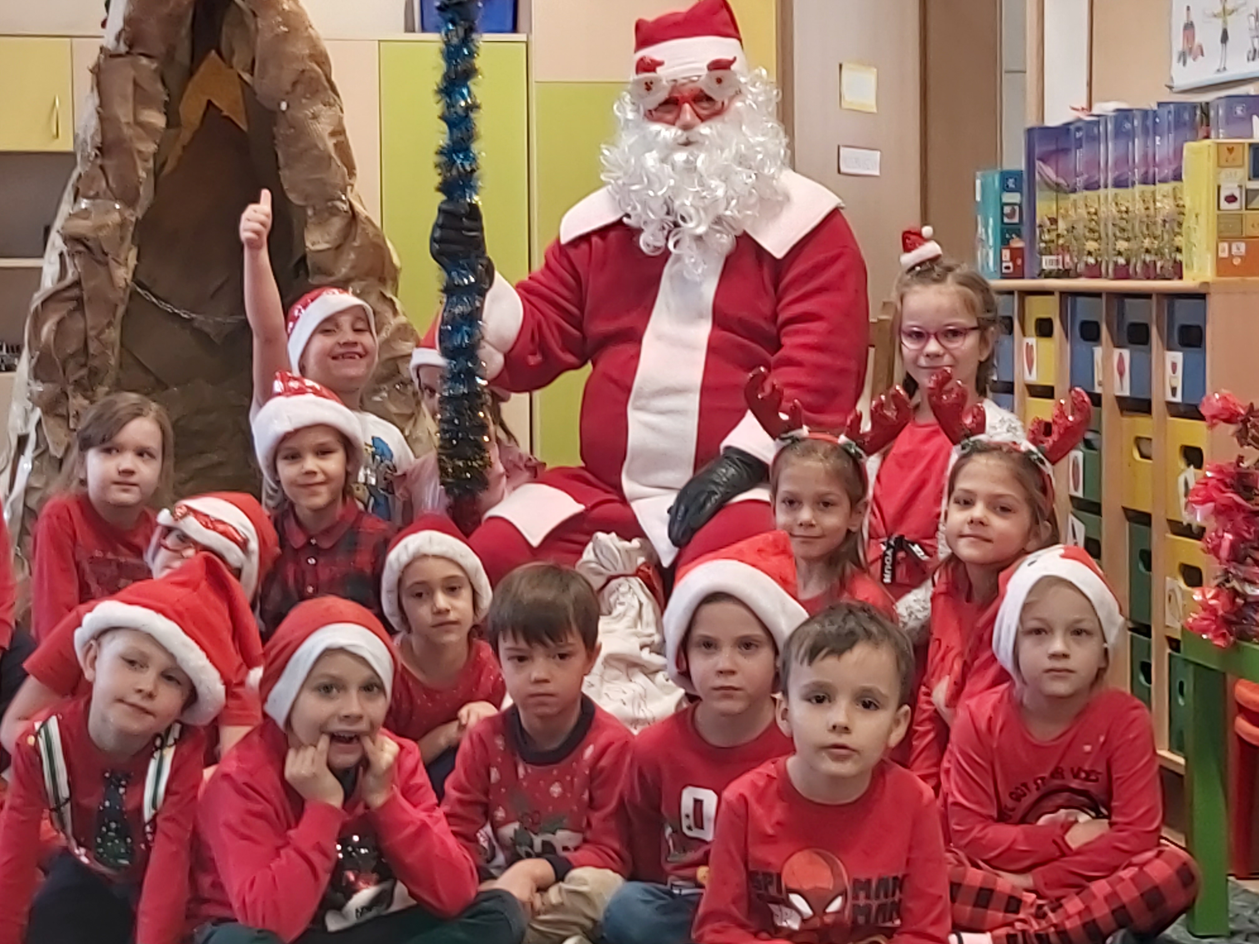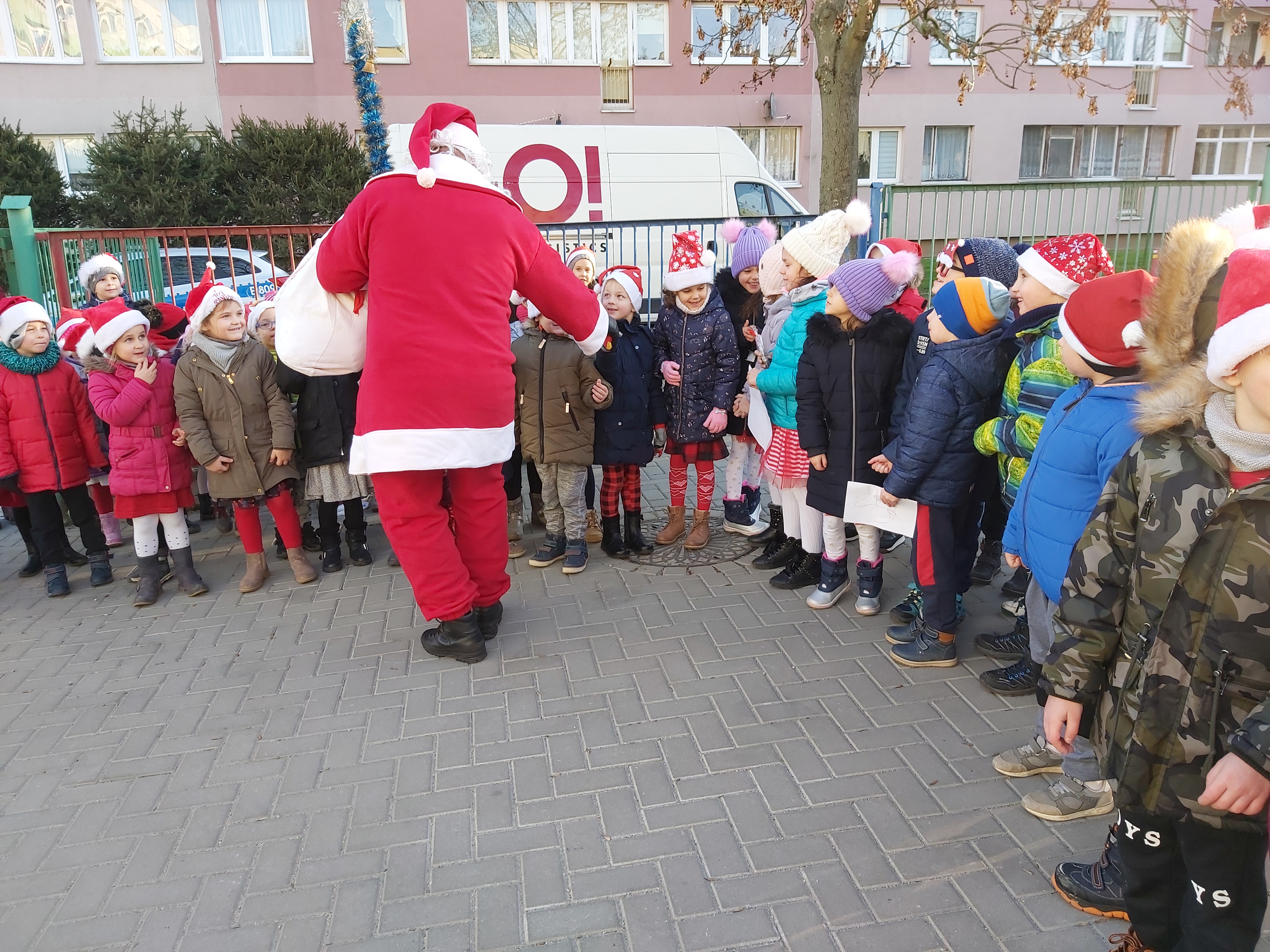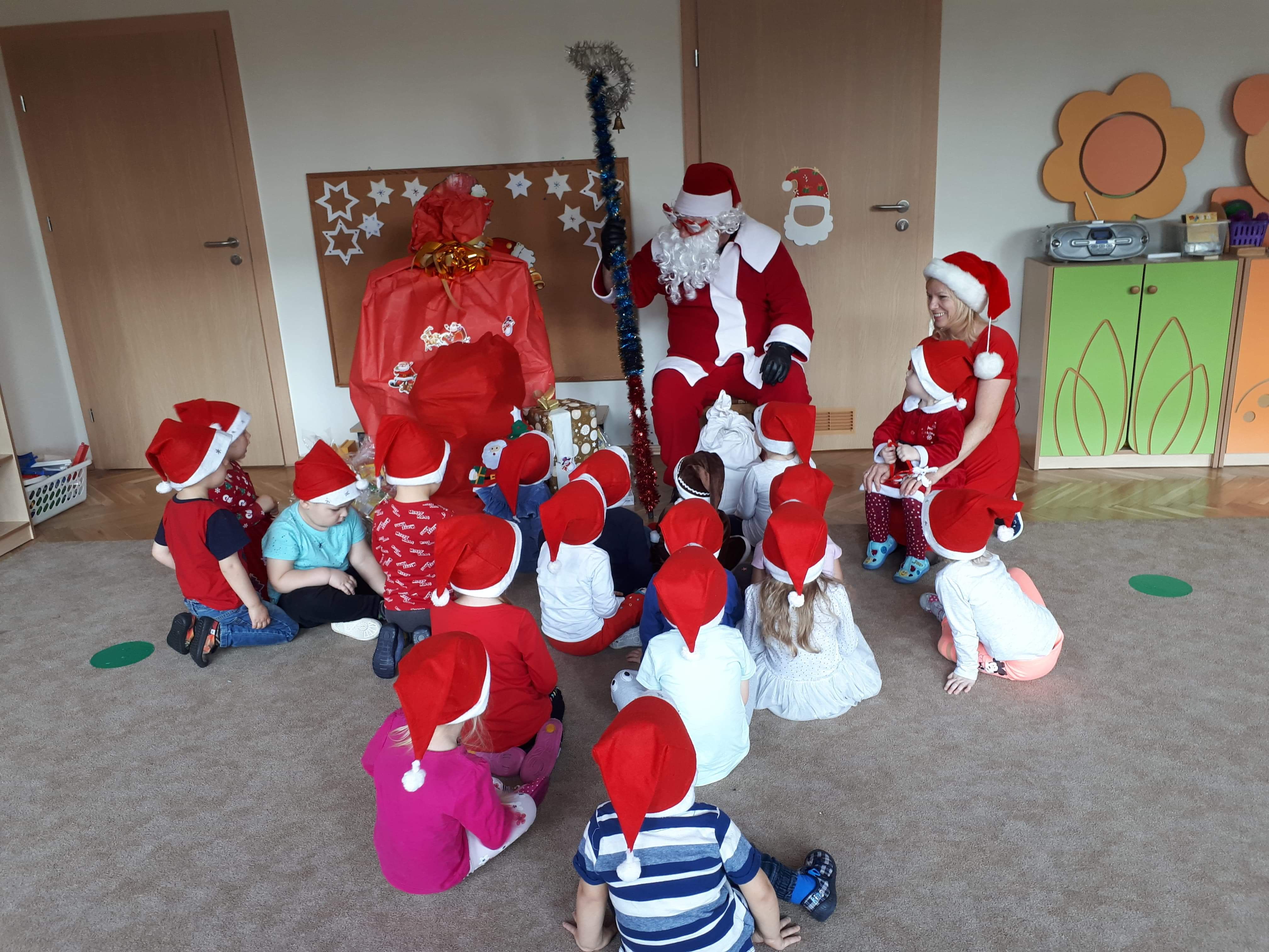 To nie mógł być nikt inny, tylko Mikołaj. Był wesoły, rozmowny, chętny do wspólnej zabawy i tańca. Chociaż nie było śniegu, to długo oczekiwany gość przybył na czas. We wszystkich grupach spotkanie przebiegało w radosnej i przyjemnej atmosferze. Przedszkolaki śpiewały Mikołajowi piosenki świąteczne, recytowały wiersze i zadawały mnóstwo pytań. Mikołaj obdarował wszystkie dzieci prezentami. Wszystkie buzie były uśmiechnięte ze spotkania z gościem.