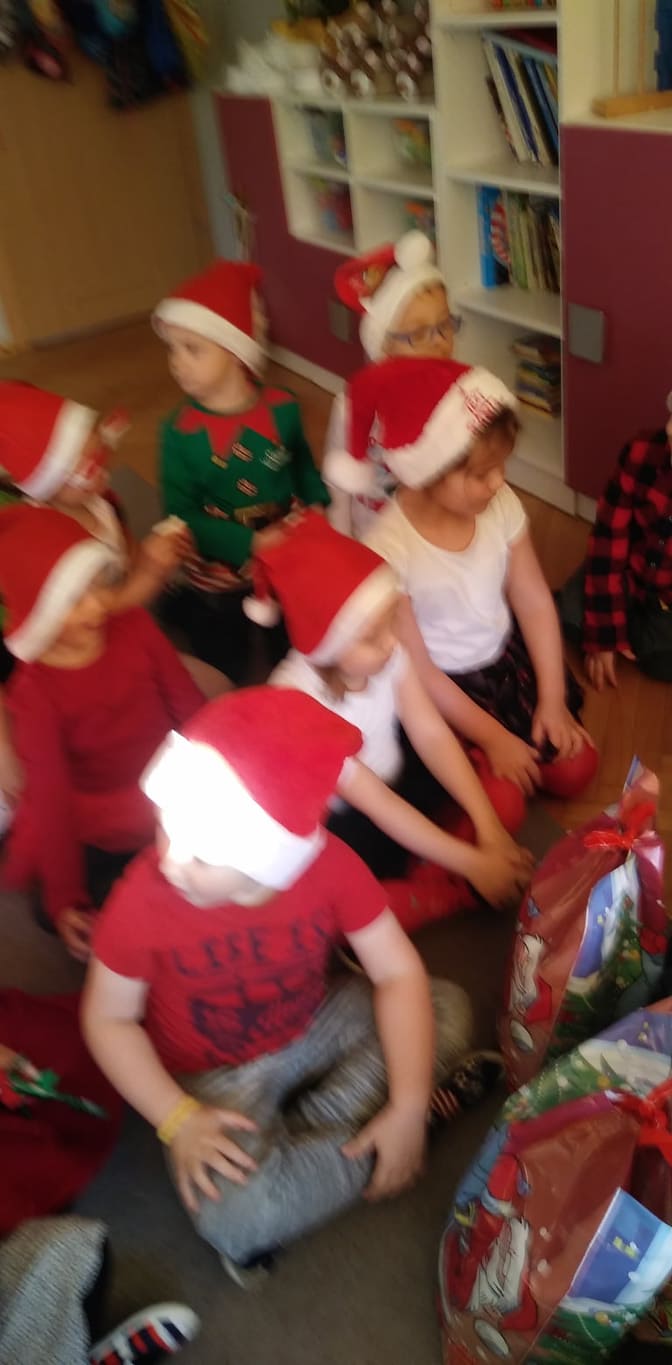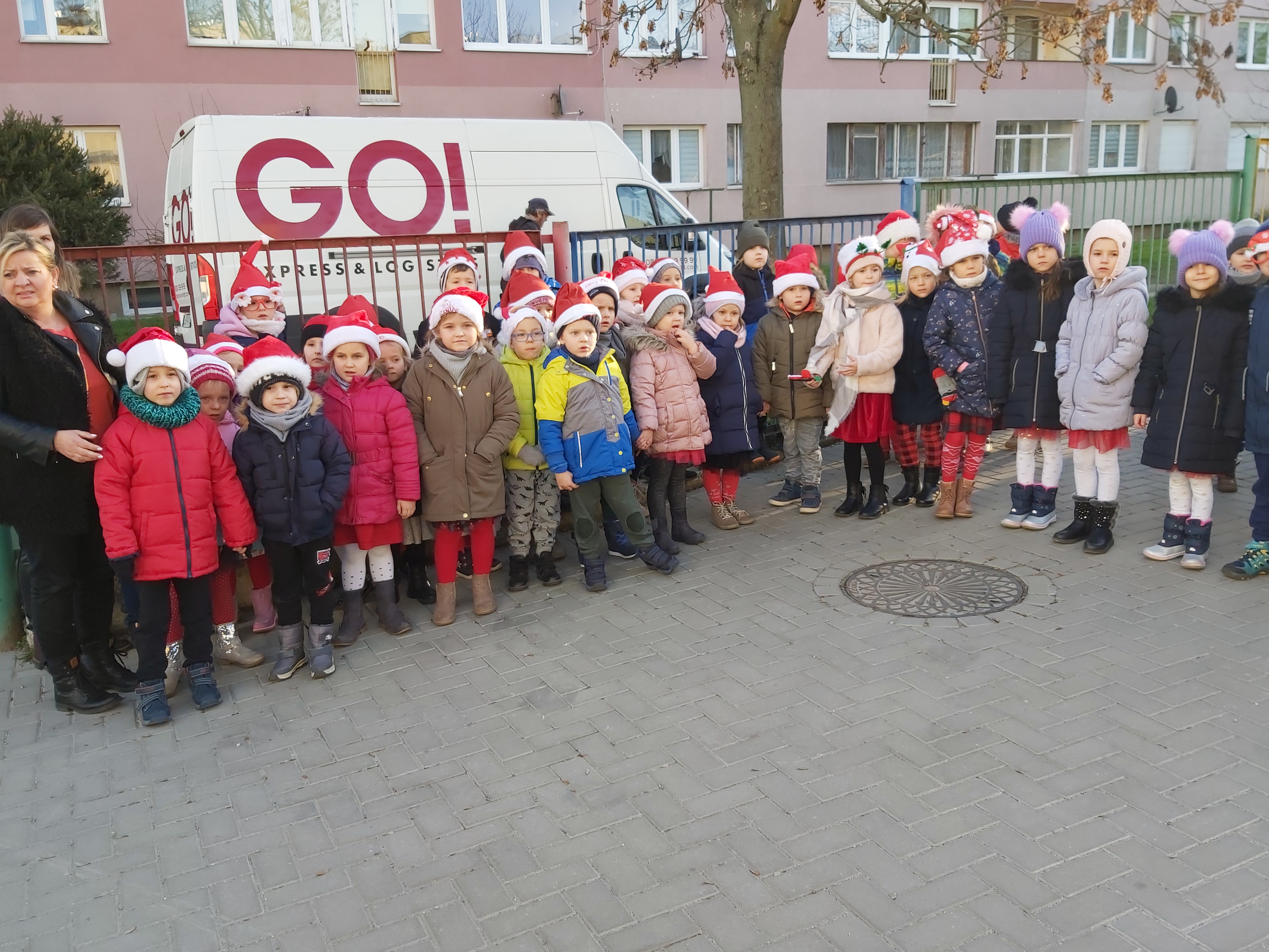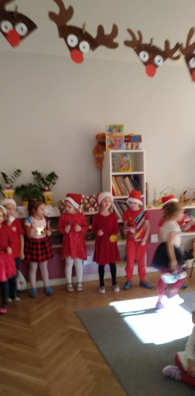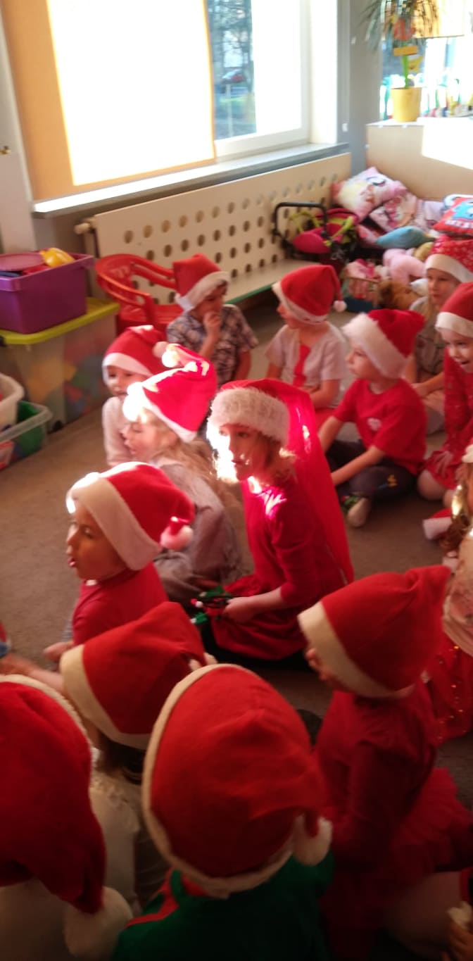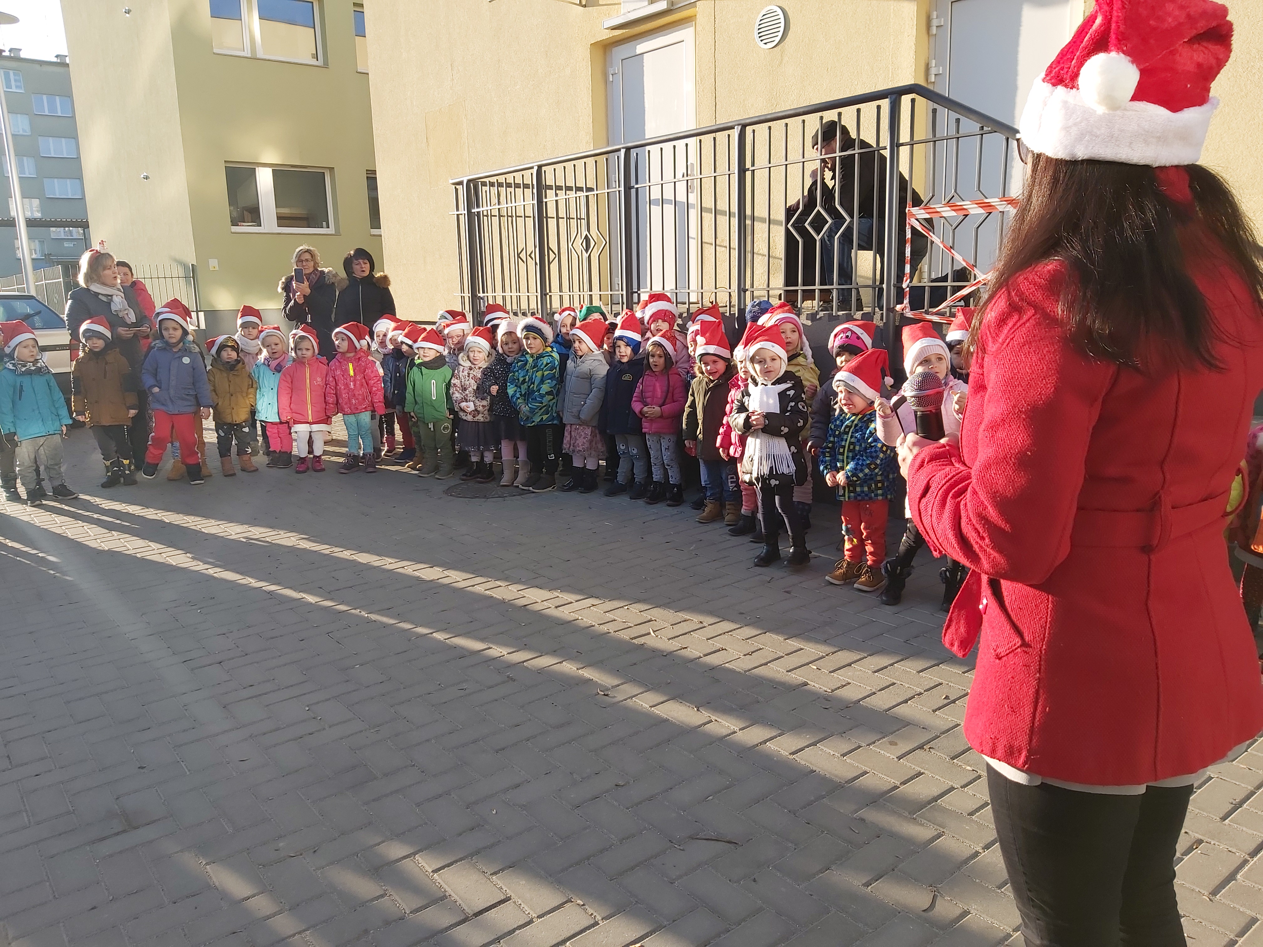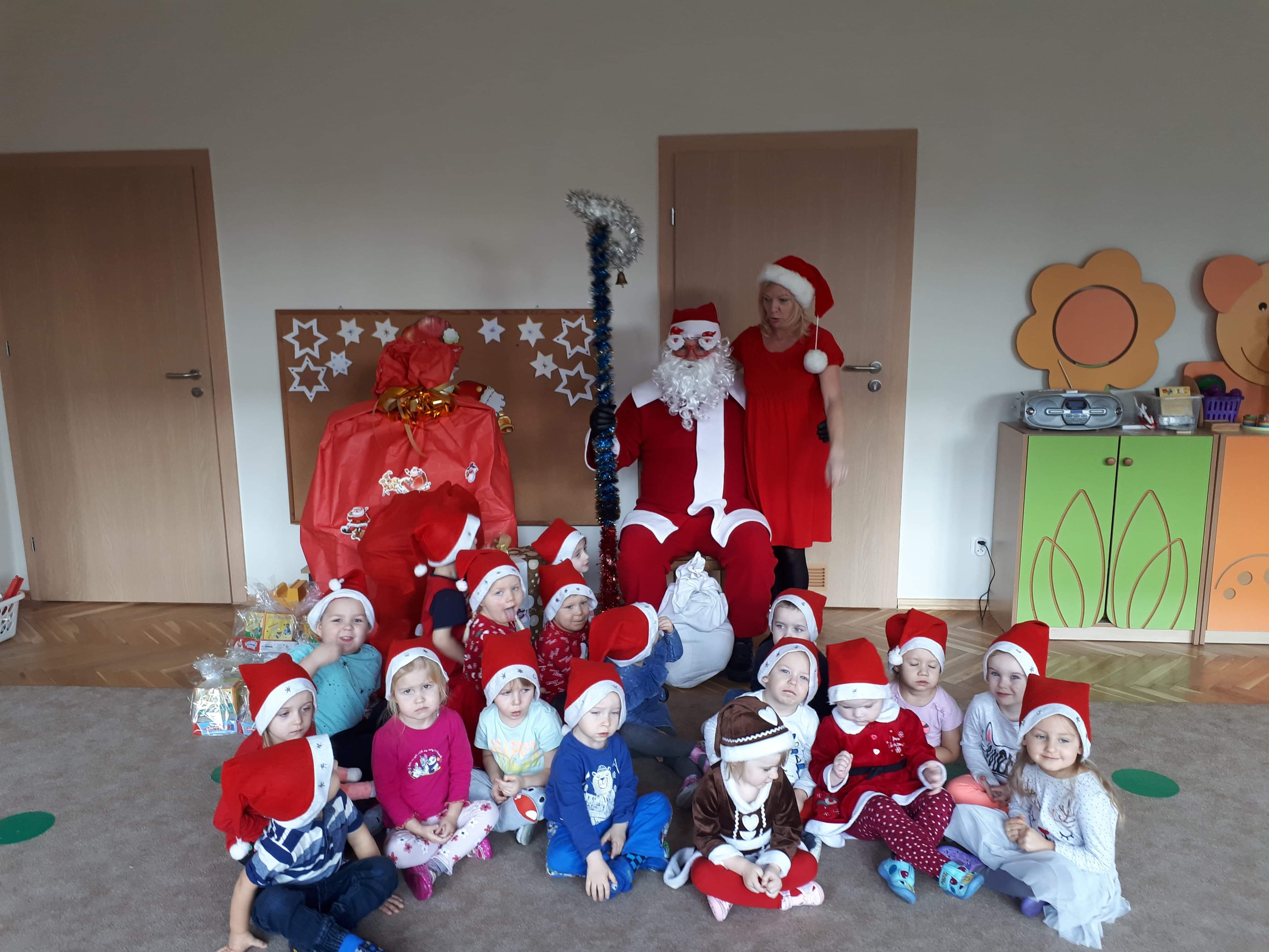To nie mógł być nikt inny, tylko Mikołaj. Był wesoły, rozmowny, chętny do wspólnej zabawy i tańca. Chociaż nie było śniegu, to długo oczekiwany gość przybył na czas. We wszystkich grupach spotkanie przebiegało w radosnej i przyjemnej atmosferze. Przedszkolaki śpiewały Mikołajowi piosenki świąteczne, recytowały wiersze i zadawały mnóstwo pytań. Mikołaj obdarował wszystkie dzieci prezentami. Wszystkie buzie były uśmiechnięte ze spotkania z gościem.