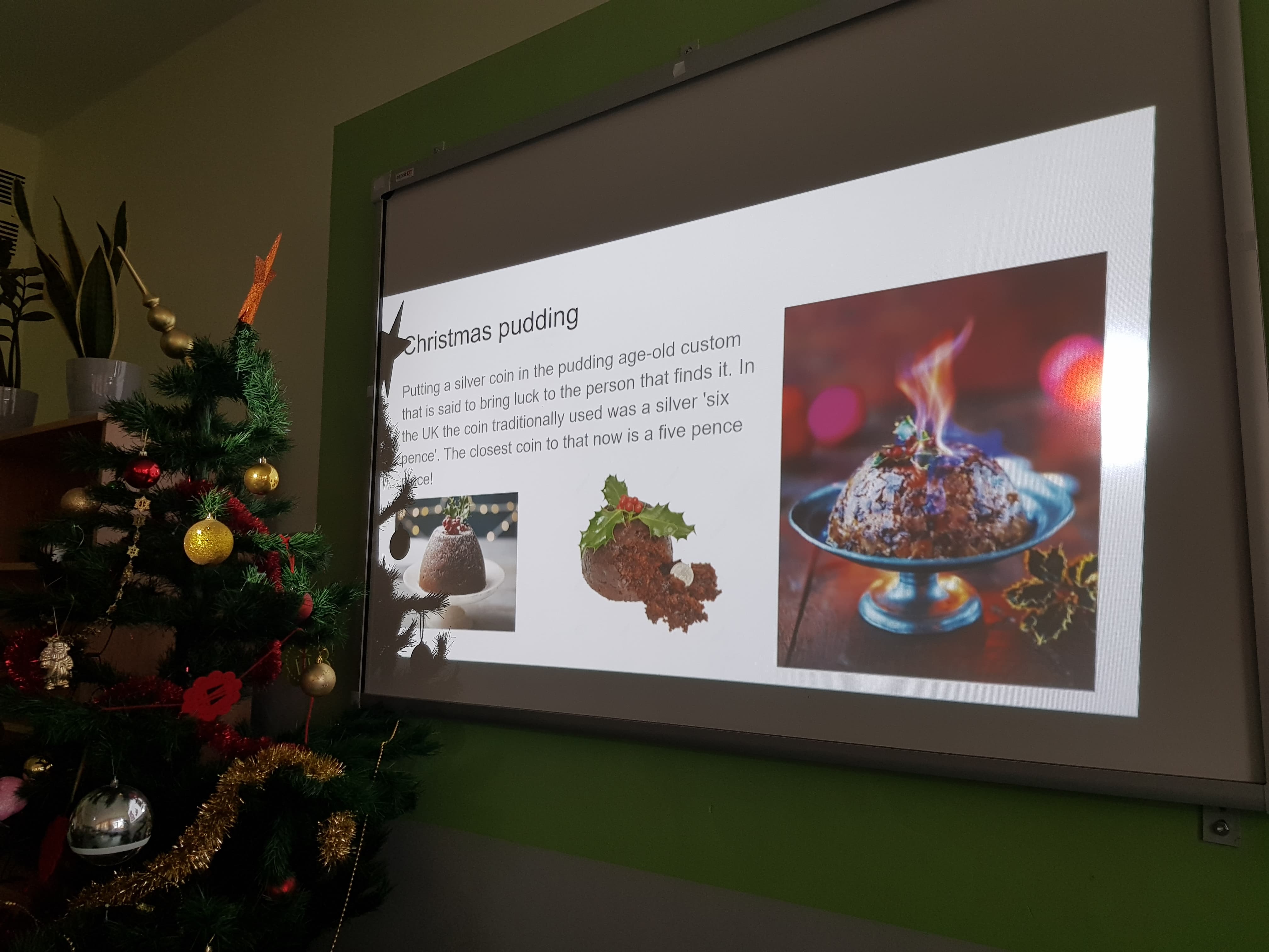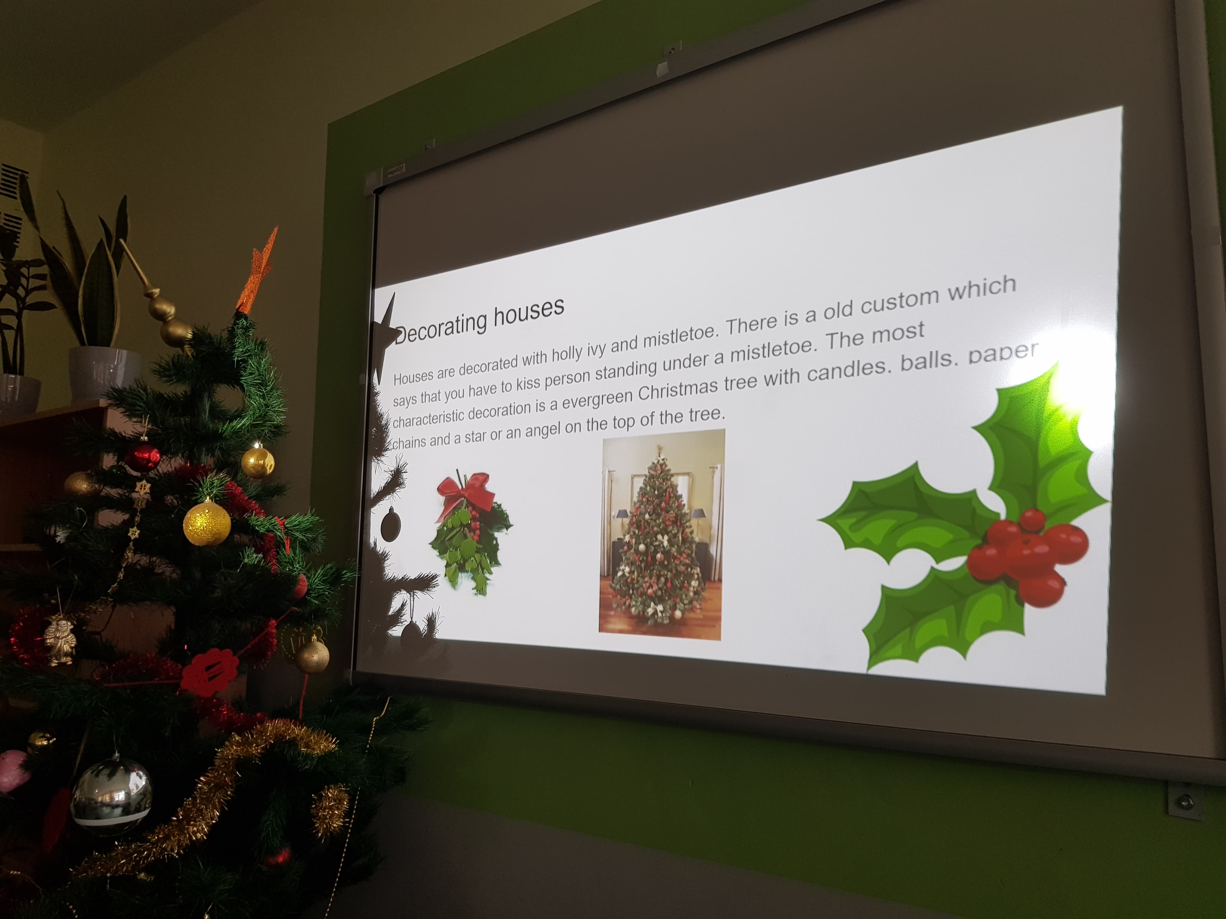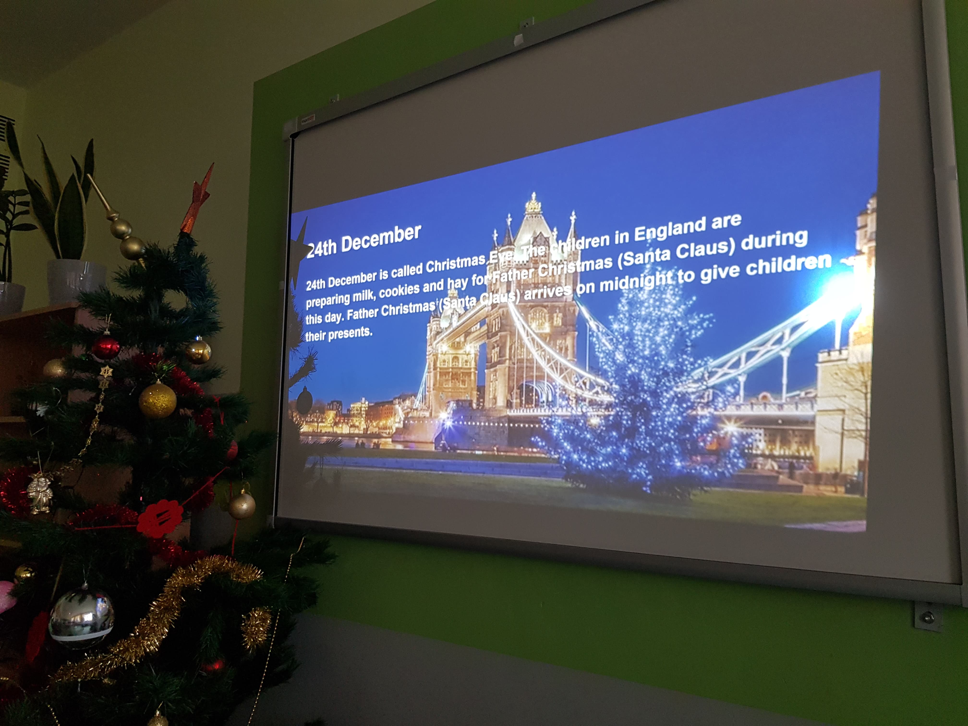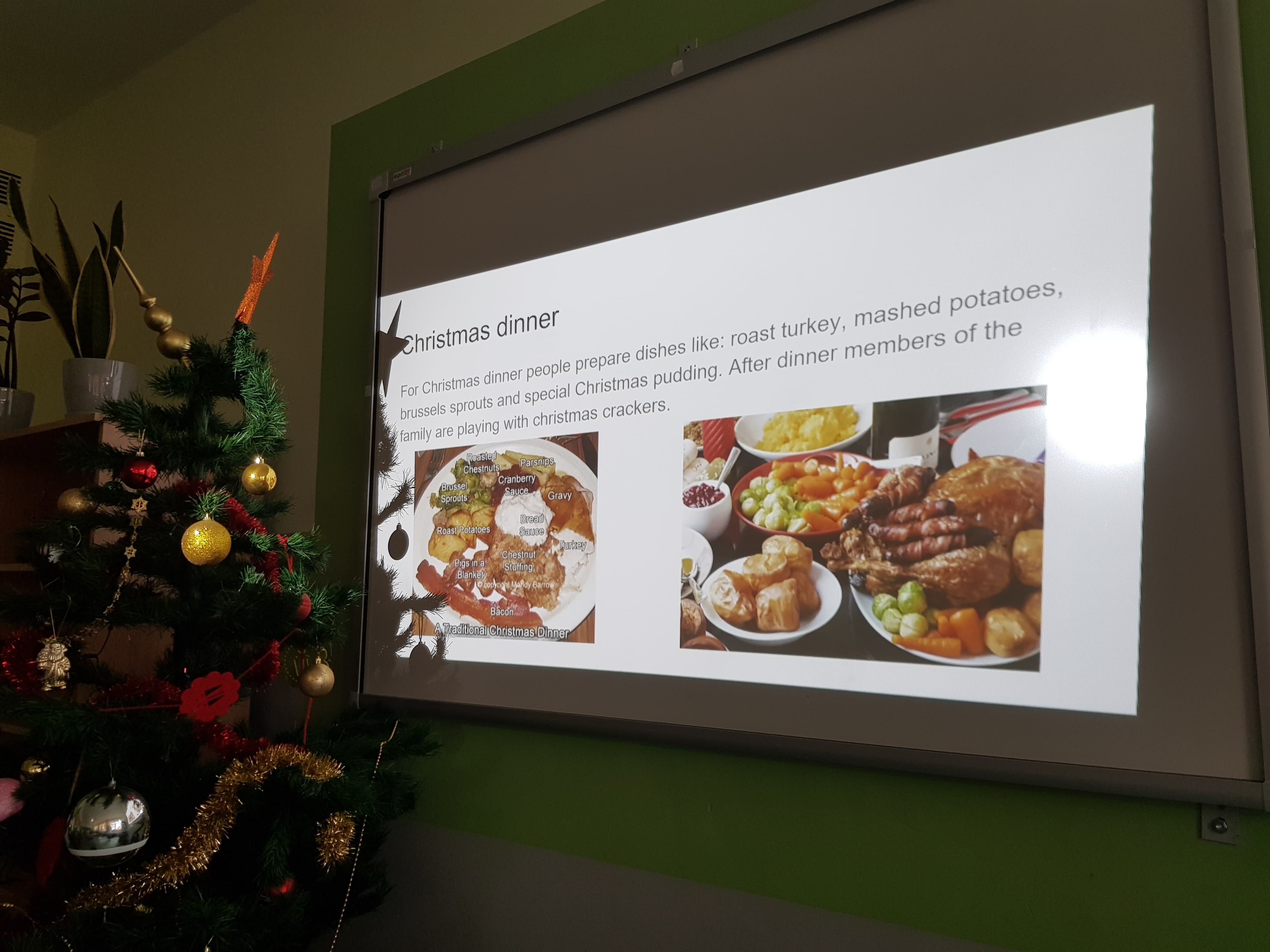 Uczniowie przyszli przebrani za elfy, mikołaje. Niektórzy mieli na sobie świąteczne sweterki. Następnie wysłuchali prezentacji dotyczącej zwyczajów związanych ze świętami w Anglii. Uczniowie poznali różnicę w obchodzeniu tego święta pomiędzy Polakami a Anglikami. Po krótkiej prezentacji obejrzeli kawałek odcinka słynnego serialu - Jaś Fasola (klasyczny humor brytyjski), świąteczne przemówienie Królowej Elżbiety II oraz film o ozdobach na ulicach Londynu. Uczniowie byli bardzo zainteresowani sposobem w jaki Anglicy obchodzą święta. Po prezentacji otrzymali kartki z tekstem znanej piosenki świątecznej “Last Christmas” zespołu Wham! i musieli uzupełnić luki. Dodatkowo w międzyczasie odbył się słodki, świąteczny poczęstunek w postaci ciasteczek.