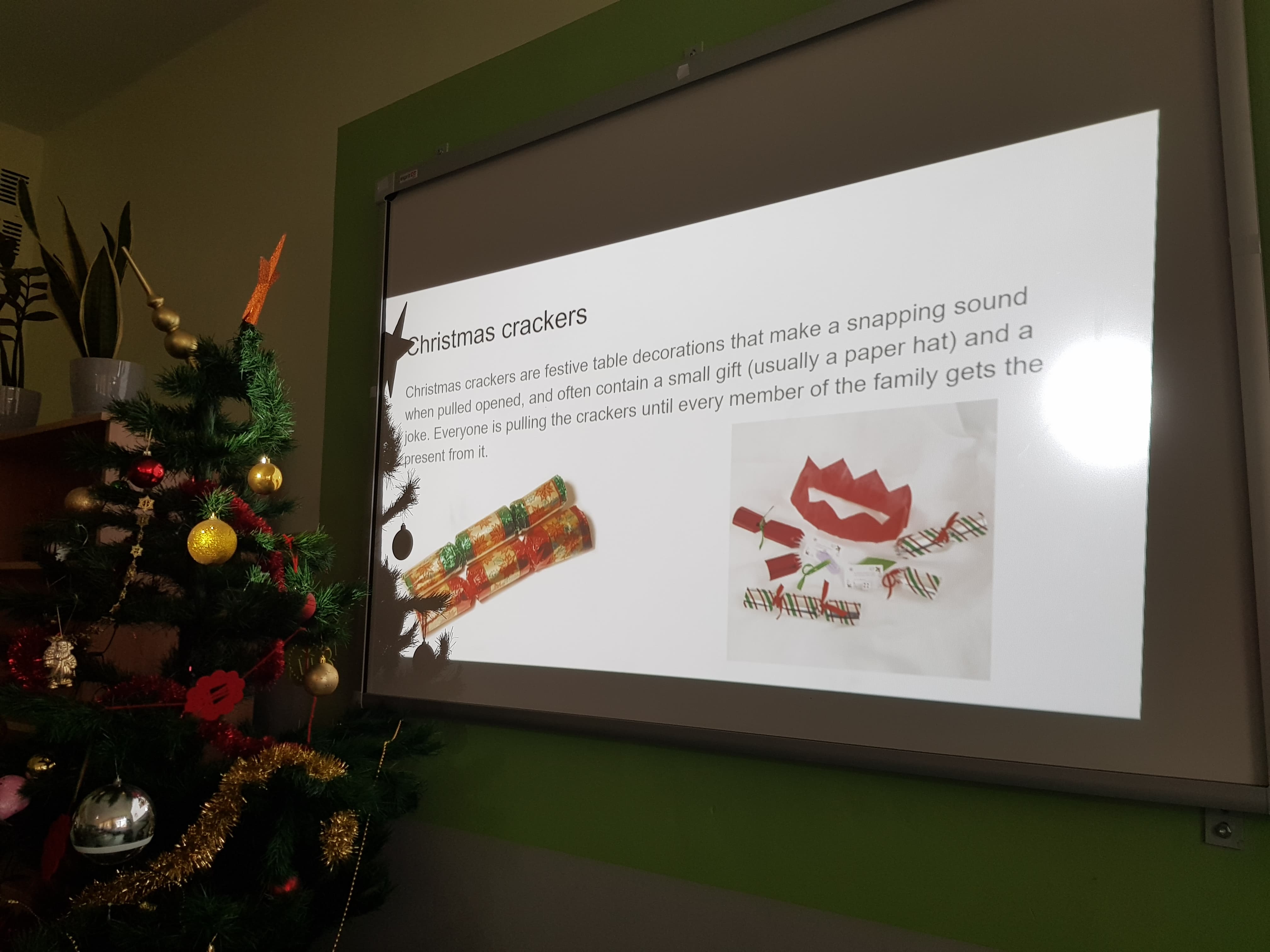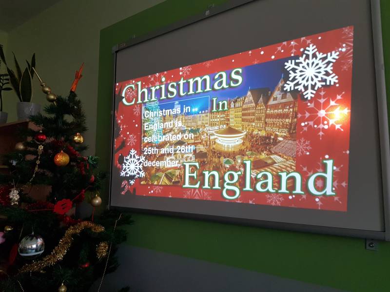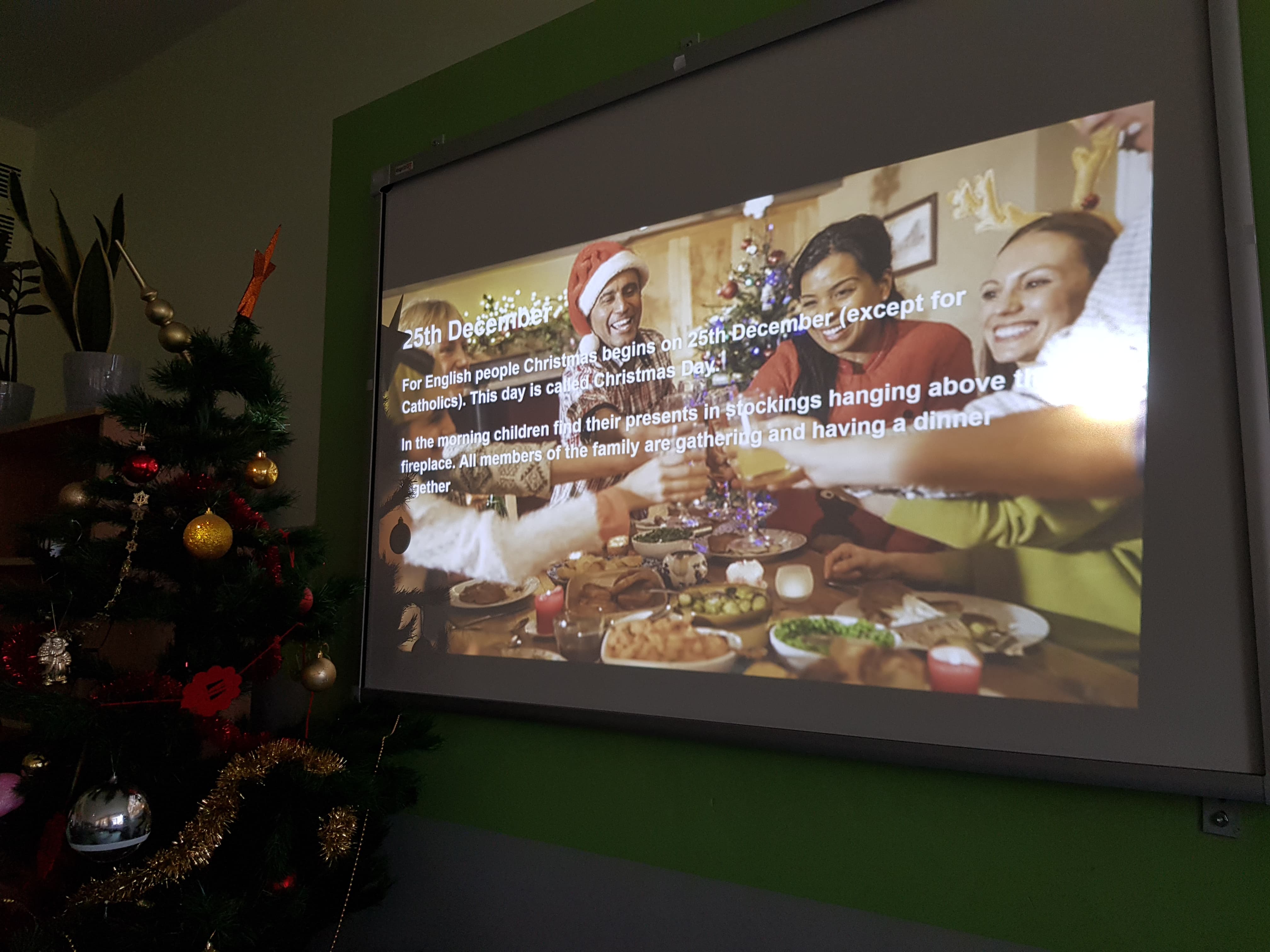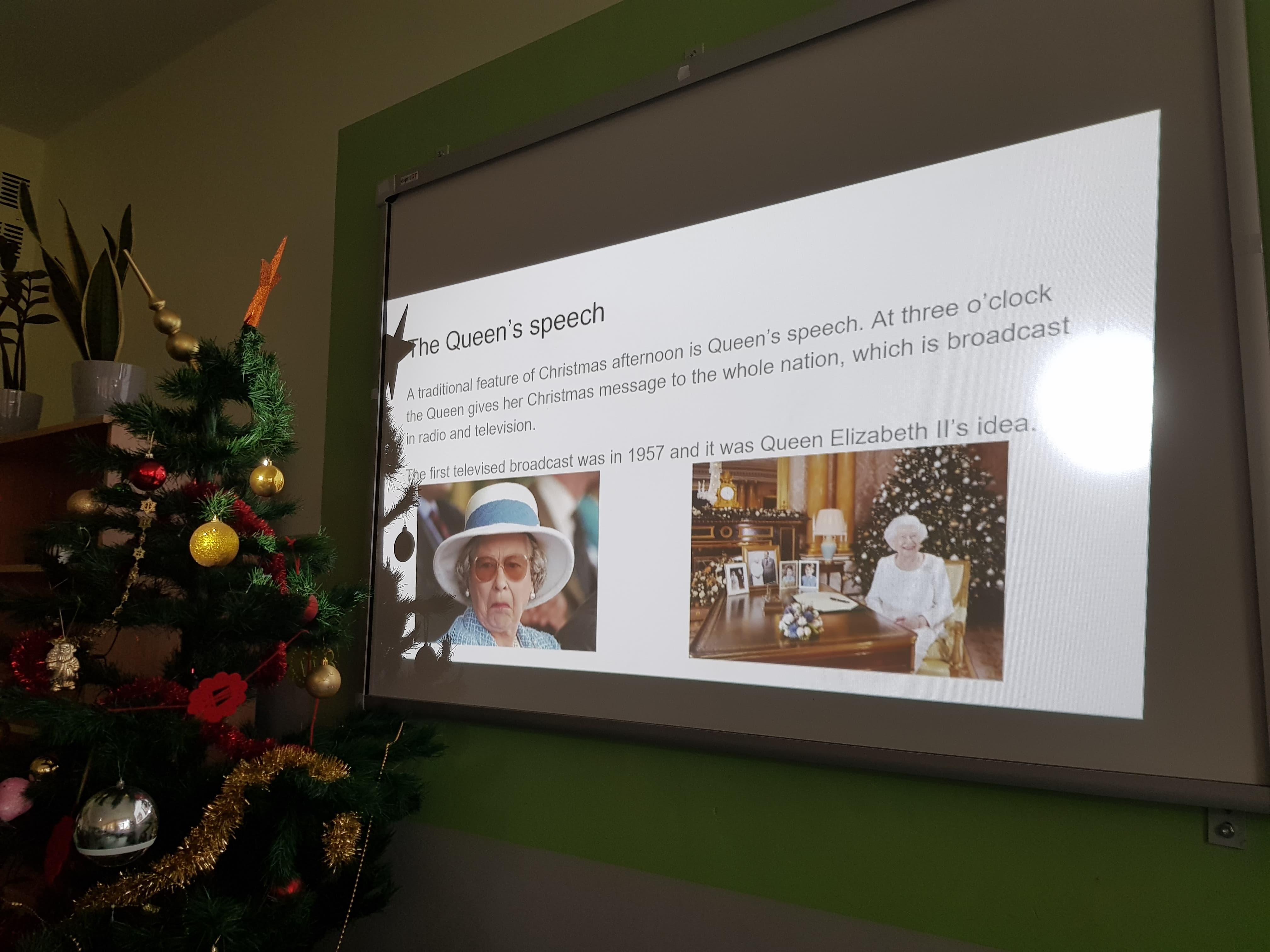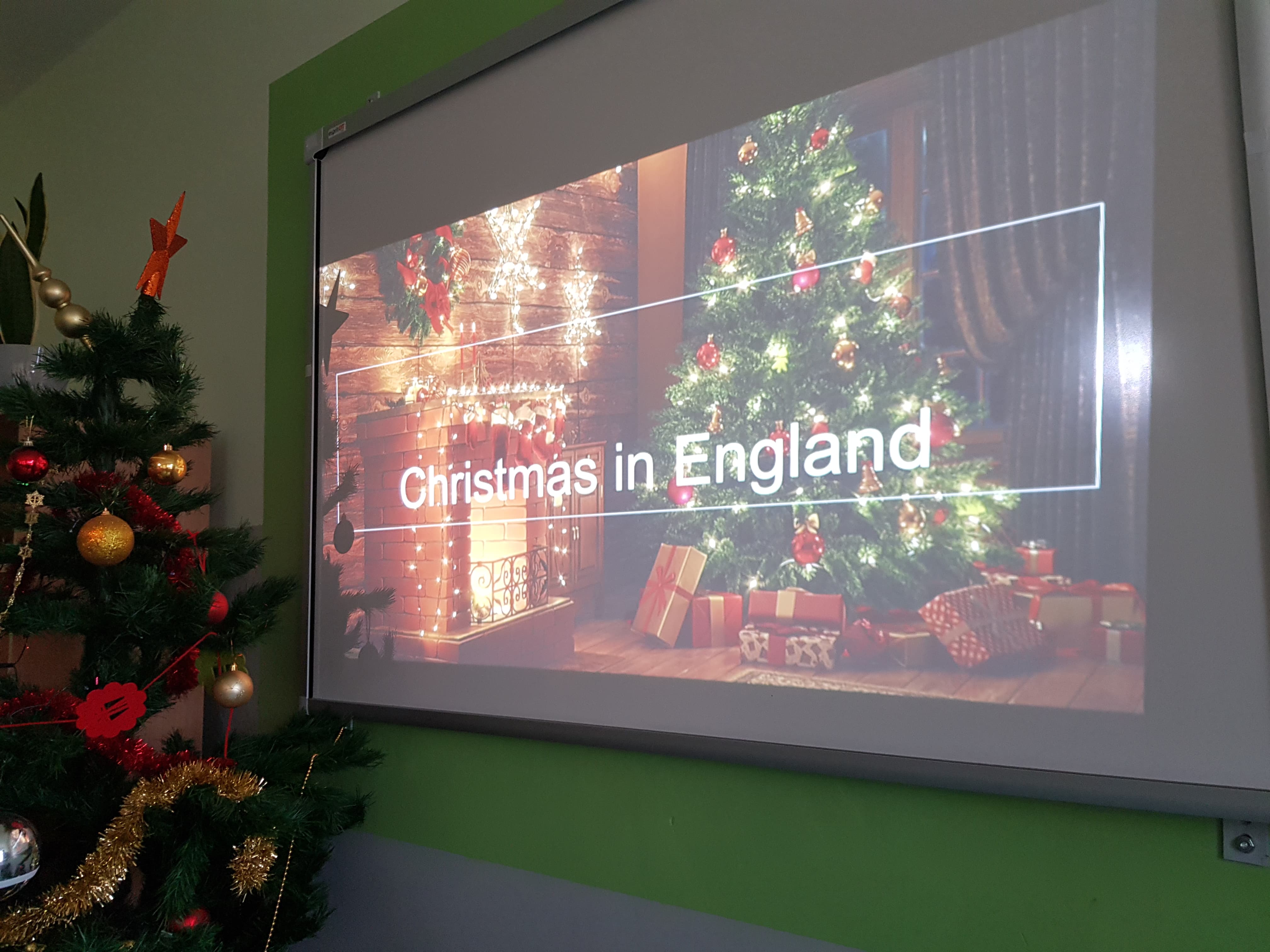 Uczniowie przyszli przebrani za elfy, mikołaje. Niektórzy mieli na sobie świąteczne sweterki. Następnie wysłuchali prezentacji dotyczącej zwyczajów związanych ze świętami w Anglii. Uczniowie poznali różnicę w obchodzeniu tego święta pomiędzy Polakami a Anglikami. Po krótkiej prezentacji obejrzeli kawałek odcinka słynnego serialu - Jaś Fasola (klasyczny humor brytyjski), świąteczne przemówienie Królowej Elżbiety II oraz film o ozdobach na ulicach Londynu. Uczniowie byli bardzo zainteresowani sposobem w jaki Anglicy obchodzą święta. Po prezentacji otrzymali kartki z tekstem znanej piosenki świątecznej “Last Christmas” zespołu Wham! i musieli uzupełnić luki. Dodatkowo w międzyczasie odbył się słodki, świąteczny poczęstunek w postaci ciasteczek.