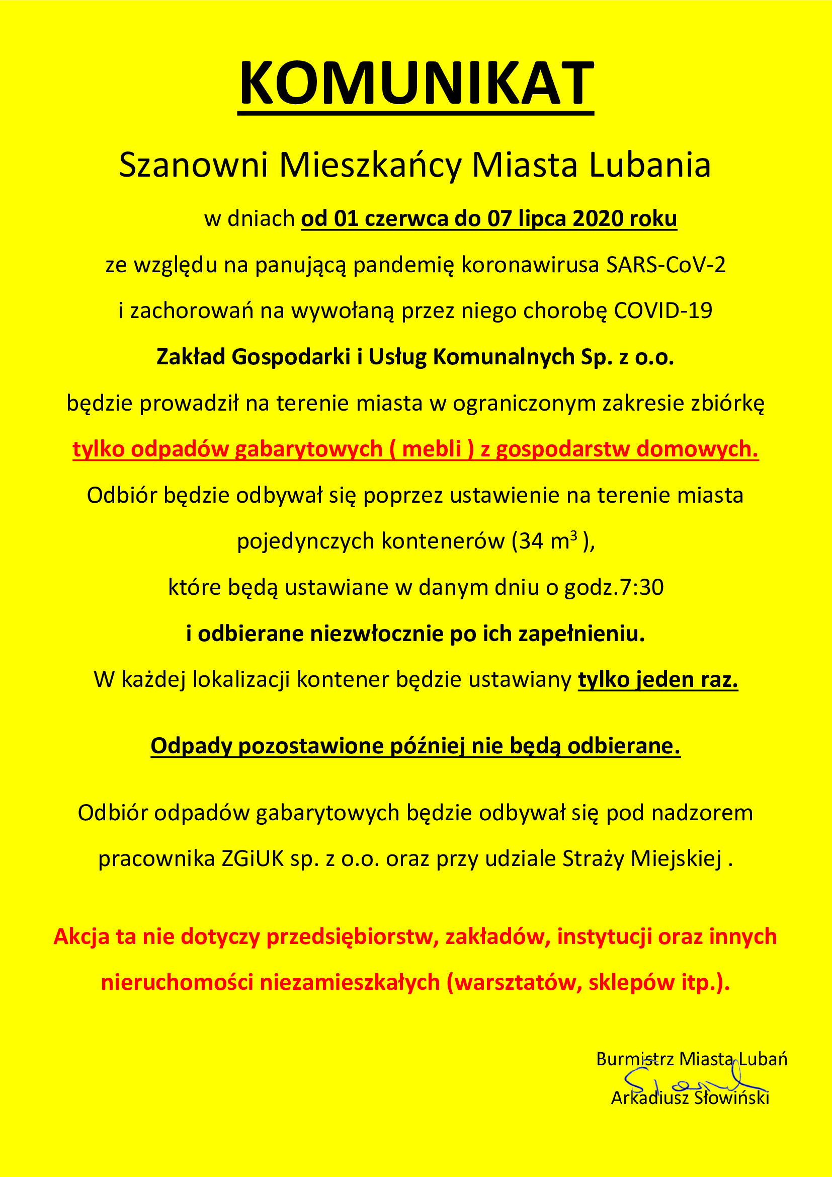 Odpady pozostawione później nie będą odbierane.