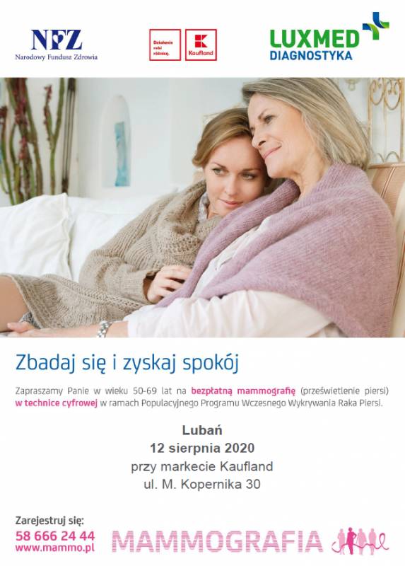 Mobilna pracownia mammograficzna LUX MED będzie do dyspozycji Pań w miejscowości: Lubań – 12 sierpnia 2020 w godzinach od 9.00 do 17.00 przy markecie Kaufland, ul. M. Kopernika 30
