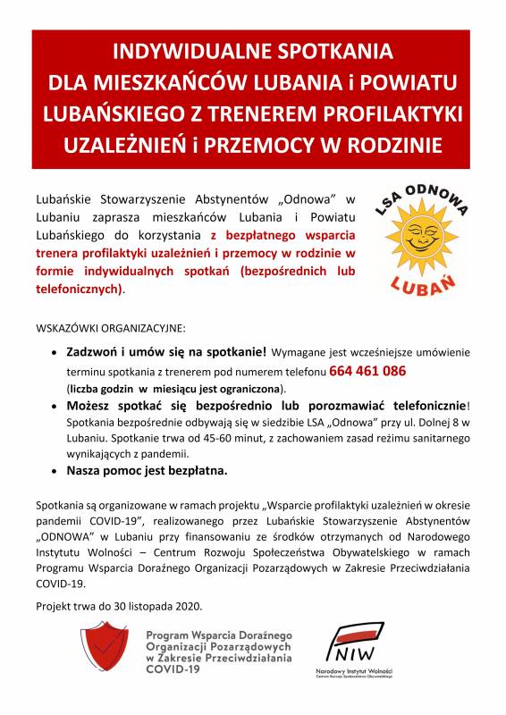 Lubańskie Stowarzyszenie Abstynentów „Odnowa” w Lubaniu zaprasza mieszkańców Lubania i Powiatu Lubańskiego do korzystania z bezpłatnego wsparcia trenera profilaktyki uzależnień i przemocy w rodzinie w formie indywidualnych spotkań (bezpośrednich lub telefonicznych).