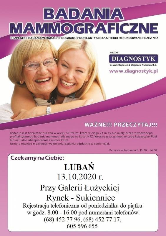 13 października 2020 r. przy Galerii Łużyckiej przeprowadzane będą bezpłatne badania mammograficzne dla kobiet w wieku od 50 do 69 lat, które w ciągu ostatnich dwóch lat nie miały wykonywanych tego typu badań.
