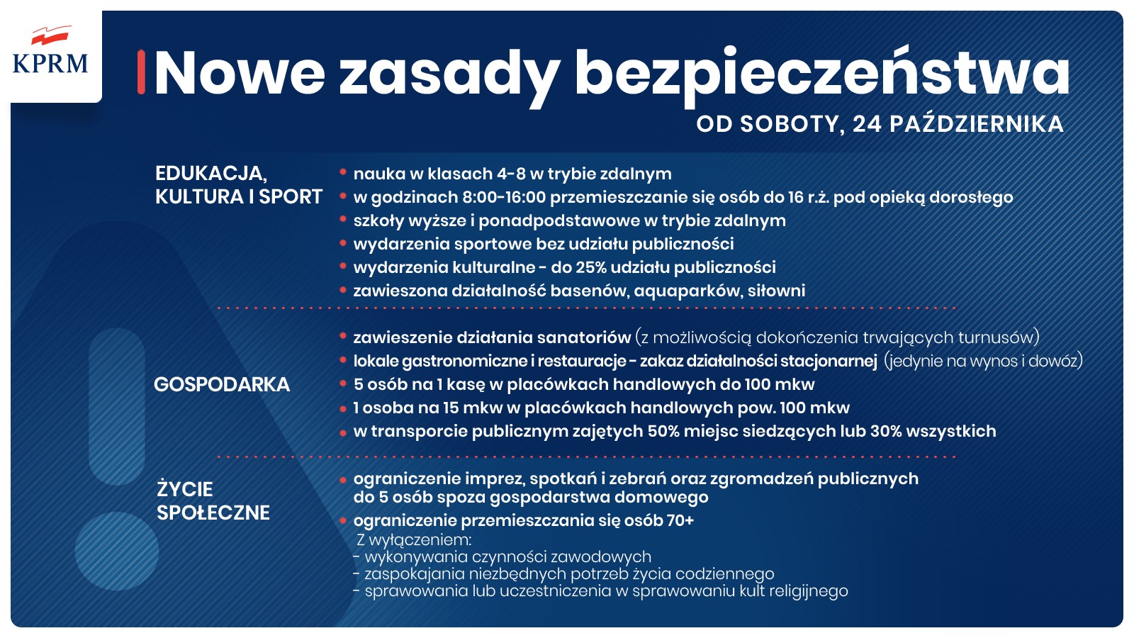 Od 24 października obostrzenia dotyczące strefy czerwonej będą obowiązywać w całej Polsce. Dodatkowo wprowadzamy nowe zasady bezpieczeństwa w zakresie edukacji, gospodarki oraz życia społecznego. Będą to: