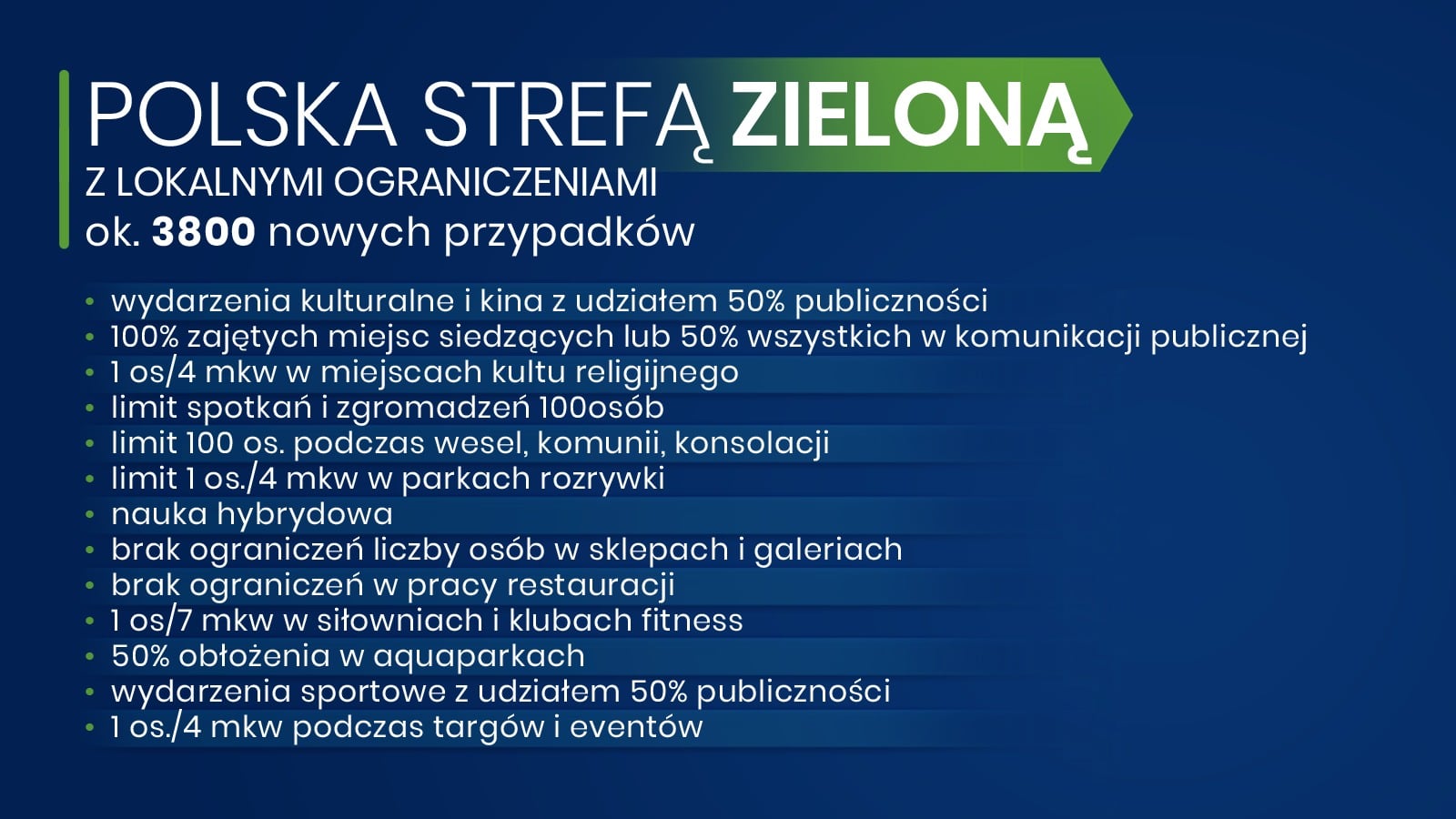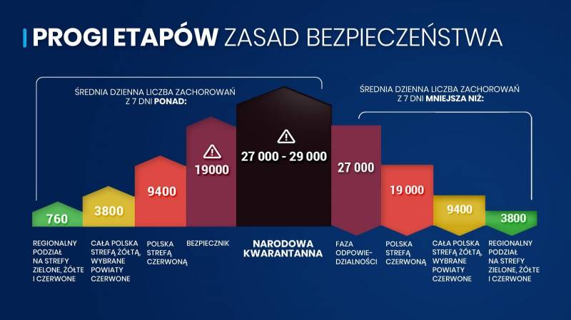 - etapu stabilizacji, czyli powrotu do podziału Polski na trzy nowe strefy – czerwoną, żółtą i zieloną (najwcześniej od 28.12 – zależnie od sytuacji epidemicznej),