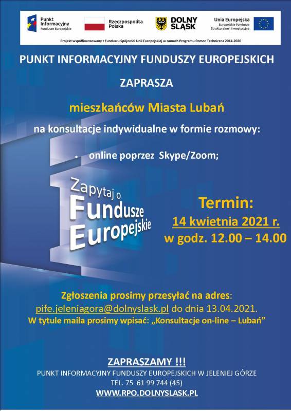 Zapytaj o fundusze europejskie! Punkt Informacyjny Funduszy Europejskich w Jeleniej Górze zaprasza mieszkańców Lubania do skorzystania z bezpłatnych konsultacji indywidualnych na temat wsparcia ze środków Funduszy Europejskich.