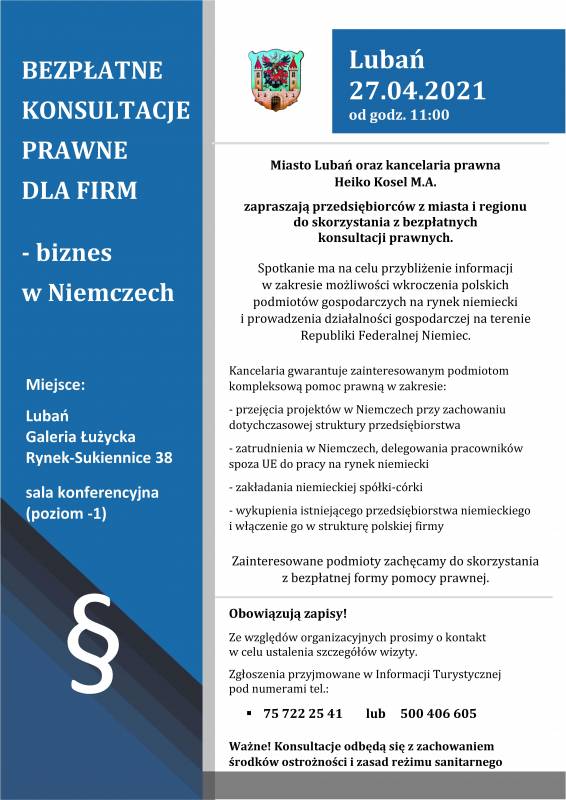 Miasto Lubań oraz kancelaria prawna Heiko Kosel M.A. zapraszają przedsiębiorców z miasta i regionu do skorzystania z bezpłatnych konsultacji prawnych.