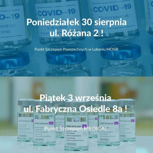 W poniedziałek 30 sierpnia Punkt Szczepień Powszechnych w Lubaniu po raz ostatni przeprowadził akcję szczepienną w siedzibie Miejskiego Ośrodka Sportu i Rekreacji przy ul. Różanej. Od piątku 3 września szczepienia odbywać się będą w przychodni lekarskiej MEDICAL przy ul. Fabryczna Osiedle.