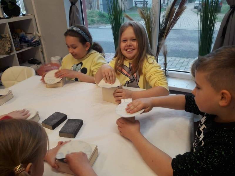 Tematem przewodnim zajęć było wykonanie skrzyneczek na przechowywanie swoich skarbów metodą decoupage. Decoupage to metoda zdobnicza polegająca na przyklejaniu specjalnie do tego przeznaczonych papierów lub serwetek na odpowiednio przygotowane powierzchnie. Efekt, jaki daje ta technika, ma przypominać wzory malowane pędzlem. Ogromną zaletą tej techniki jest to, że w bardzo prosty sposób, nawet bez szczególnych umiejętności plastycznych, pozwala stworzyć coś pięknego czego dowodem są nasze piękne pamiątki z zajęć. Włożyliśmy w nie wiele pracy, a sama technika nauczyła nas cierpliwości oraz czekania na efekty poprzez dokładne wykonywanie poleceń Pani Danieli. Oprócz pięknych pamiątek mogliśmy, także zrelaksować się na łóżku wodnym, doświadczać sensorycznie, a także pouczyć dzięki magicznemu dywanowi.