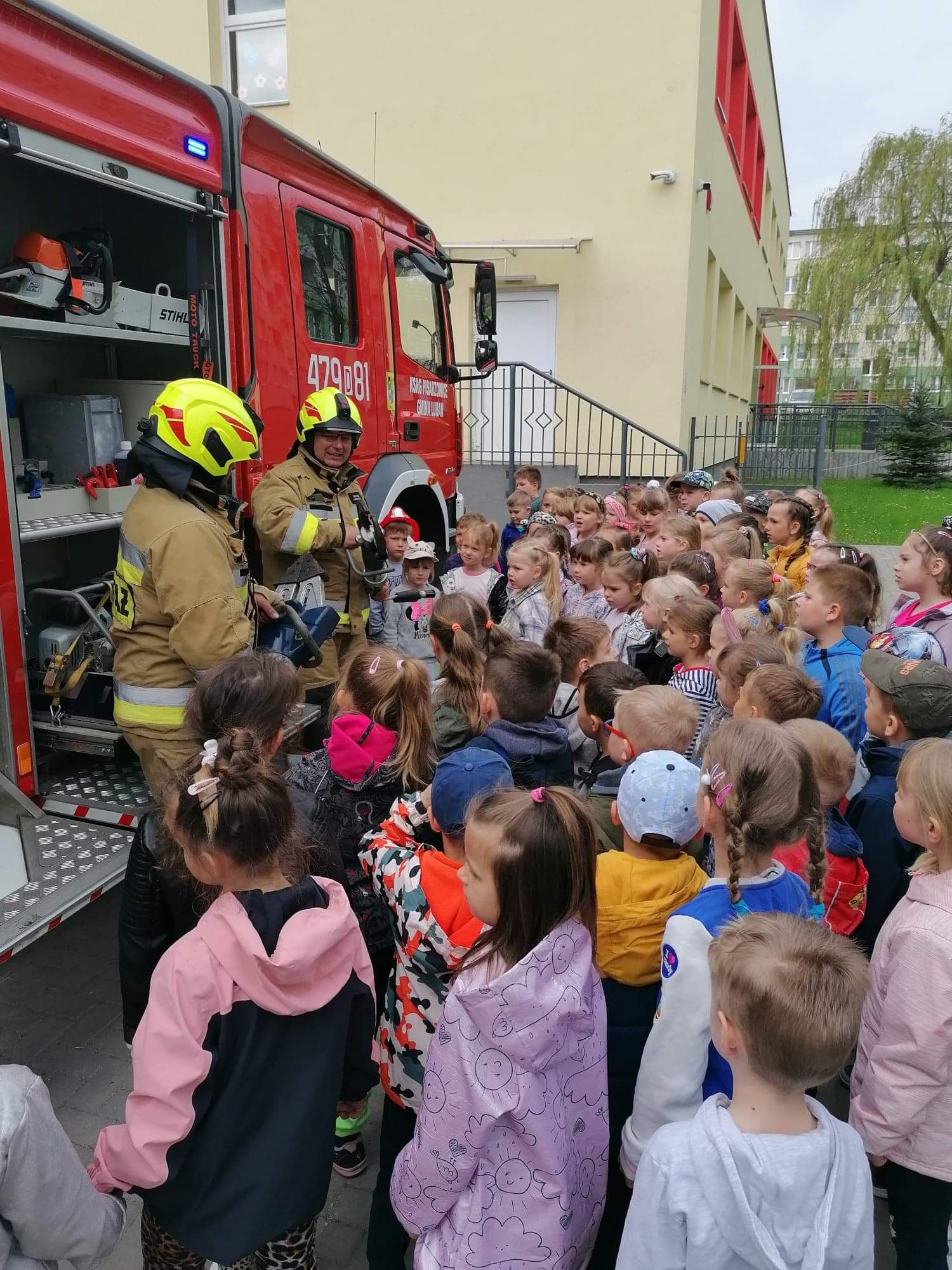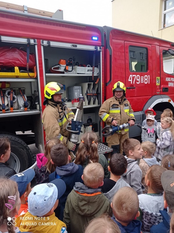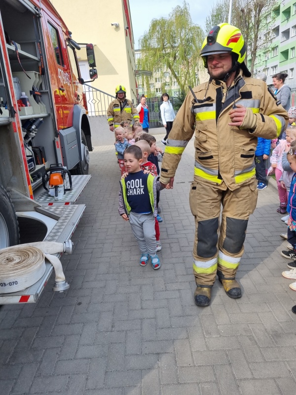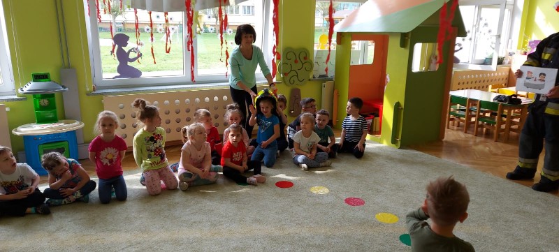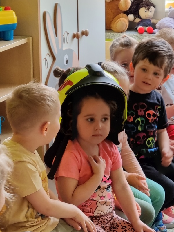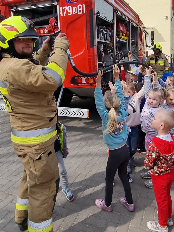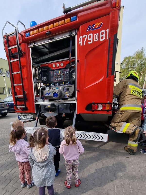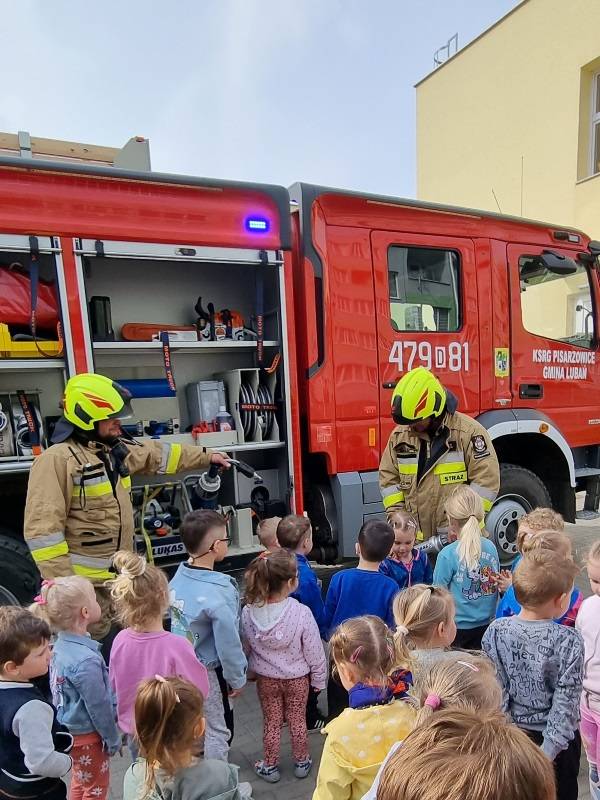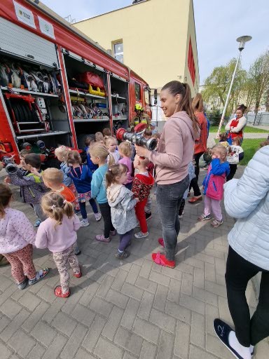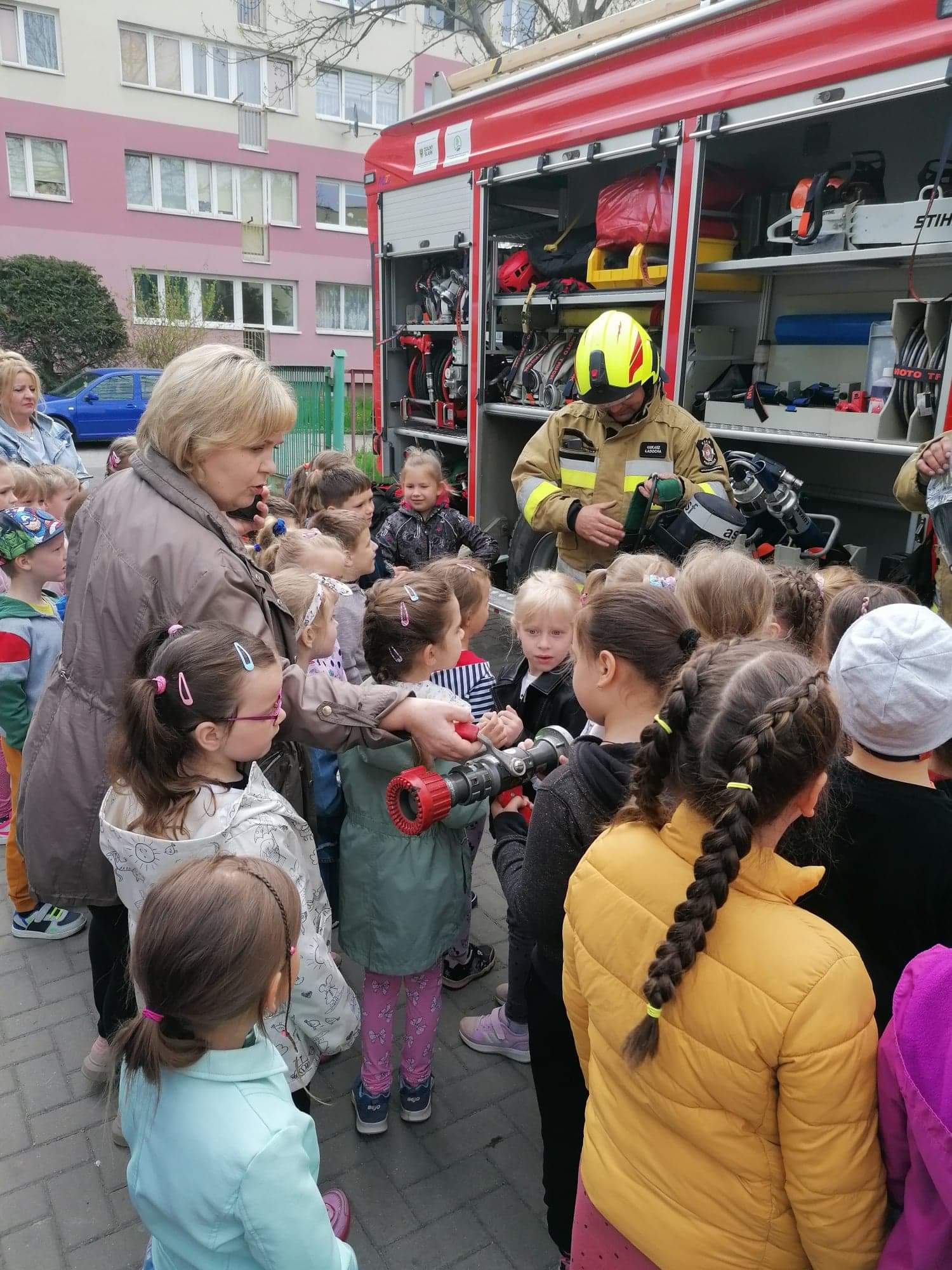 Prezentowano strój i podręczny sprzęt strażacki. W trakcie spotkania dzieci dowiedziały się, że praca strażaka nie polega tylko na gaszeniu pożarów, ale również na udzielaniu pomocy podczas wypadków samochodowych oraz w asyście podczas różnych akcji. Zaproszeni goście zapoznali przedszkolaków z sytuacjami, w których należy wezwać straż pożarną i korzystania z numeru 112. Można było z bliska podziwiać wóz strażacki, oraz jego wyposażenie wykorzystywane podczas akcji. Dzieci przymierzały hełm strażacki, trzymały wąż strażacki i wchodziły do wozu. Wizyta strazaków utrwaliła wiedzę dzieci w zakresie bezpieczeństwa.