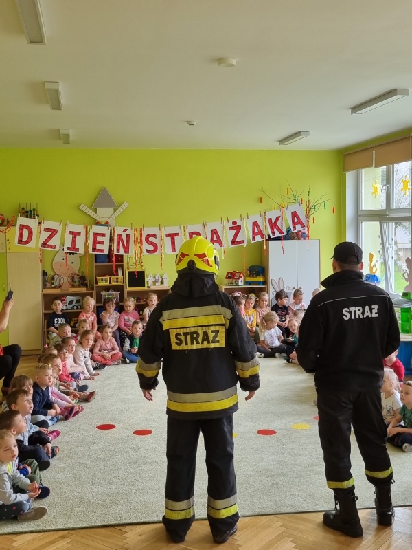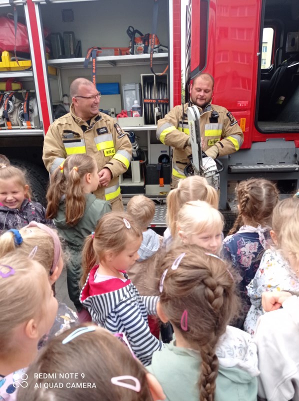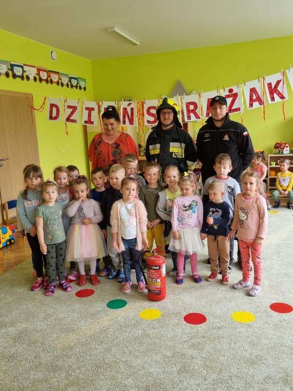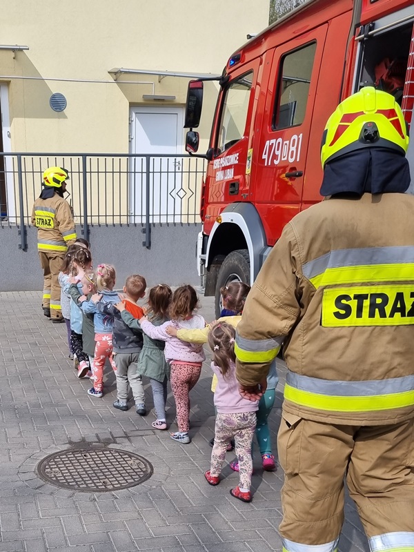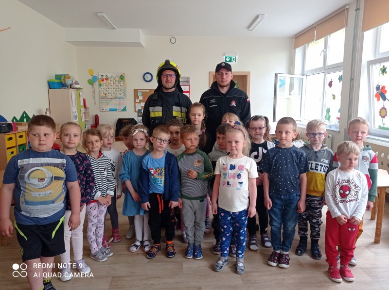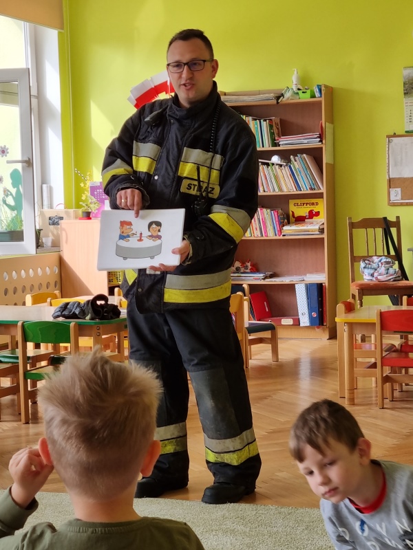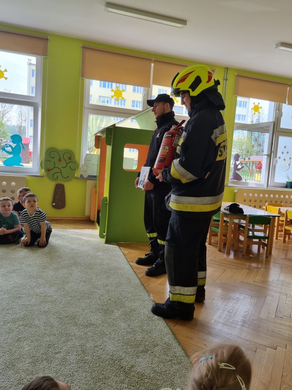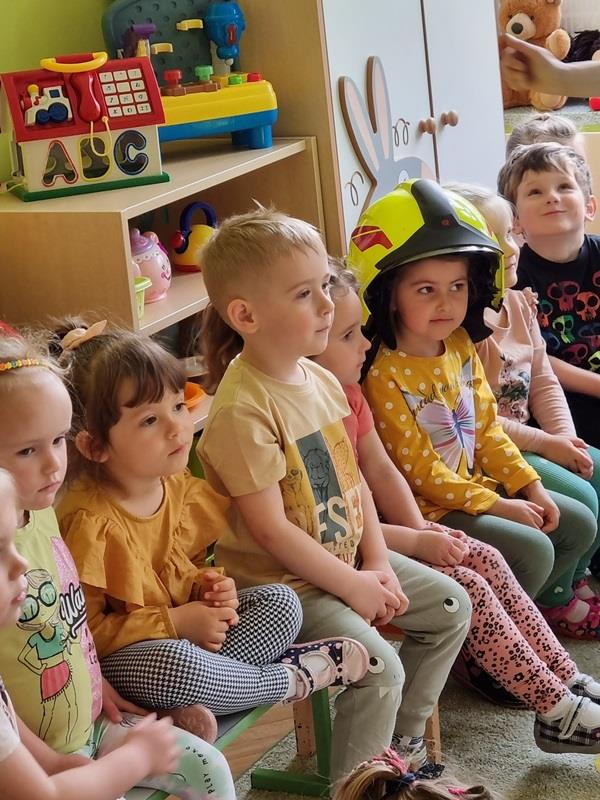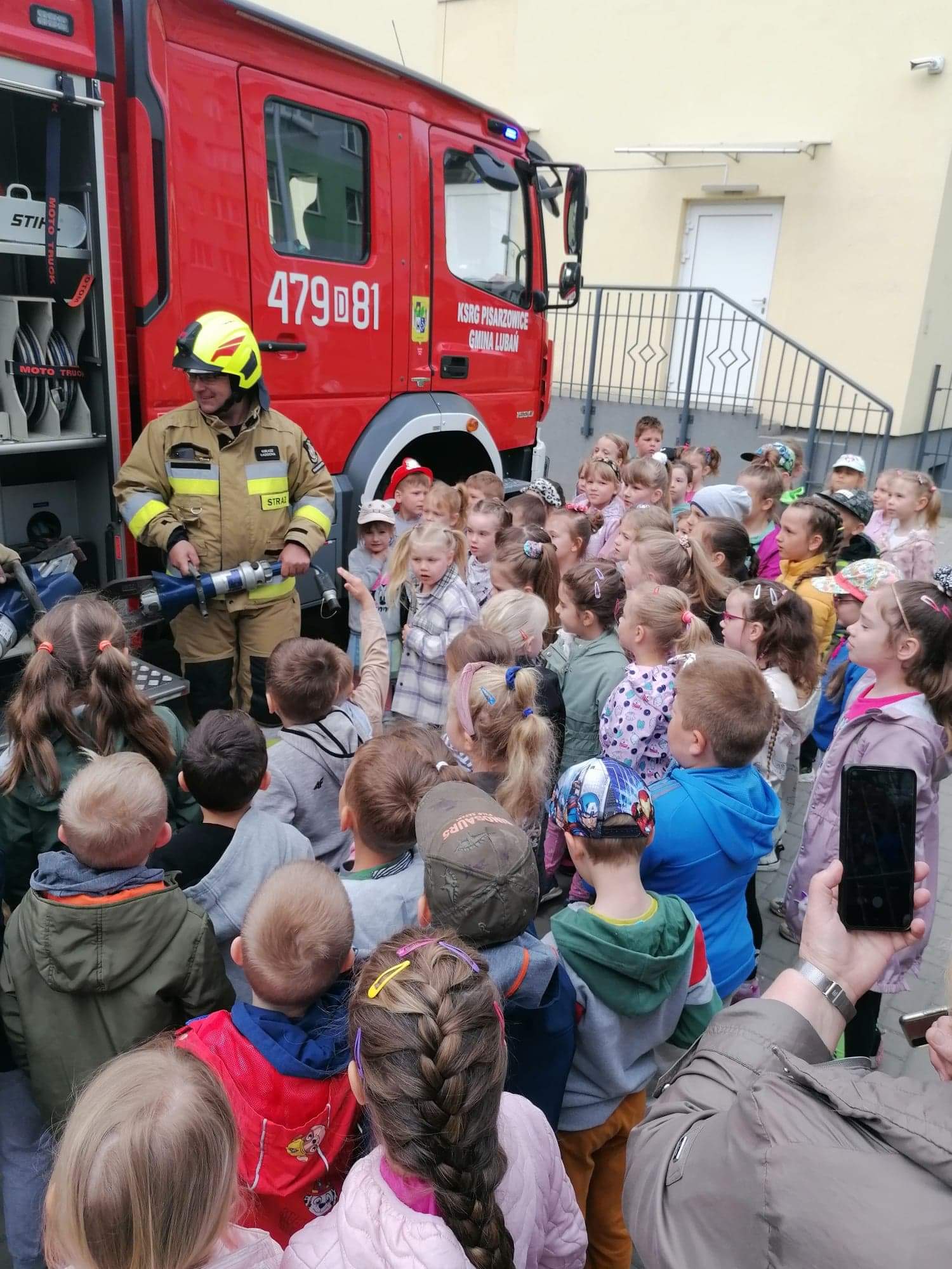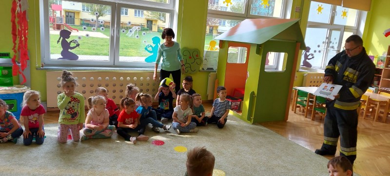 Prezentowano strój i podręczny sprzęt strażacki. W trakcie spotkania dzieci dowiedziały się, że praca strażaka nie polega tylko na gaszeniu pożarów, ale również na udzielaniu pomocy podczas wypadków samochodowych oraz w asyście podczas różnych akcji. Zaproszeni goście zapoznali przedszkolaków z sytuacjami, w których należy wezwać straż pożarną i korzystania z numeru 112. Można było z bliska podziwiać wóz strażacki, oraz jego wyposażenie wykorzystywane podczas akcji. Dzieci przymierzały hełm strażacki, trzymały wąż strażacki i wchodziły do wozu. Wizyta strazaków utrwaliła wiedzę dzieci w zakresie bezpieczeństwa.