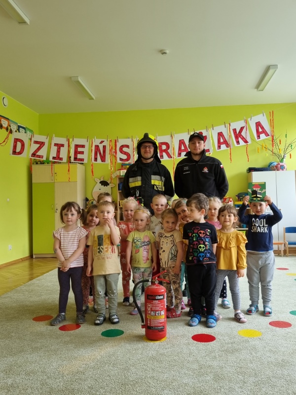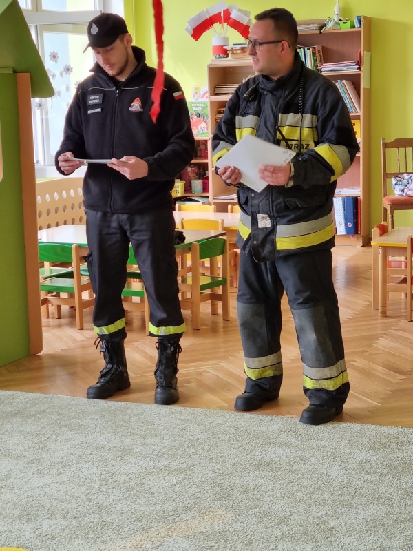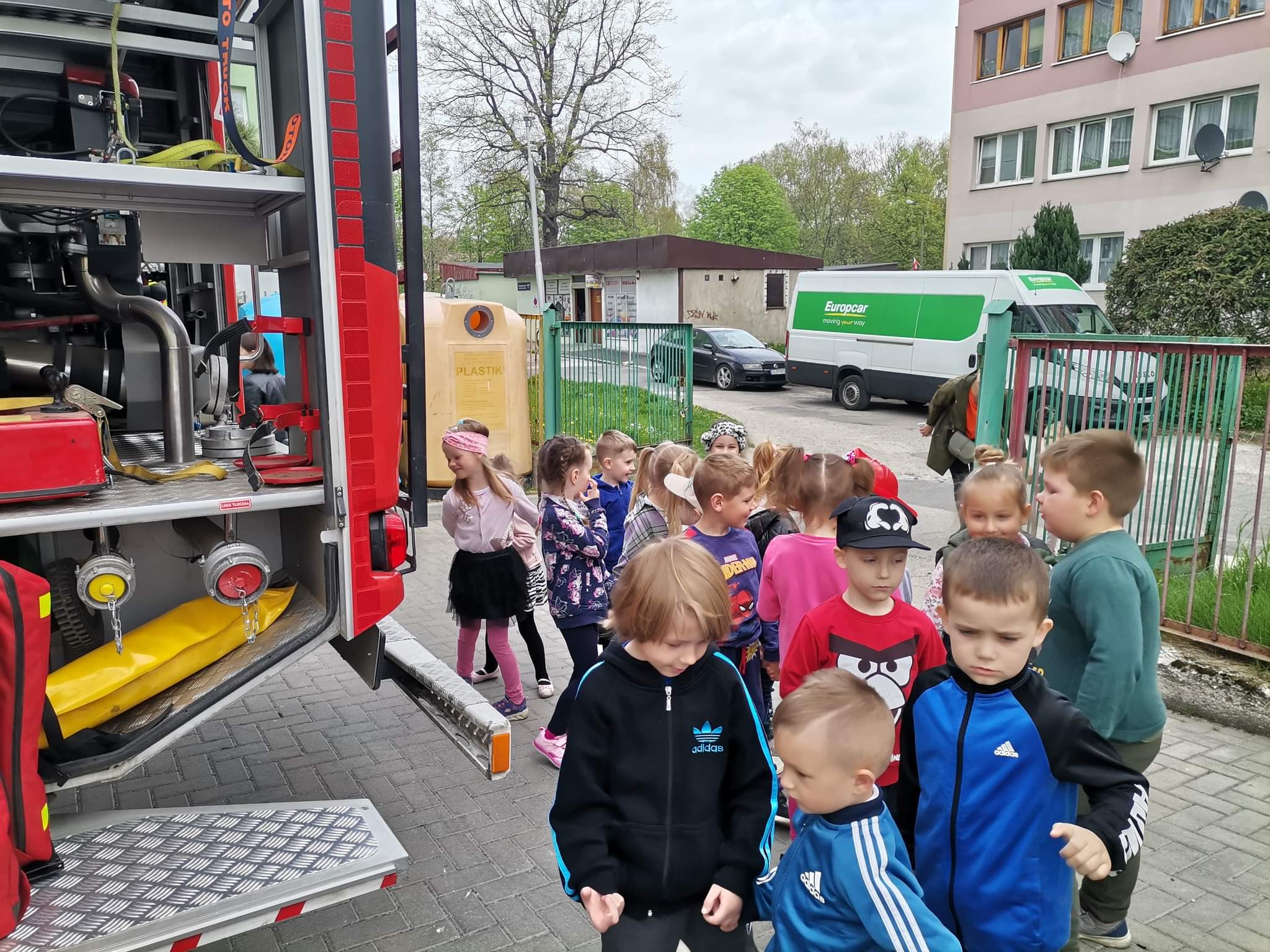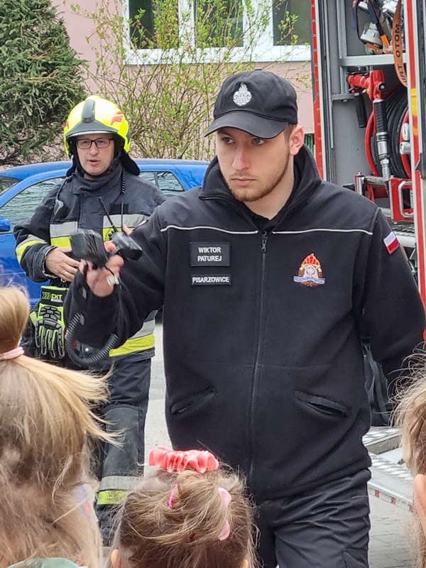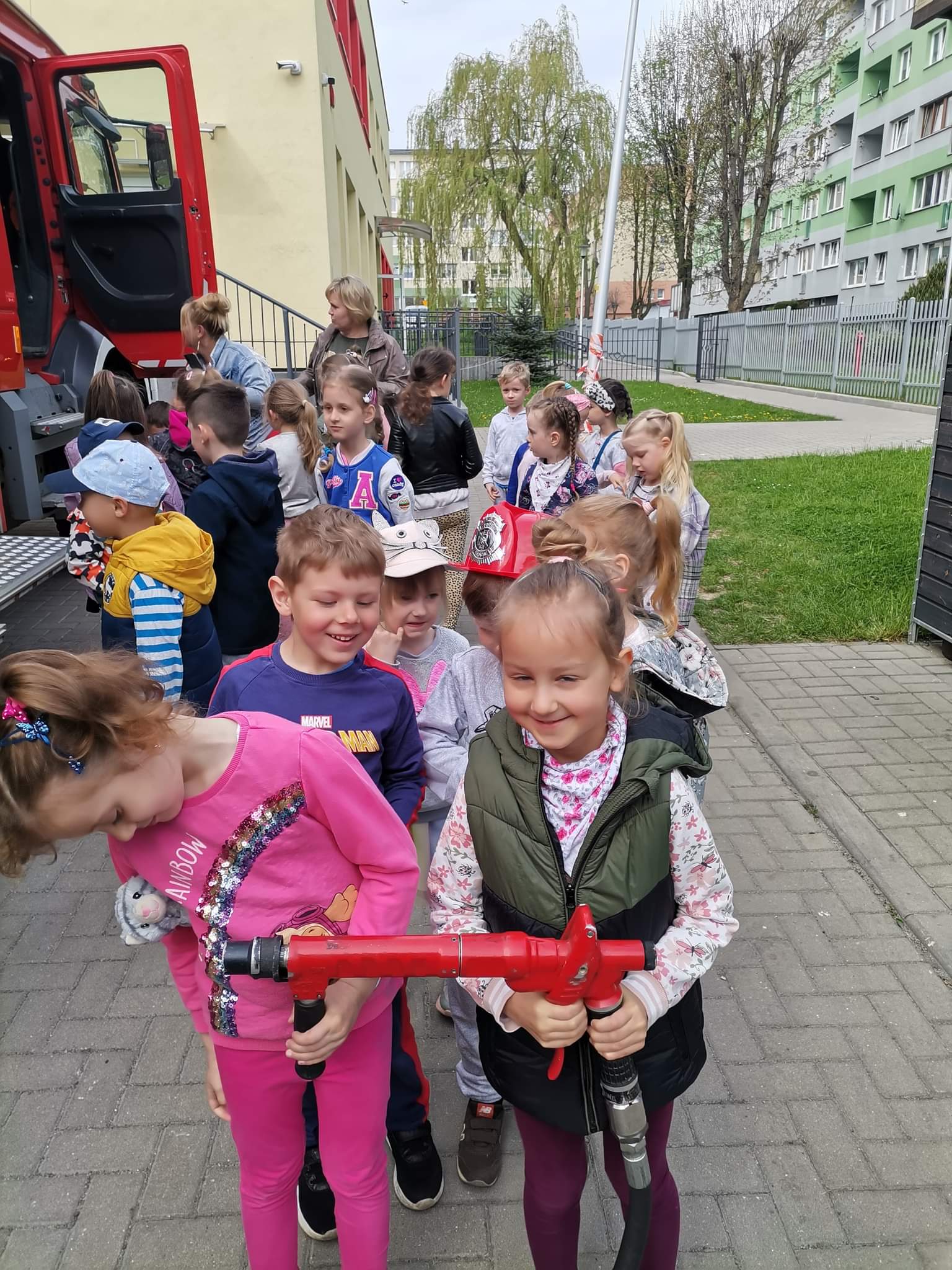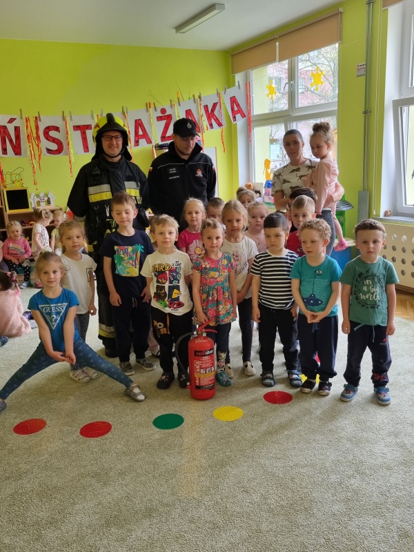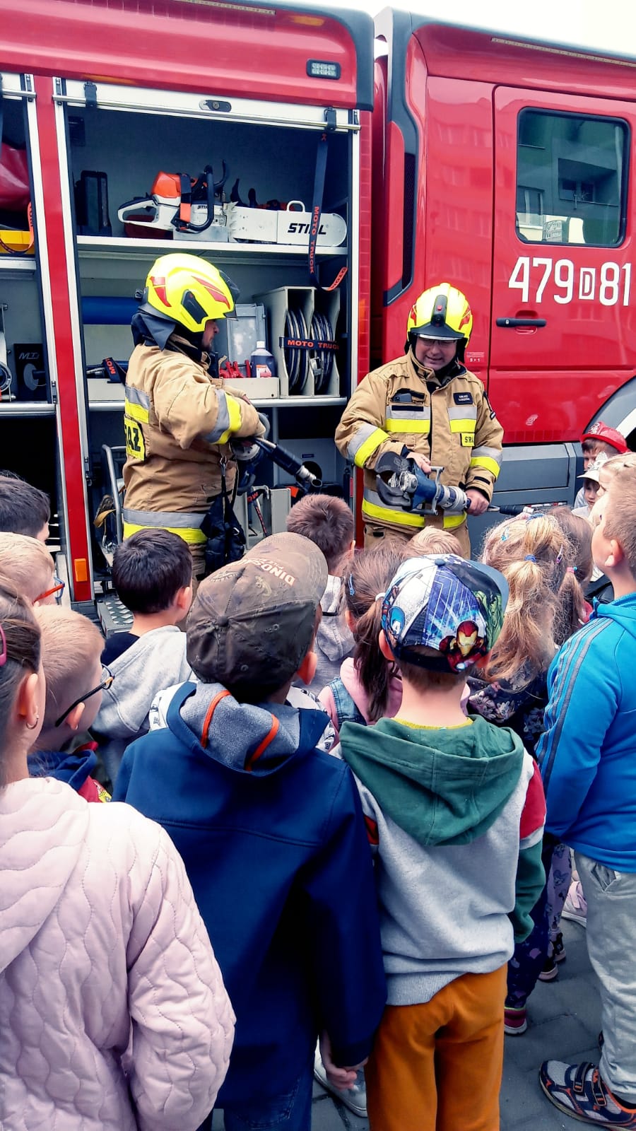 Prezentowano strój i podręczny sprzęt strażacki. W trakcie spotkania dzieci dowiedziały się, że praca strażaka nie polega tylko na gaszeniu pożarów, ale również na udzielaniu pomocy podczas wypadków samochodowych oraz w asyście podczas różnych akcji. Zaproszeni goście zapoznali przedszkolaków z sytuacjami, w których należy wezwać straż pożarną i korzystania z numeru 112. Można było z bliska podziwiać wóz strażacki, oraz jego wyposażenie wykorzystywane podczas akcji. Dzieci przymierzały hełm strażacki, trzymały wąż strażacki i wchodziły do wozu. Wizyta strazaków utrwaliła wiedzę dzieci w zakresie bezpieczeństwa.