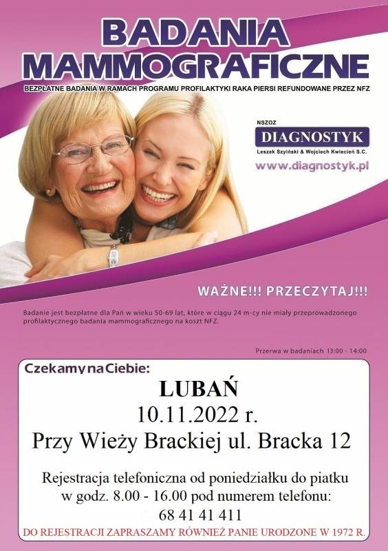 10 listopada 2022 r. przy Wieży Brackiej w Lubaniu przeprowadzane będą bezpłatne badania mammograficzne dla kobiet w wieku od 50 do 69 lat, które w ciągu ostatnich dwóch lat nie miały wykonywanych tego typu badań. Bardzo zależy nam na tym aby dotrzeć do mieszkanek urodzonych w latach: 1968 r. - 1972 r. - te Panie mogą również wykonać badanie w ramach Populacyjnego Programu Wczesnego Wykrywania Raka Piersi a bardzo często nawet o tym nie wiedzą.