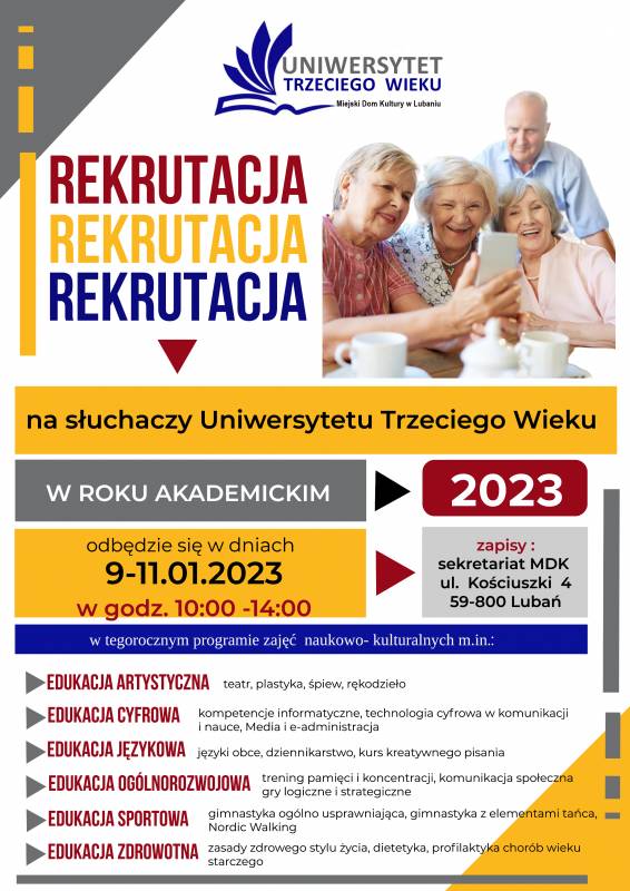 Rekrutacja na słuchaczy Uniwersytetu Trzeciego Wieku przy MDK w Lubaniu na rok 2023 odbywać się będzie w dniach 9 – 11 stycznia 2023 r w godz. 10.00 – 14.00 osobiście w sekretariacie MDK.