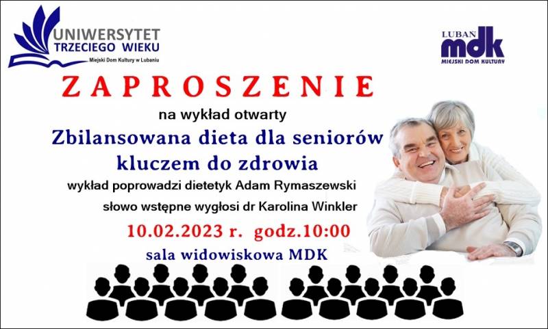 odbędzie się wykład otwarty p.n. "Zbilansowana dieta dla seniorów kluczem do zdrowia", który poprowadzi dietetyk Adam Rymaszewski. Słowo wstępne wygłosi wykładowca Uniwersytetu Trzeciego Wieku dr Karolina Winkler.